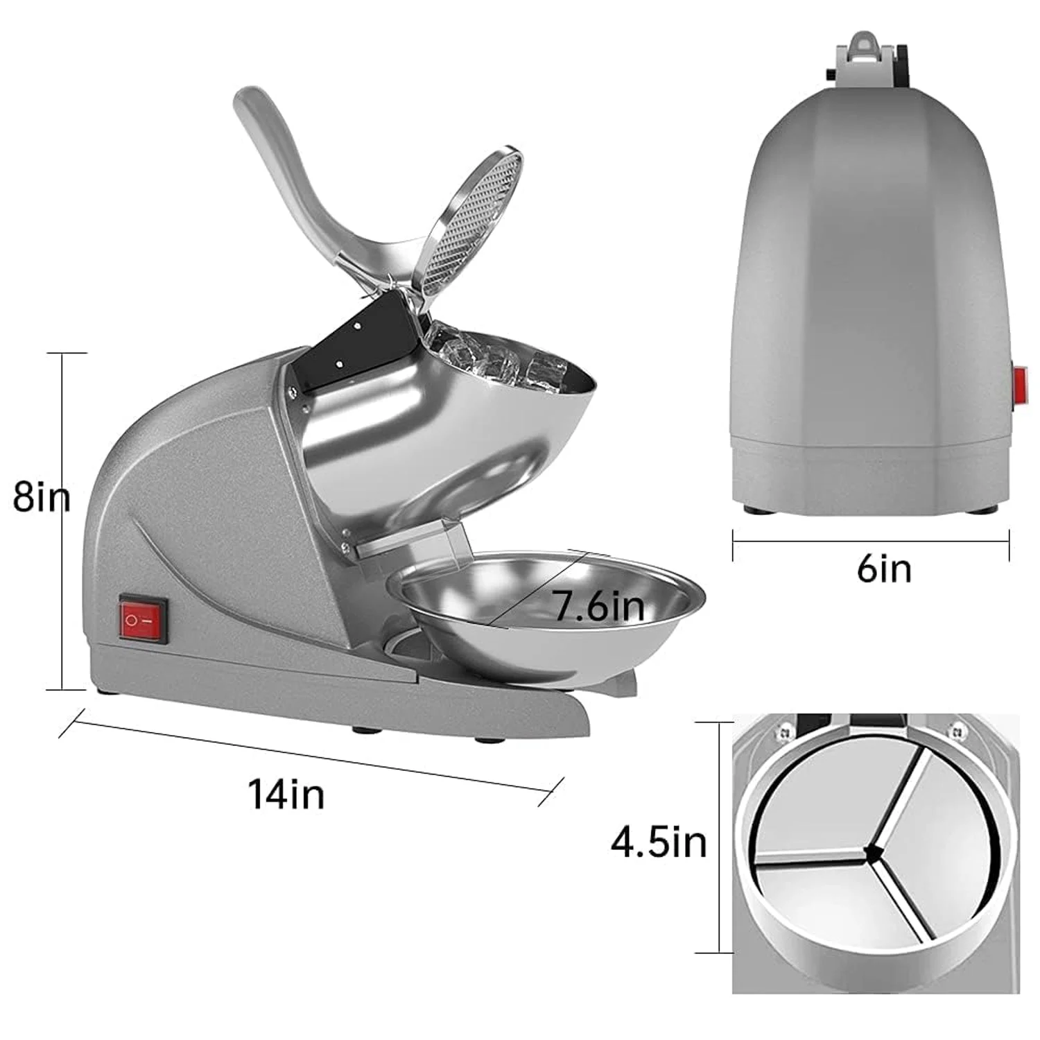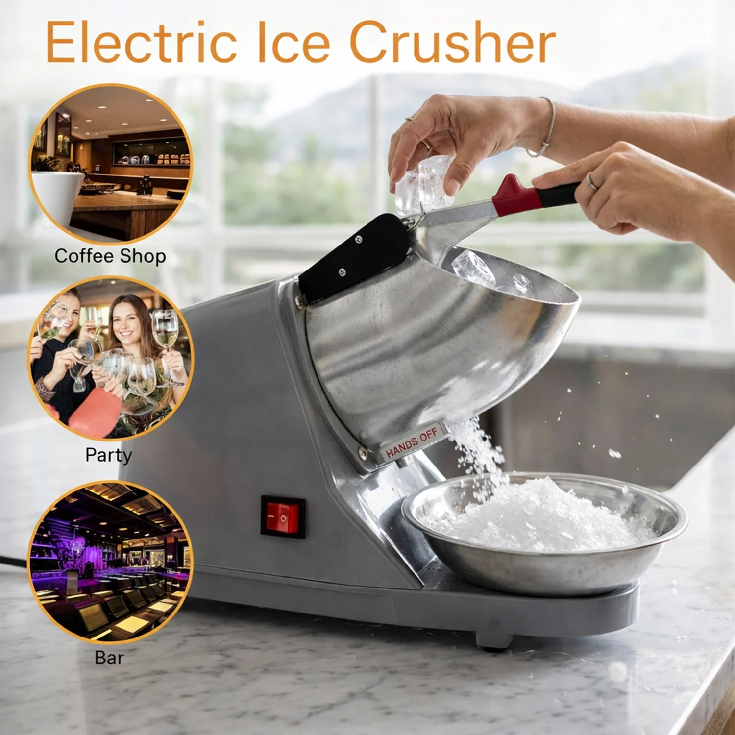 electric ice crushing machine with stainless steel bowl, heavy duty ice crusher shaver, commercial kitchen ice grinding machine, fast ice crushing machine for drinks, juice cocktail smoothie ice shaver, durable stainless steel ice crusher, professional ice grinder for beverages, high power ice crushing equipment, countertop ice crusher for home and business, multi purpose ice shaver machine, easy clean electric ice crusher, large capacity ice grinding machine