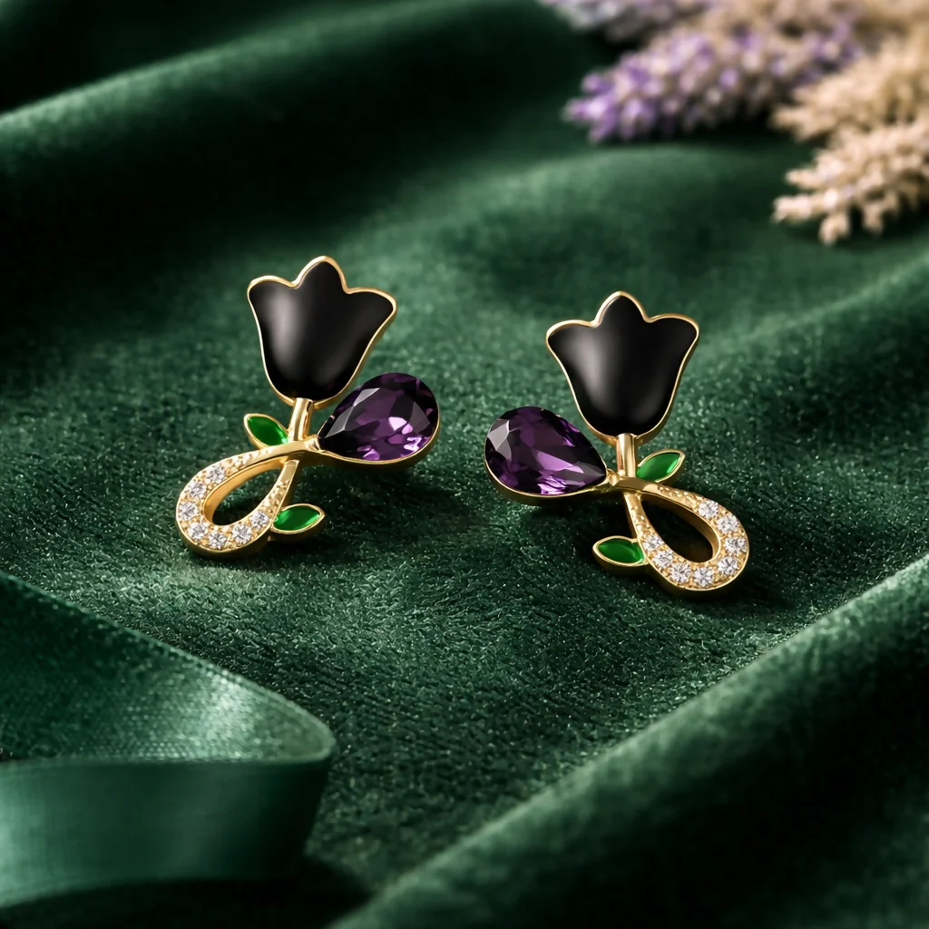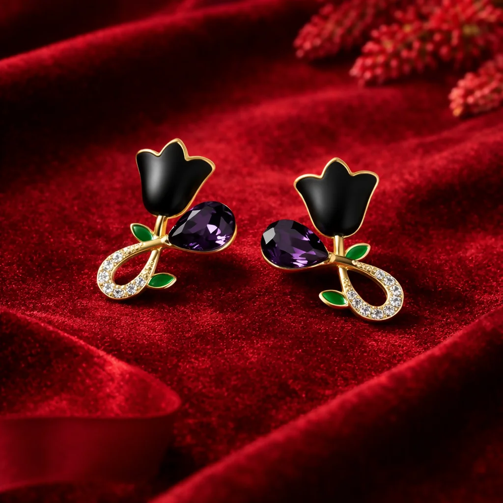 Be the first to review Elegant Black Floral Stud Earrings for Women | Gold Plated Crystal Drop Design!