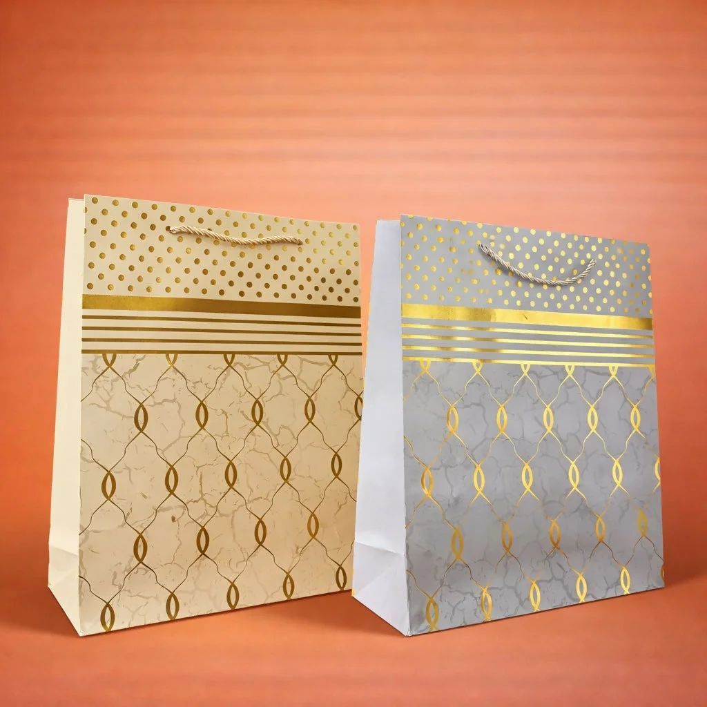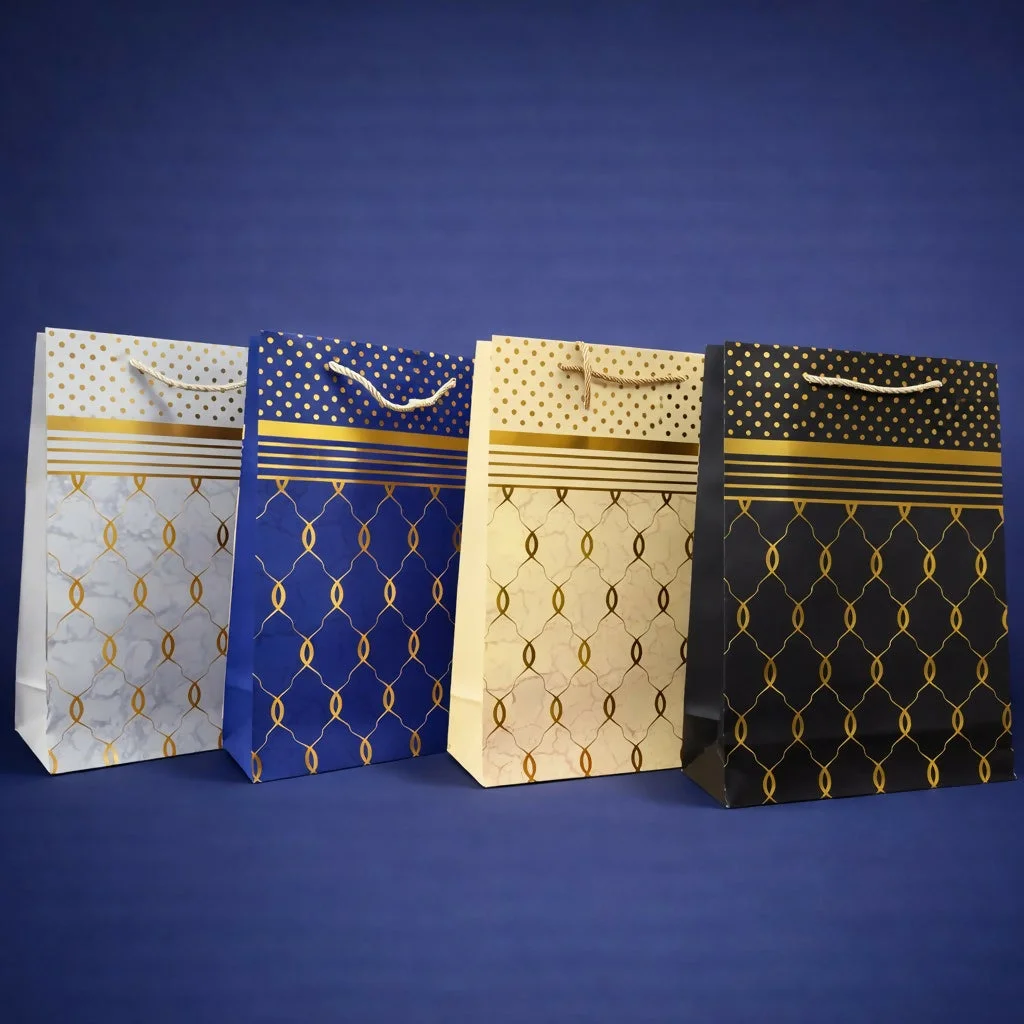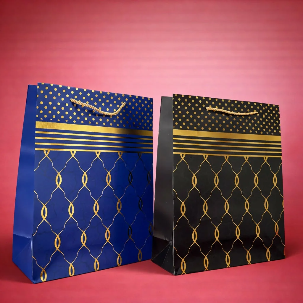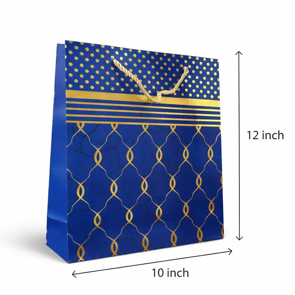 Present your gifts in style with this elegant blue and gold design paper bag. Featuring a premium pattern with golden accents and a rich finish, this bag adds a luxurious touch to any occasion. Made from durable paper with sturdy rope handles, it ensures safe and convenient carrying. Perfect for birthdays, festive occasions, and special events, this bag enhances your gift presentation effortlessly. Comes as a single piece for versatile use.
