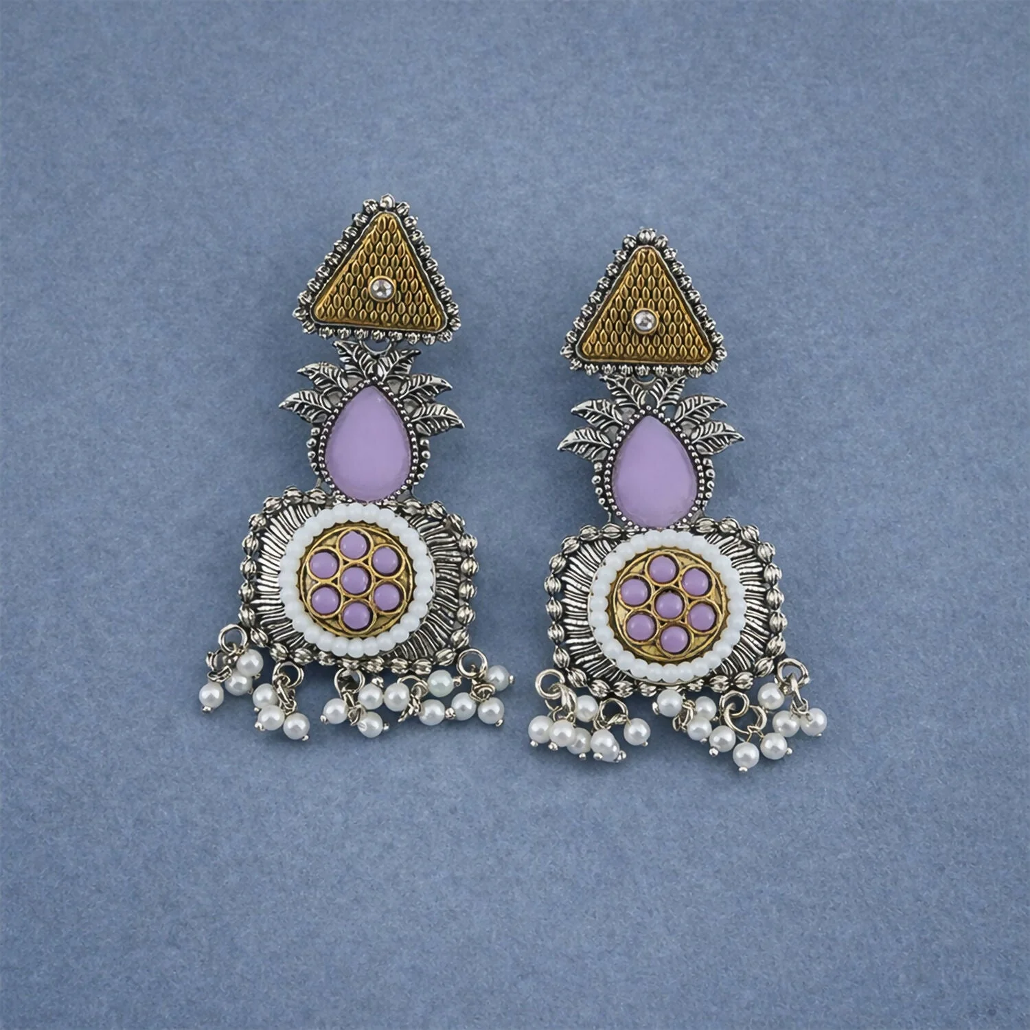 Be the first to review Elegant Blush Pink & Pearl Embellished Statement Drop Earrings with Antique Silver Finish and Intricate Floral Filigree Design!