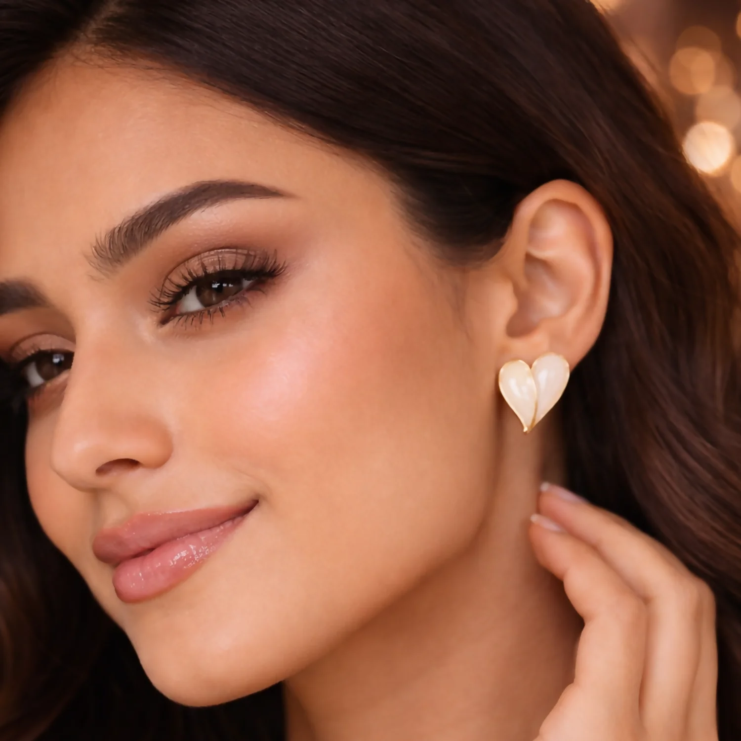 Add a touch of timeless elegance to your jewelry collection with these beautifully designed cream glossy leaf stud earrings. Crafted with a smooth, polished finish and highlighted by a premium gold-toned outline, these earrings bring a perfect balance of sophistication and modern style. The soft cream tone paired with the sleek leaf-inspired design creates a graceful and luxurious look that enhances any outfit effortlessly.