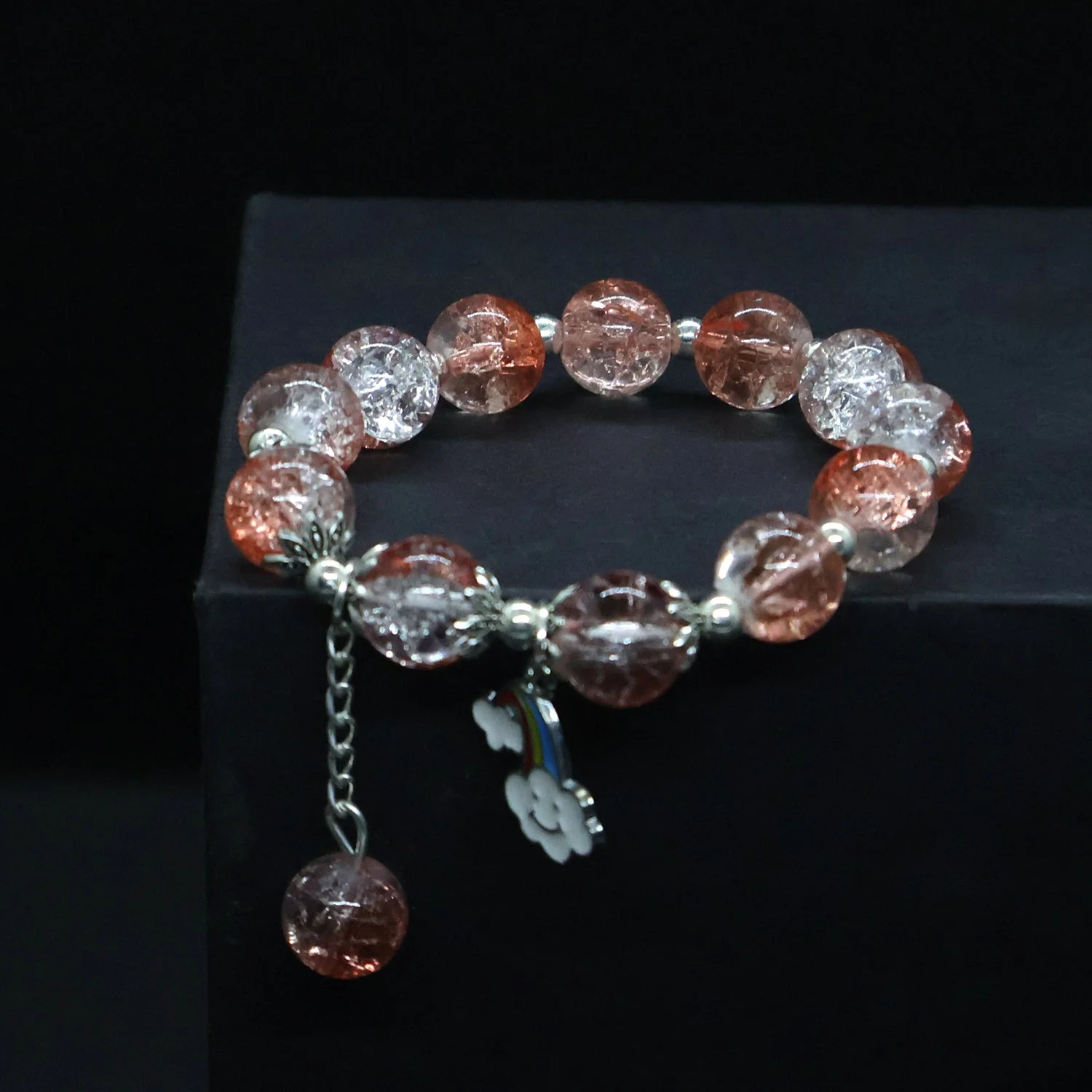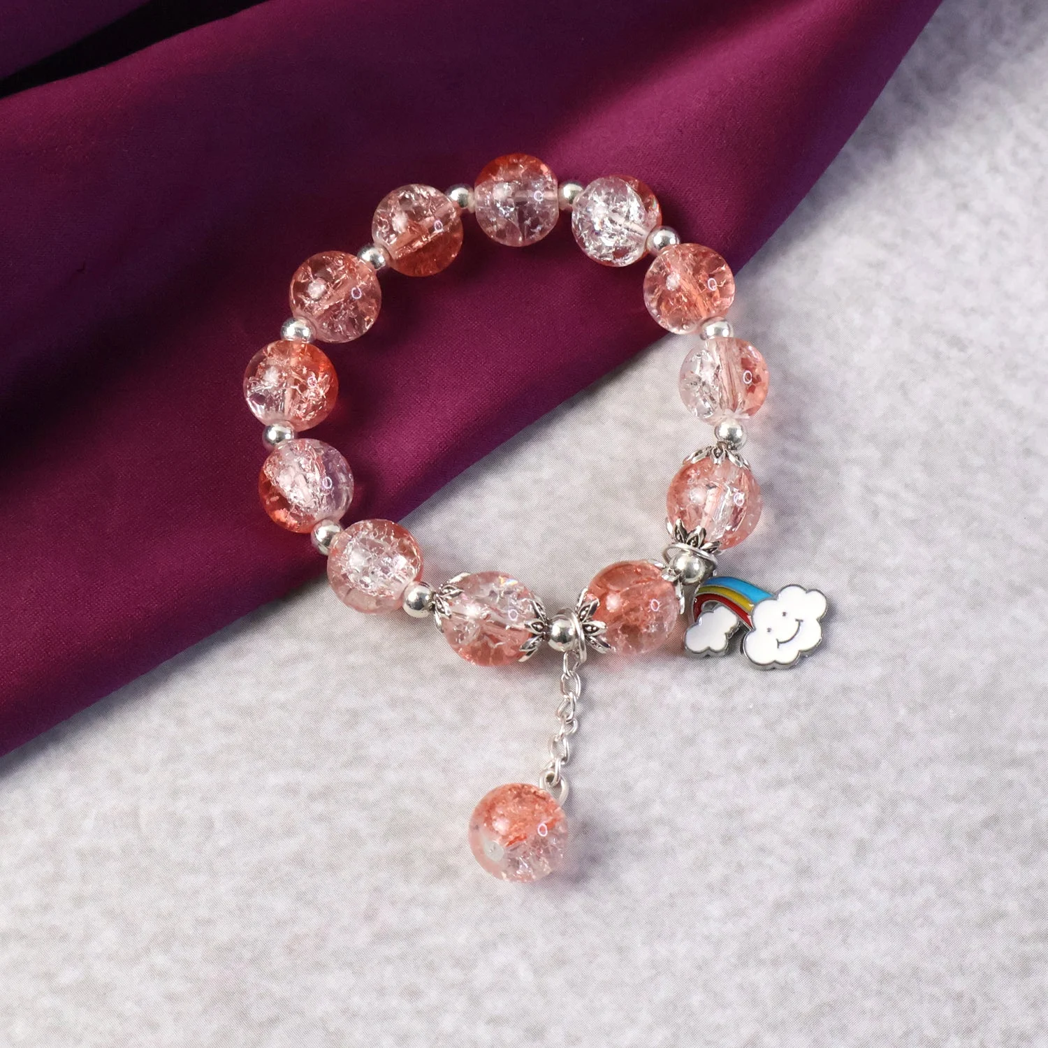 This beautifully crafted bracelet features a striking combination of glossy beads and crackled crystal beads, creating a sophisticated contrast that elevates any look. The bracelet is fully stretchable, offering a comfortable fit for most wrist sizes without the hassle of clasps. A charming cloud-and-rainbow enamel pendant along with a delicate bead dangler adds a playful yet elegant touch, making it perfect for both casual and festive occasions. Designed to complement modern fashion trends, this accessory enhances your everyday style and also works wonderfully as a thoughtful gift. Its lightweight feel ensures long wear without discomfort, making it an ideal accessory for women and girls who love expressive jewelry.