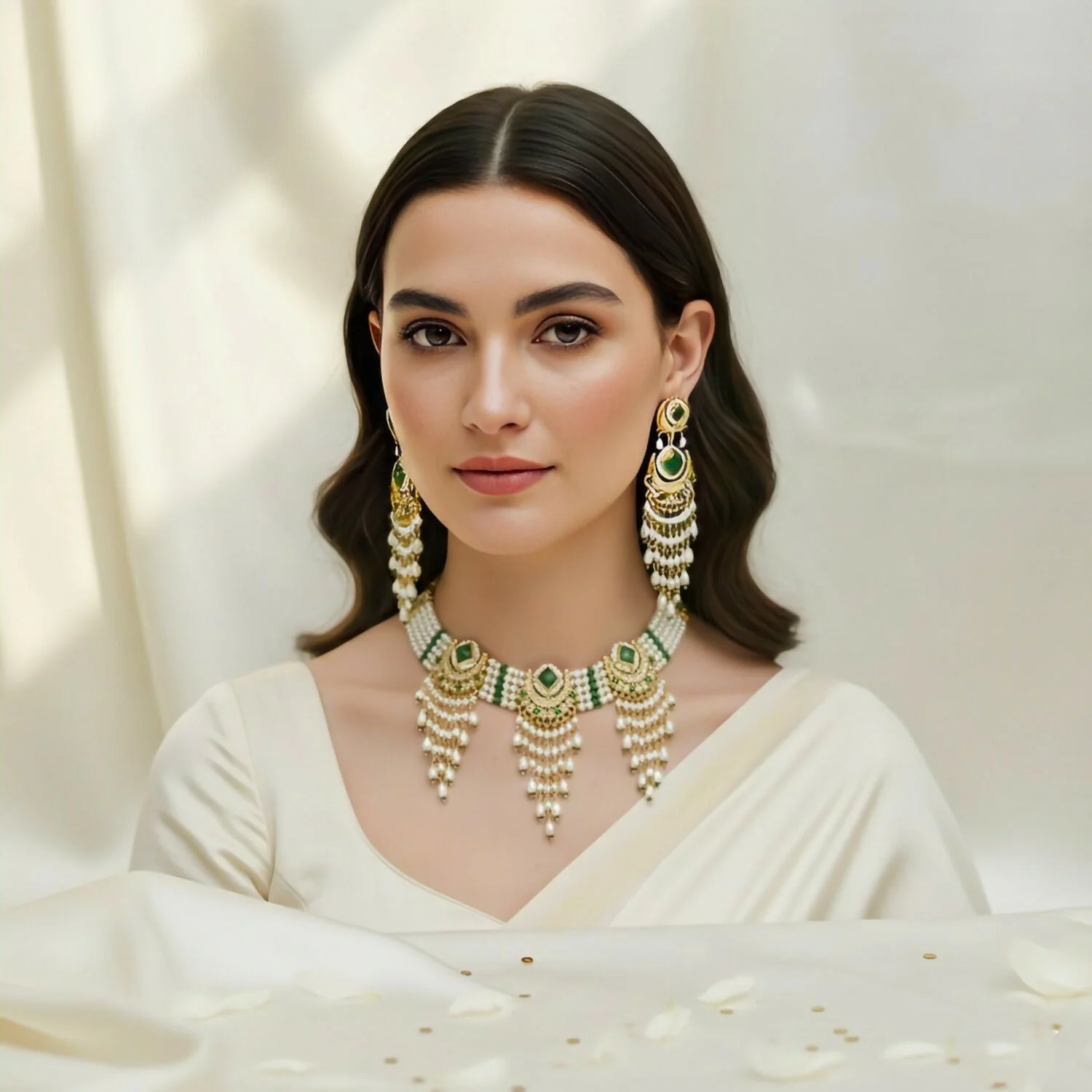 Be the first to review Elegant Emerald & Pearl Choker Necklace Set with Chandbali Jhumka Earrings!