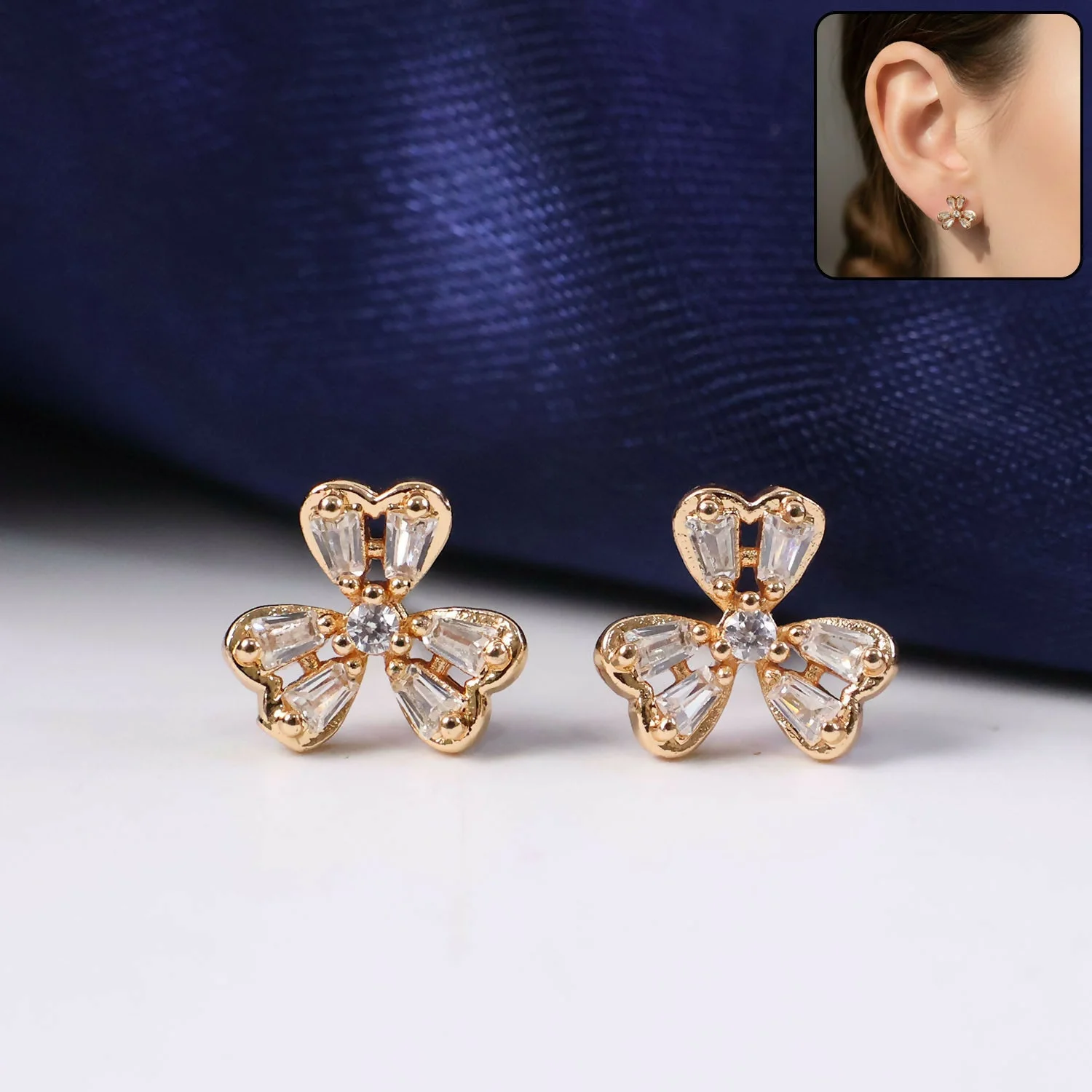 These elegant floral stud earrings feature a delicate four-petal design highlighted with sparkling CZ stones at the center and along each petal. The refined gold-tone finish adds a graceful shine, making them perfect for both everyday wear and special occasions. Designed to sit comfortably on the ear, these studs offer a subtle yet eye-catching look that complements ethnic as well as western outfits. Their lightweight and minimal profile make them ideal for long hours of wear without discomfort. A timeless accessory choice for women who prefer classy, understated jewellery with a touch of sparkle.