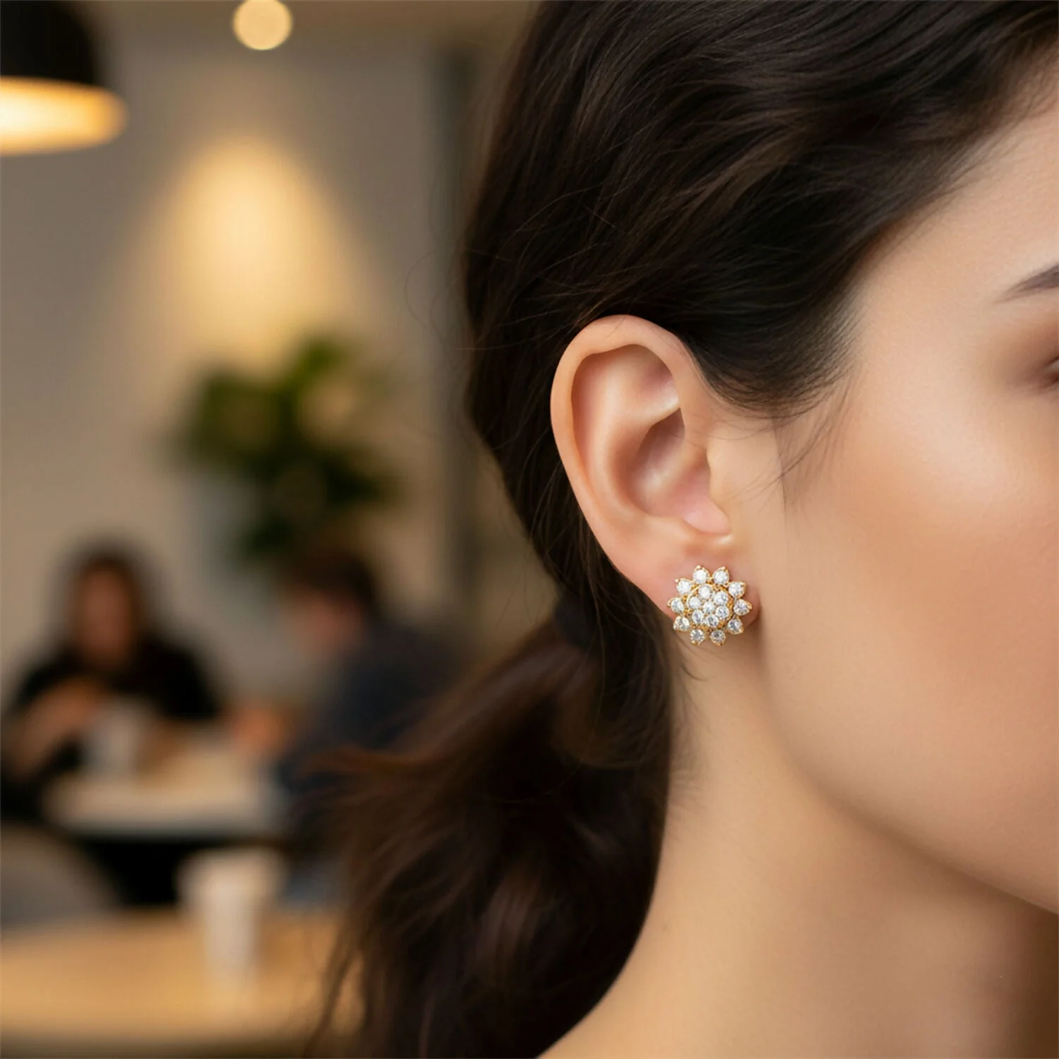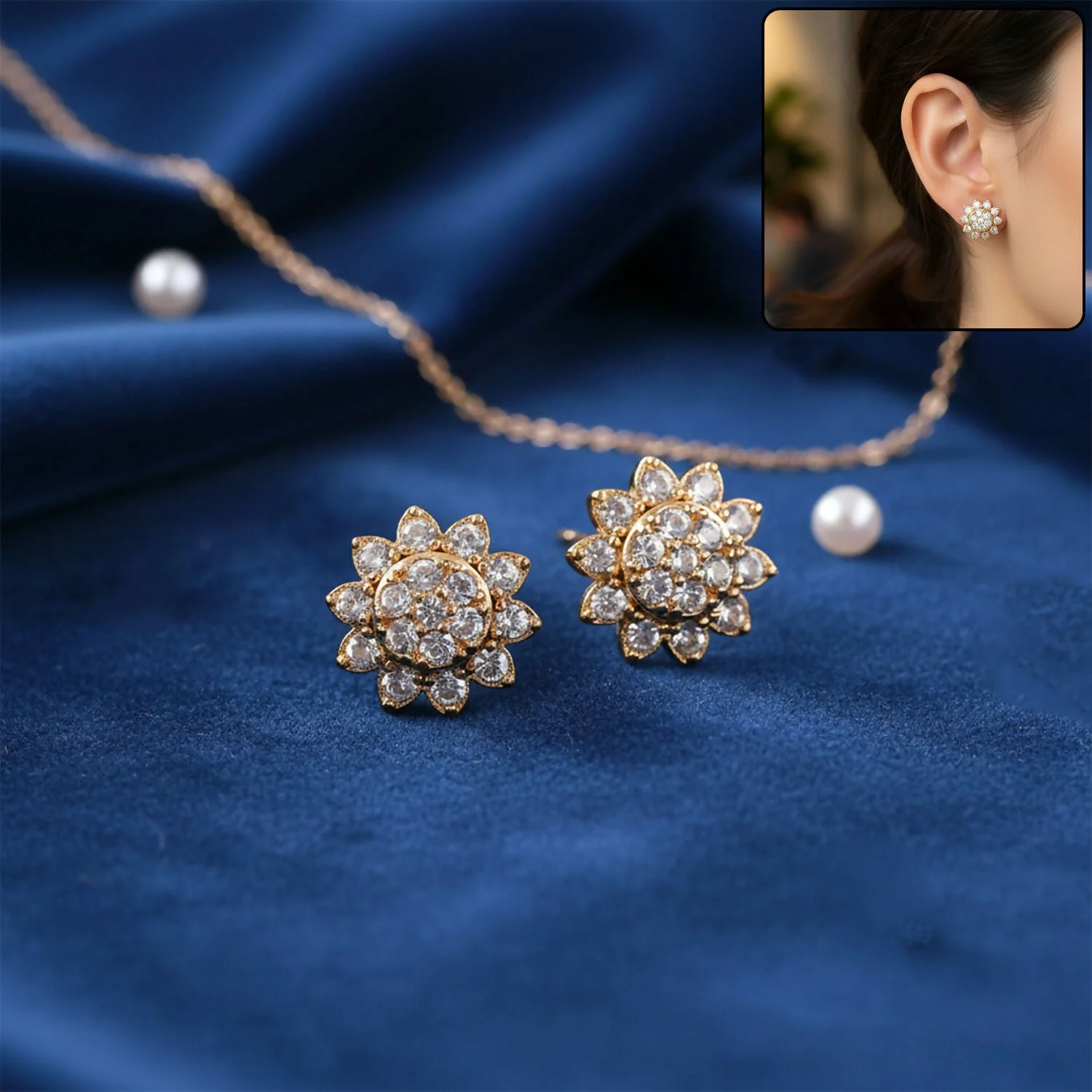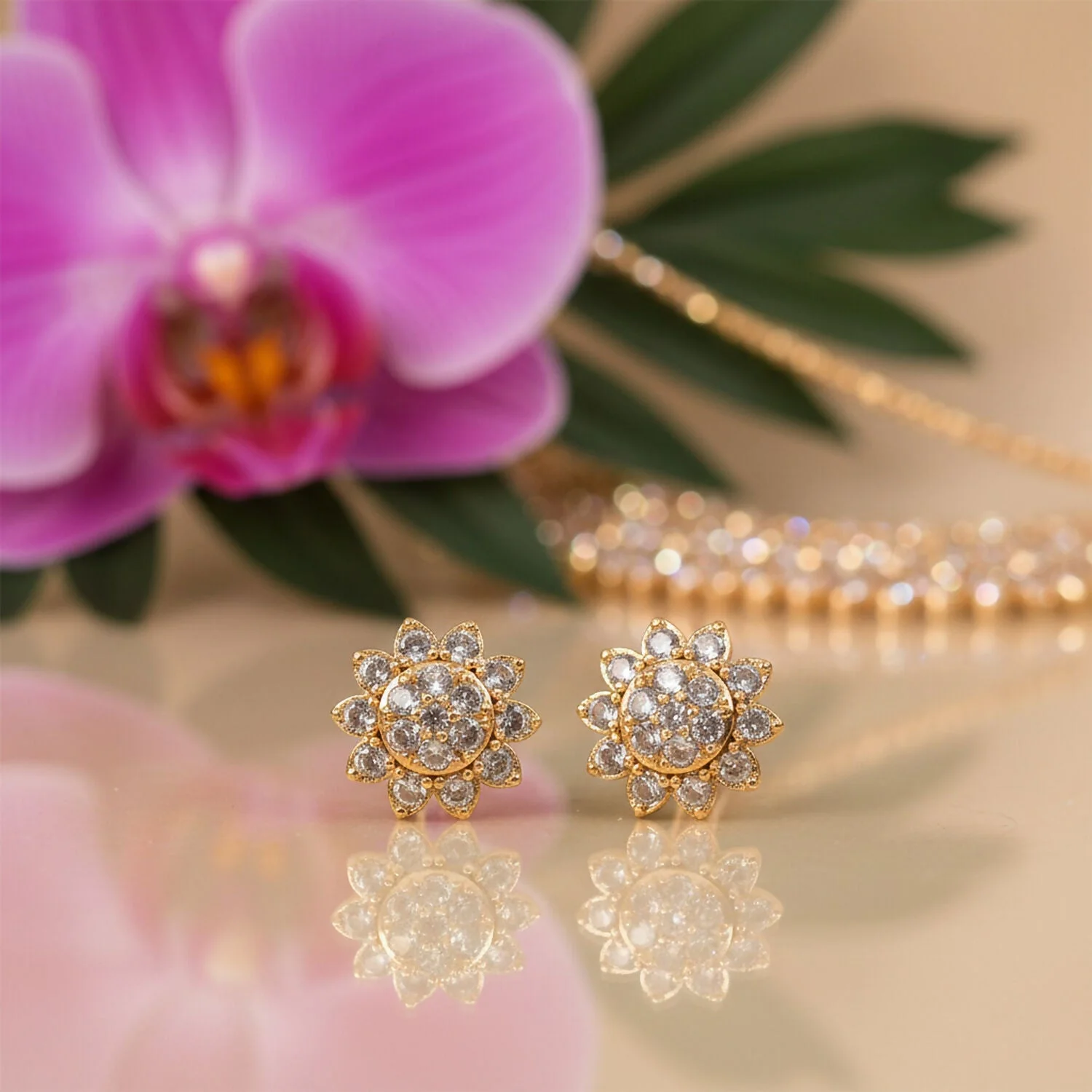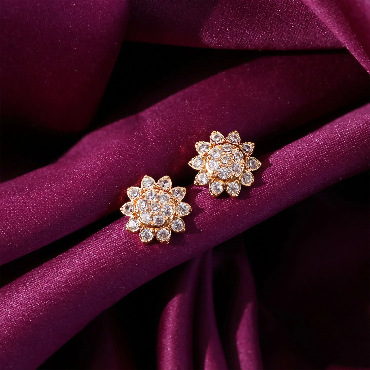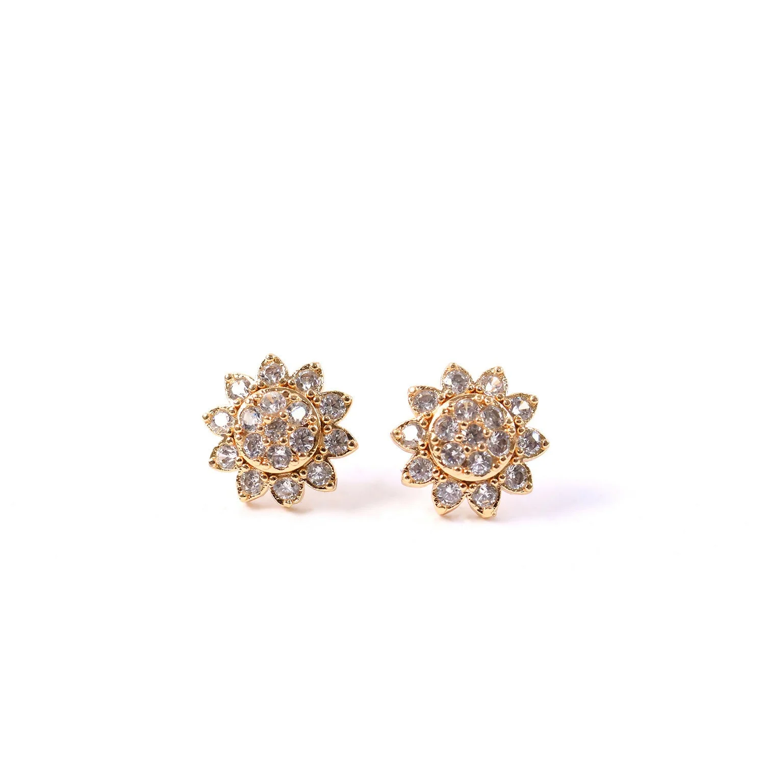 Add a touch of elegance to your look with these beautifully crafted floral stud earrings. Designed with sparkling CZ stones arranged in a delicate flower pattern, they offer a refined shine that enhances both everyday and special outfits. The gold tone finish gives a classy and timeless appeal, making them suitable for office wear, casual outings, and festive occasions. Lightweight and comfortable, these studs sit perfectly on the ears for long hours of wear. A versatile accessory that effortlessly complements ethnic and western styles alike.