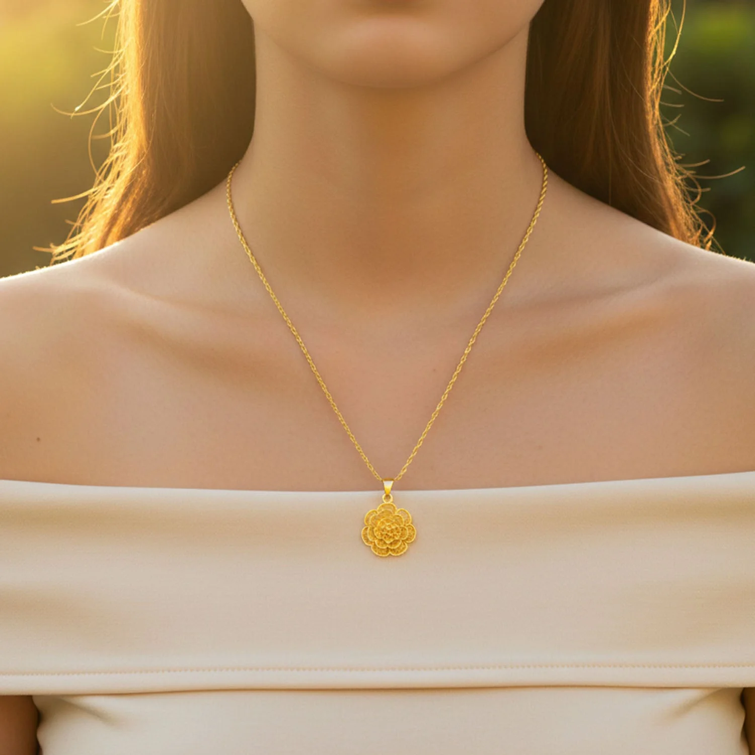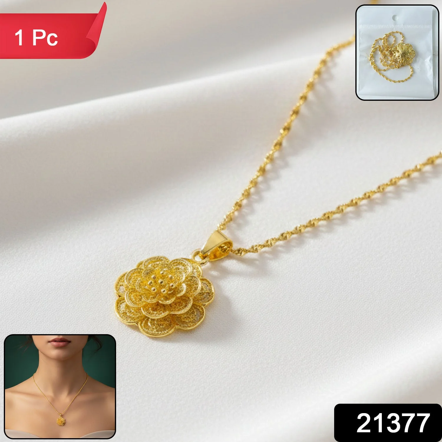 Enhance your jewellery collection with this Elegant Floral Design Gold Plated Pendant Necklace crafted to add charm and sophistication to any outfit. Featuring a beautifully detailed flower-shaped pendant with intricate layered petal work, this necklace offers a premium traditional yet modern look. The delicate matching chain complements the pendant perfectly, making it suitable for both ethnic and western attire. Its lightweight design ensures comfortable wear throughout the day without causing discomfort. Ideal for festive occasions, parties, weddings, and daily fashion styling, this pendant necklace is a timeless addition to every woman’s accessory collection.