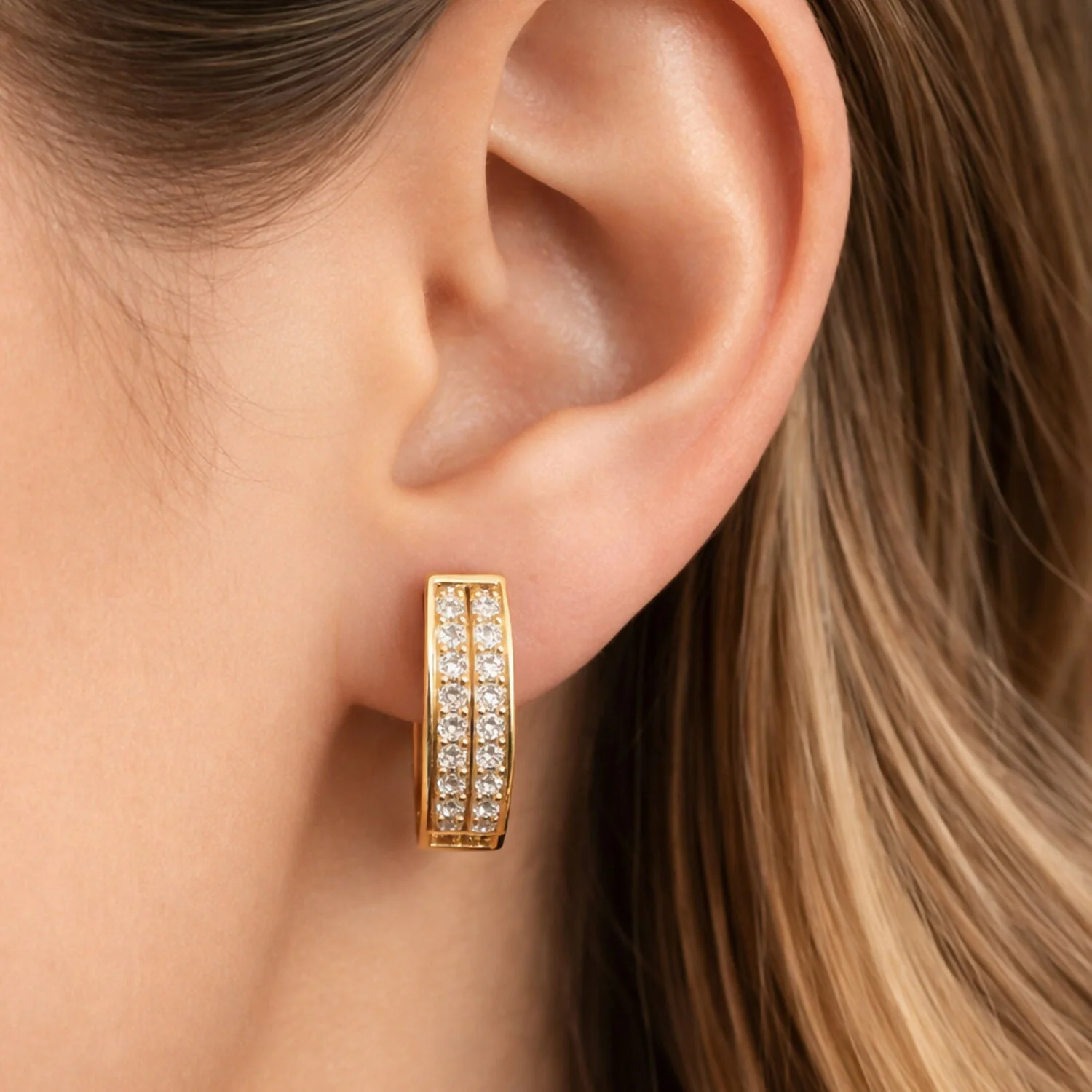 These elegant hoop earrings feature a sleek gold-tone finish with neatly set sparkling clear stones that add a refined shine. The compact hoop design offers a modern yet timeless look, making them suitable for both everyday wear and special occasions. Their smooth finish and balanced shine enhance any outfit without appearing heavy. Easy to wear and comfortable, these earrings pair beautifully with casual, office, and festive styles. A stylish addition to any jewellery collection or a thoughtful gifting option.