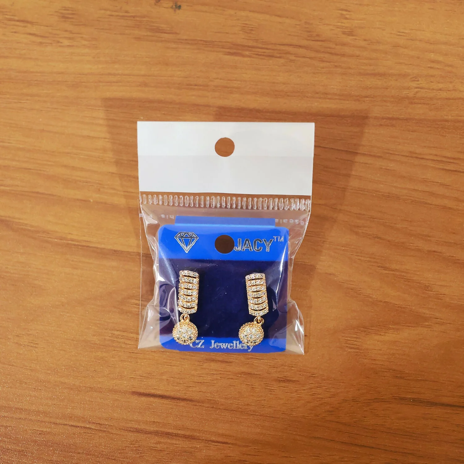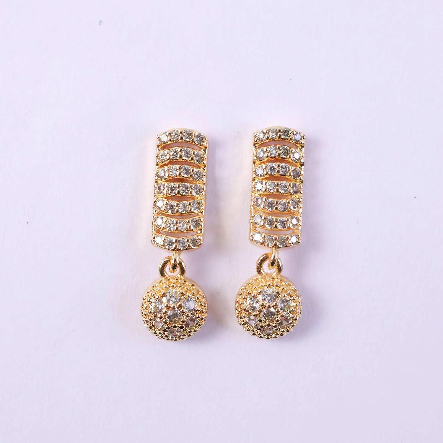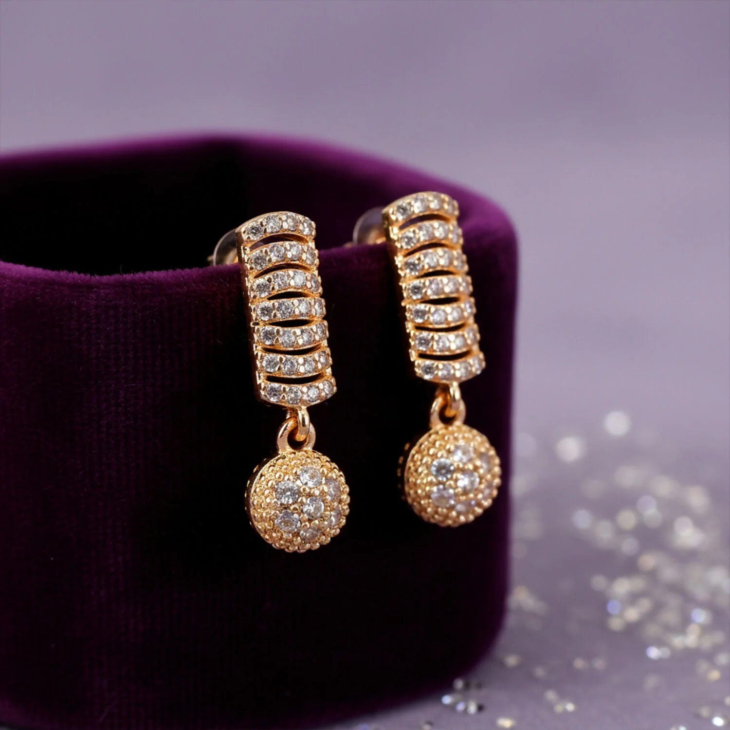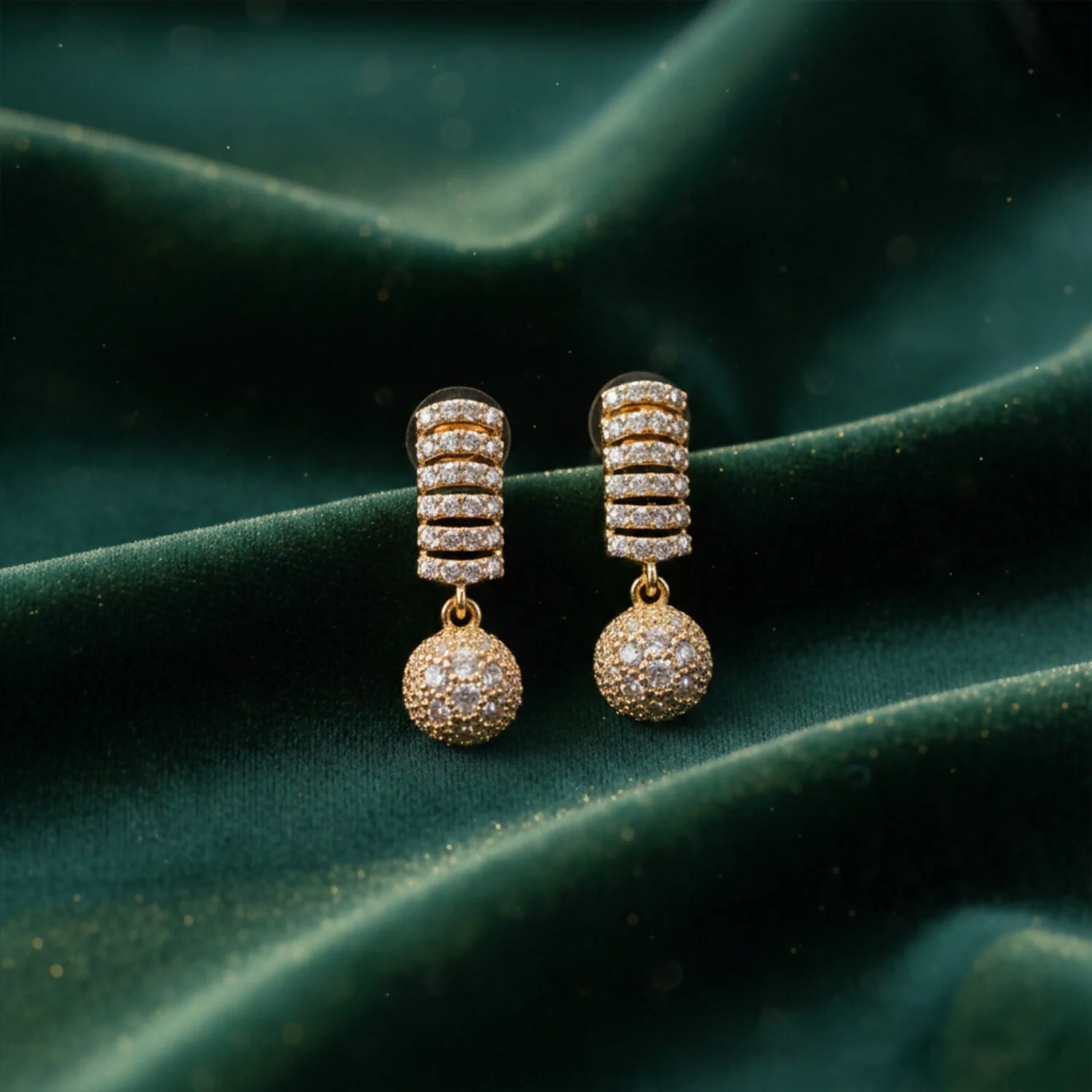 Yeh designer drop earrings classy aur elegant look dete hain. Upar stacked CZ stones ka stylish pattern hai aur neeche delicate hanging ball design diya gaya hai, jo movement ke saath beautiful shine deta hai. Light weight feel ke saath yeh earrings party, festive functions aur special occasions ke liye perfect choice hain. Traditional aur western outfits dono ke saath easily match ho jaate hain, jo overall look ko aur graceful bana dete hain.