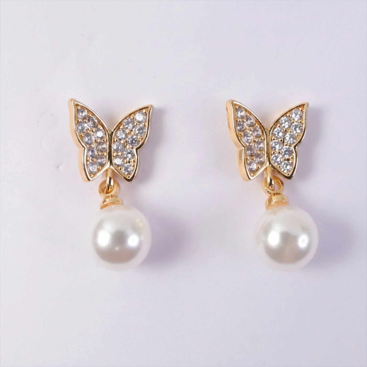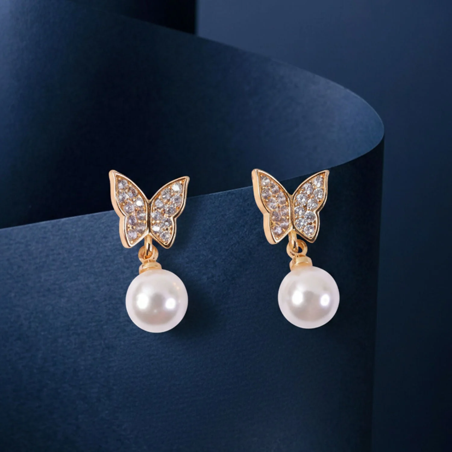 Ye elegant butterfly design earrings ek classy aur feminine look dete hain. Upar butterfly shape me shining CZ stones lage hue hain jo light me soft sparkle dete hain, aur niche smooth pearl drop design hai jo overall look ko aur graceful banata hai. Daily wear se leke party, festive aur gifting purpose ke liye ye earrings perfect choice hain. Lightweight design hone ki wajah se kaan par comfortable lagte hain aur long time tak pehne ja sakte hain. Simple outfits ke saath bhi ye earrings easily standout karte hain aur ethnic ya western dono styles ke saath suit karte hain.