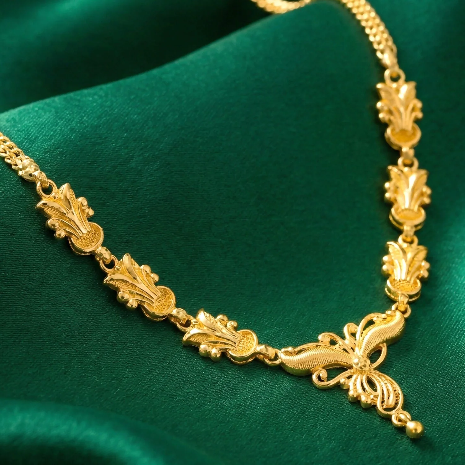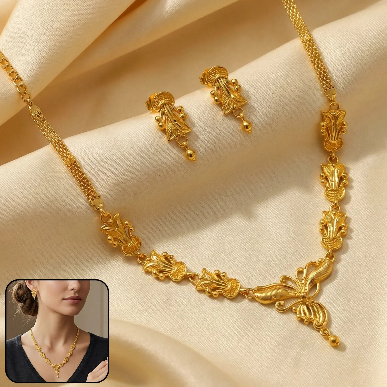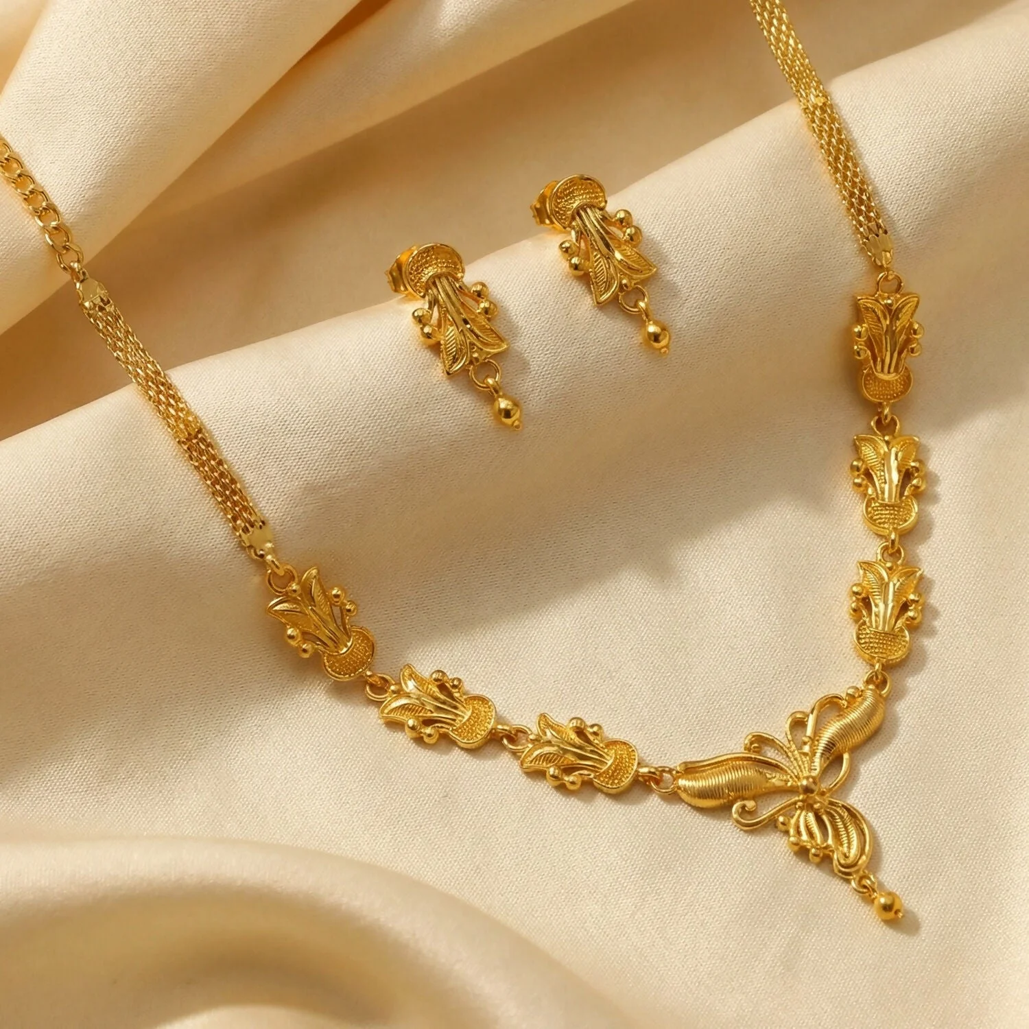 This jewelry set reflects classic craftsmanship with a traditional aesthetic, likely inspired by heritage designs. The warm lighting enhances the gold’s luster, while the soft fabric background adds a sense of luxury and sophistication. The combination of floral motifs, symmetrical patterns, and fine detailing makes the set elegant, graceful, and timeless.