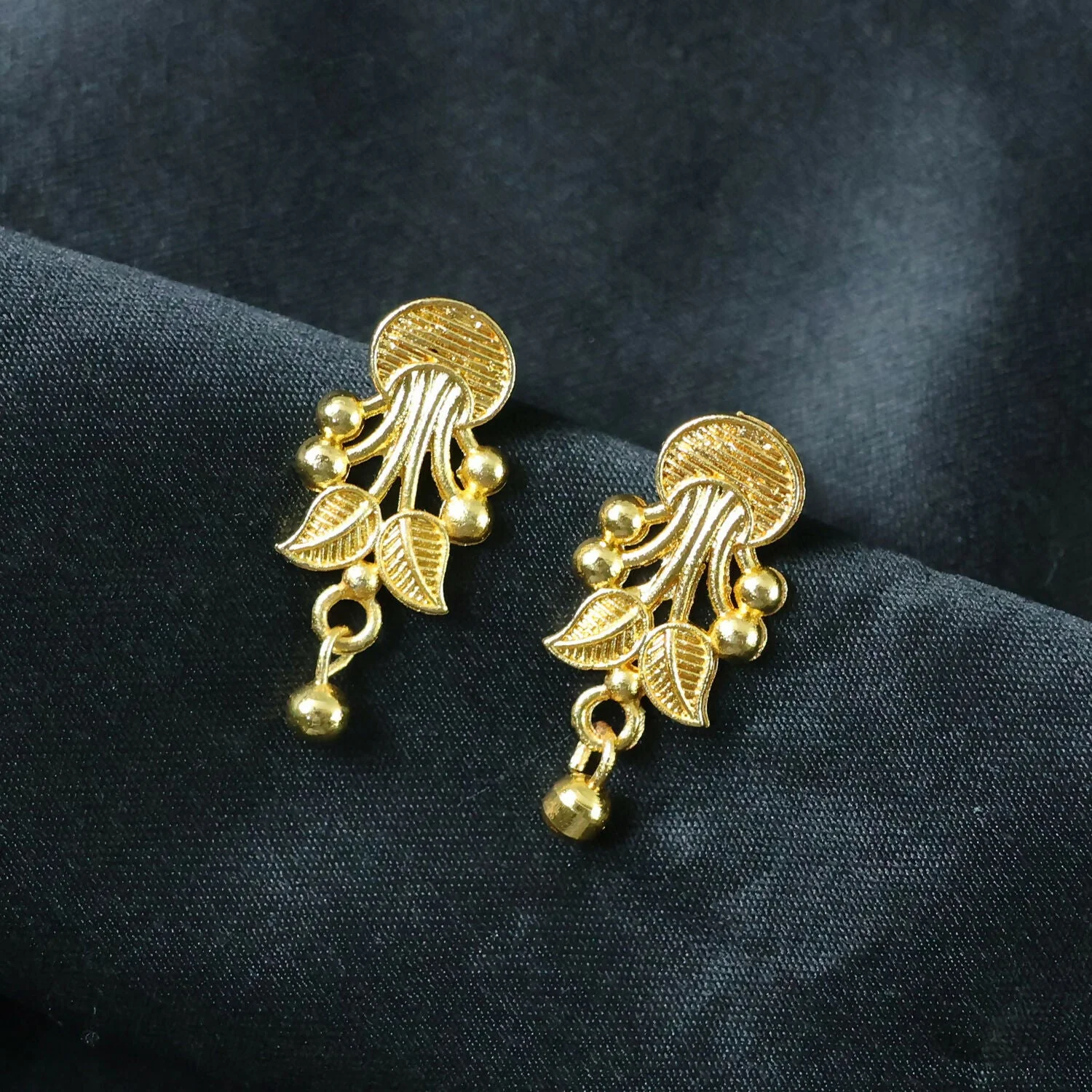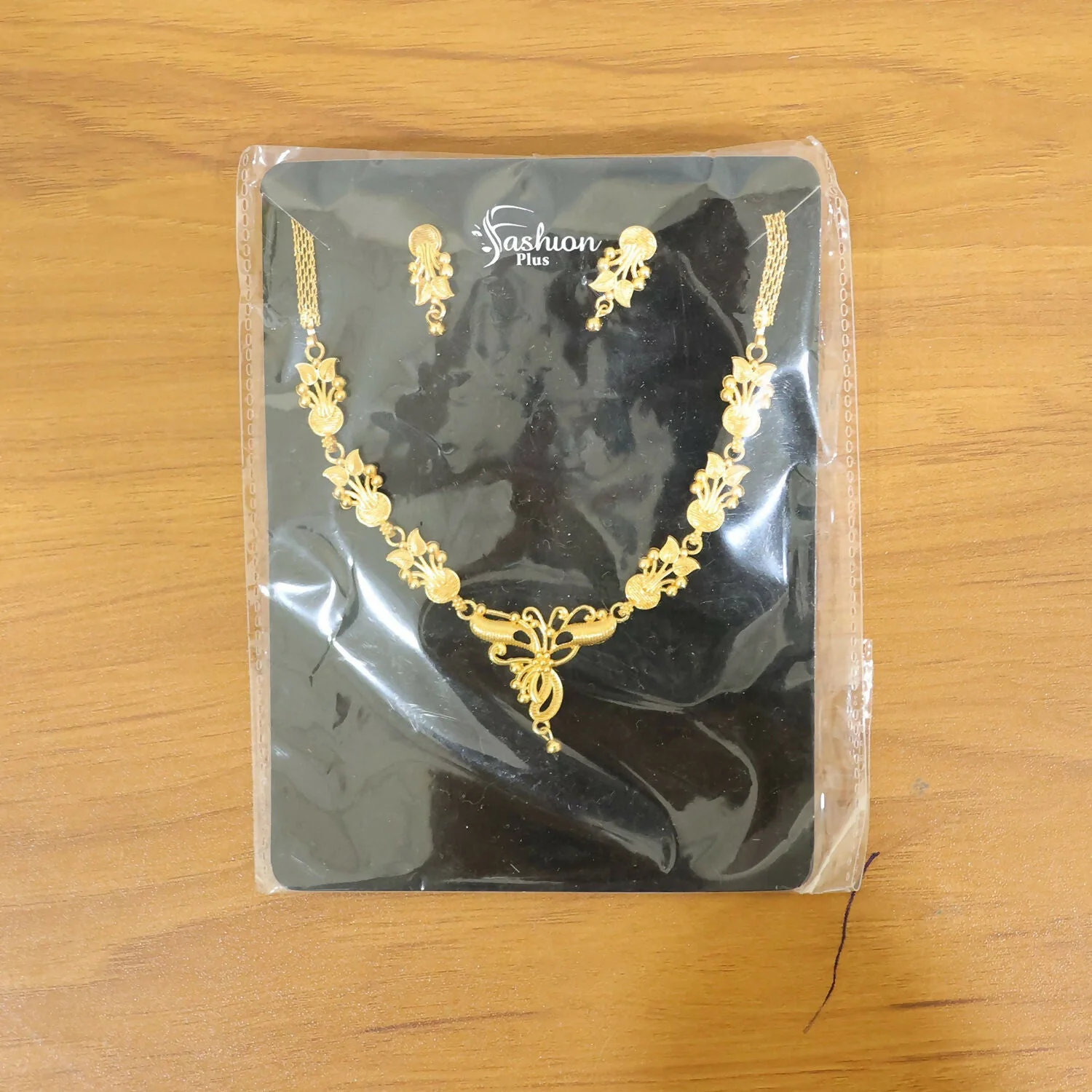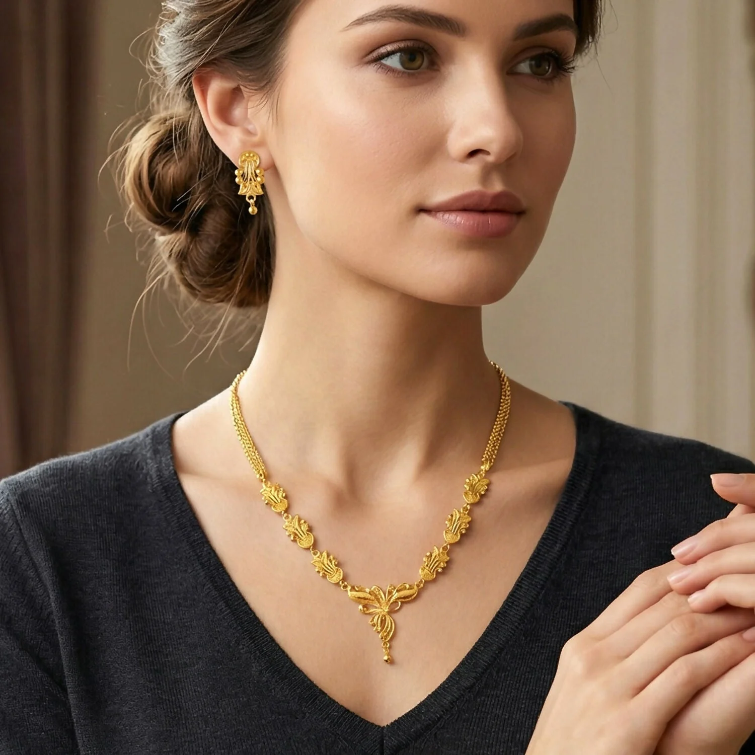 This jewelry set reflects classic craftsmanship with a traditional aesthetic, likely inspired by heritage designs. The warm lighting enhances the gold’s luster, while the soft fabric background adds a sense of luxury and sophistication. The combination of floral motifs, symmetrical patterns, and fine detailing makes the set elegant, graceful, and timeless.