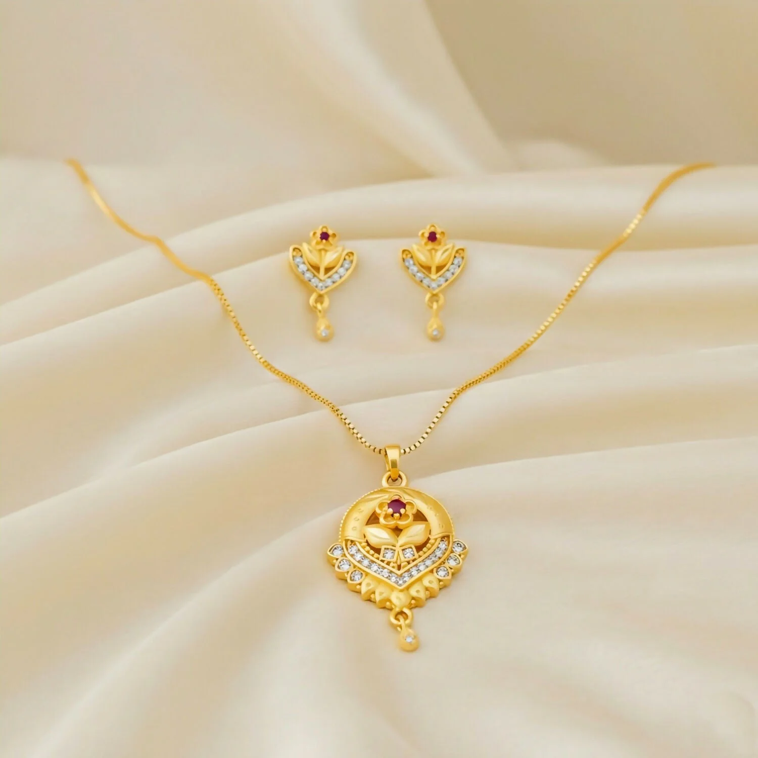 Intricate Pendant Artistry: The pendant showcases a central blooming flower with a vibrant ruby-red stone at its heart. The flower is cradled within a unique shield-shaped base, accented by etched leaf patterns and a sparkling border of white crystals.