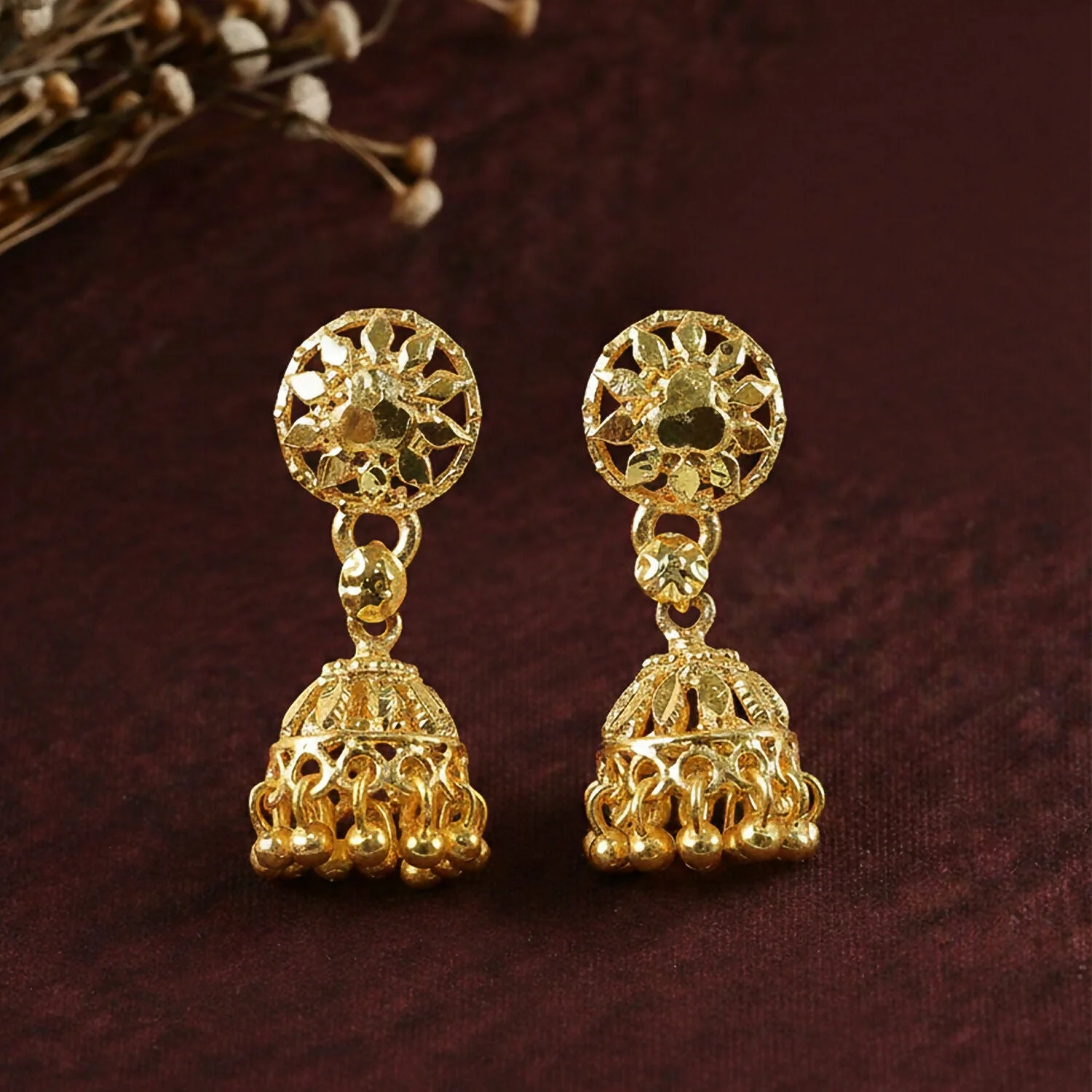 Enhance your traditional look with these beautifully designed gold-plated jhumka earrings featuring a delicate floral top and classic dome drop. The intricate patterns and fine craftsmanship create a graceful ethnic style that complements festive and cultural outfits. These earrings are designed to add charm and elegance to sarees, lehengas, and other traditional attire. The lightweight design ensures comfortable wear while the dangling beads add a subtle movement that enhances their overall appeal. Perfect for weddings, festivals, parties, and special occasions, these elegant jhumka earrings are a stylish addition to any jewelry collection and also make a thoughtful gift for loved ones.