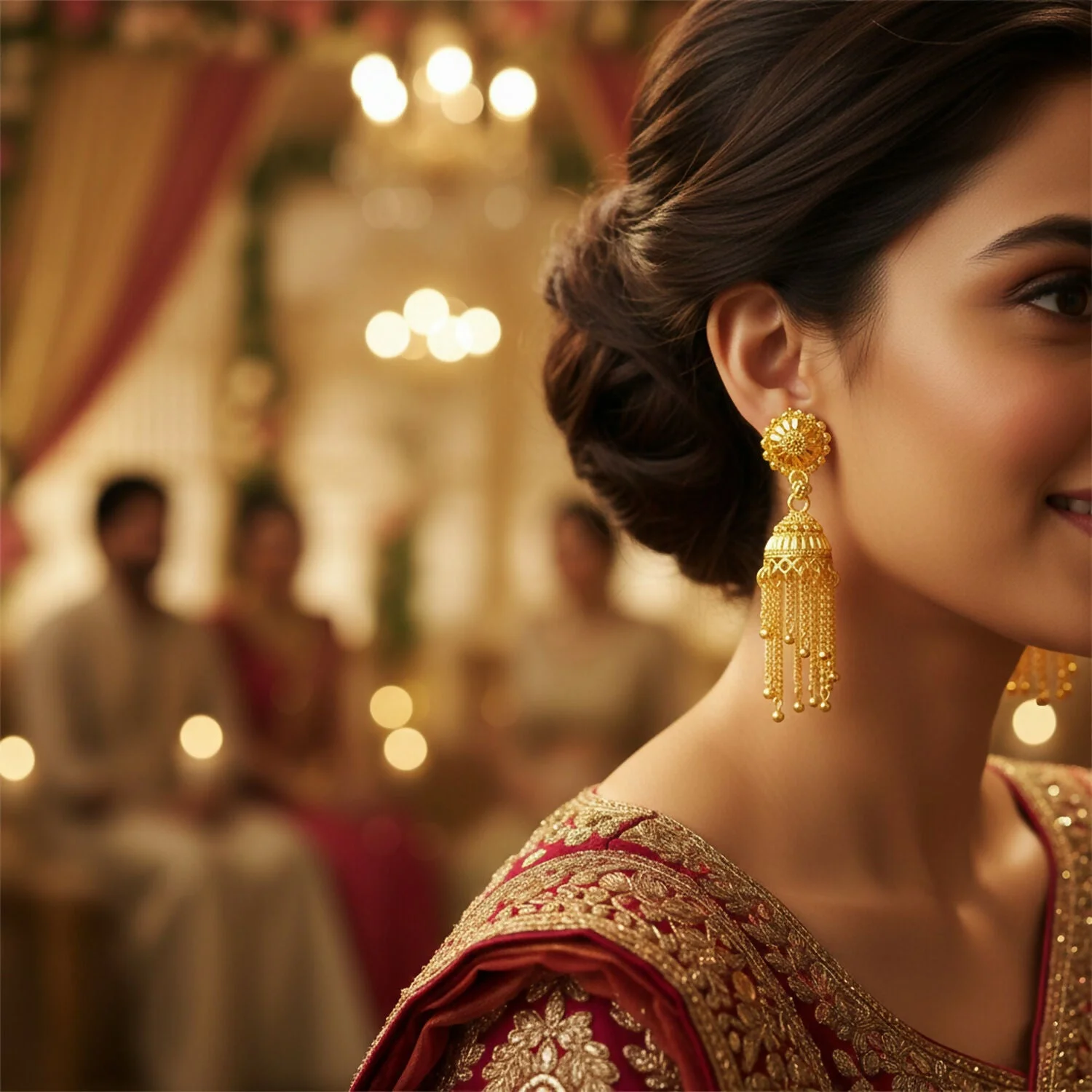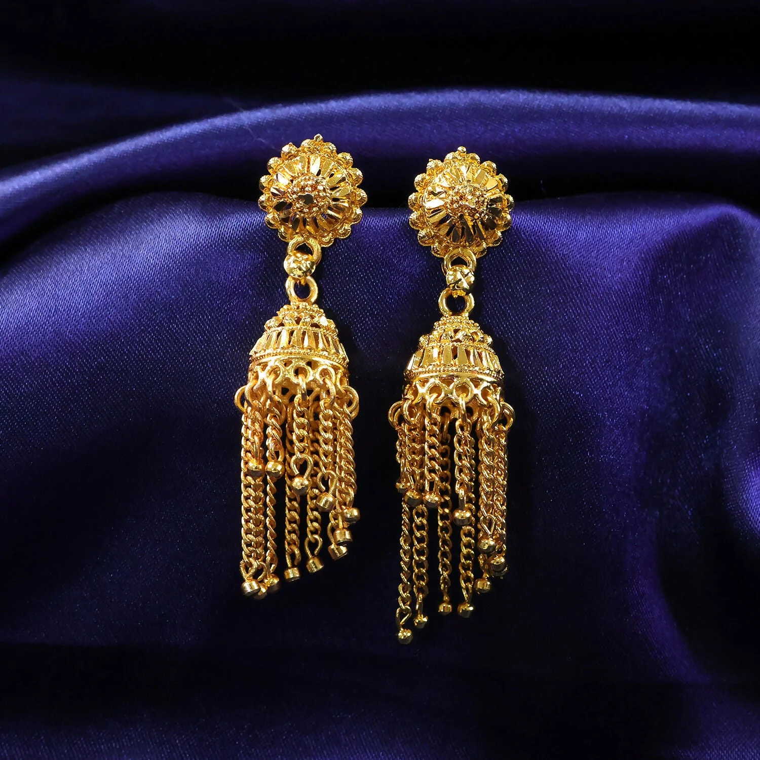 Make a statement with these beautifully designed gold plated tassel jhumka earrings that showcase timeless ethnic elegance. The earrings feature a finely detailed circular stud attached to a classic dome-shaped jhumka, enhanced with delicate hanging chain tassels that create graceful movement. Intricate craftsmanship and traditional styling make these earrings perfect for weddings, festive occasions, and celebrations. Their elegant design pairs beautifully with sarees, lehengas, and ethnic dresses, adding charm and sophistication to your look. Lightweight and stylish, these earrings are an ideal accessory for women and girls who love traditional jewelry with a modern touch.