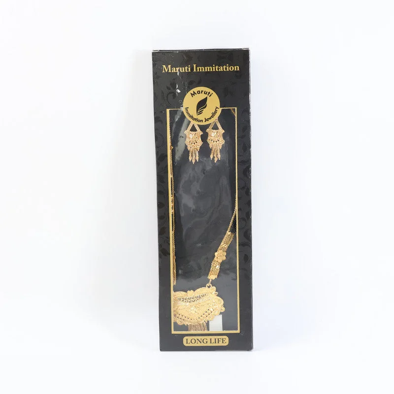 This beautifully crafted mangalsutra necklace set brings together traditional elegance and fine artistry. The gold-plated pendant features rich engraved detailing, complemented by a dual-strand black bead chain that enhances its classic charm. Paired with matching earrings designed to reflect the same intricate patterns, this set is perfect for daily wear, festive occasions, and cultural ceremonies. Its refined finish and timeless design make it an ideal accessory for modern and traditional outfits alike.