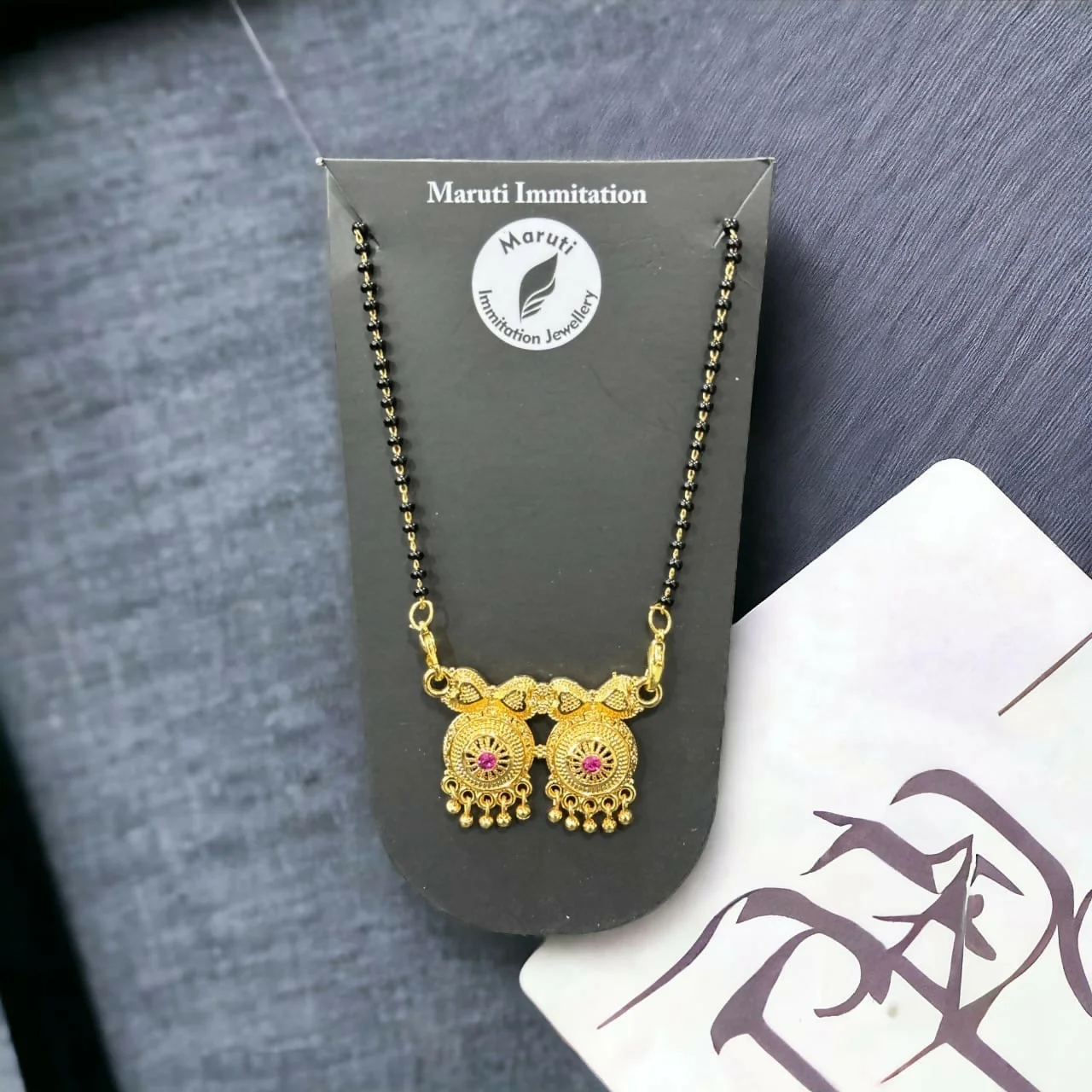 Elegant gold-tone mangalsutra, dual pendant mangalsutra, pink stone mangalsutra, gold finish mangalsutra necklace, traditional Indian jewelry, black bead chain necklace, bridal mangalsutra design, ethnic jewelry for women, stylish mangalsutra, daily wear mangalsutra, gold plated pendant chain.