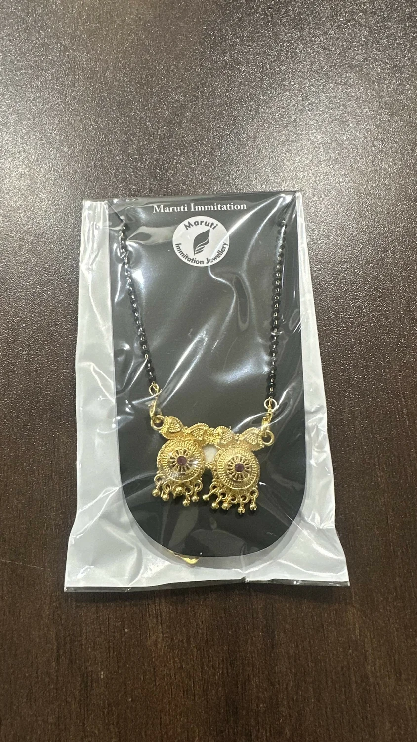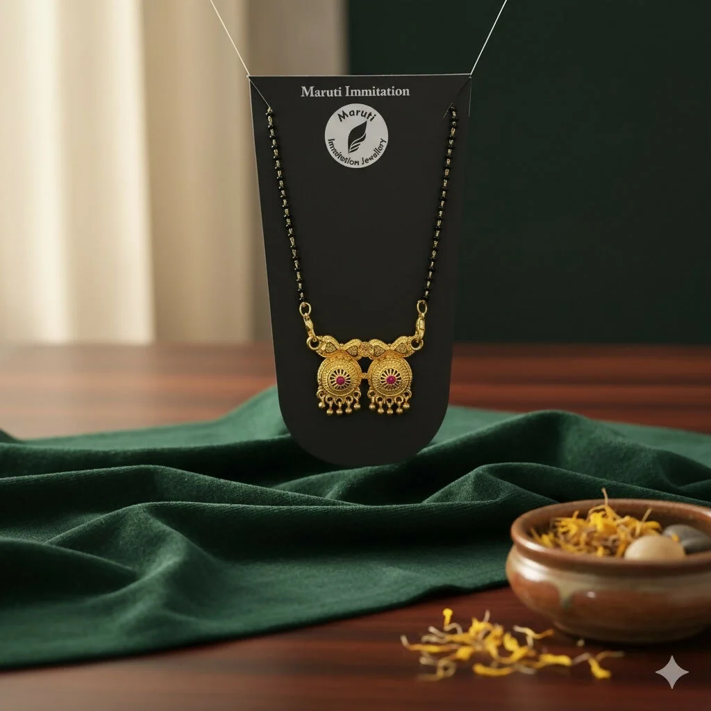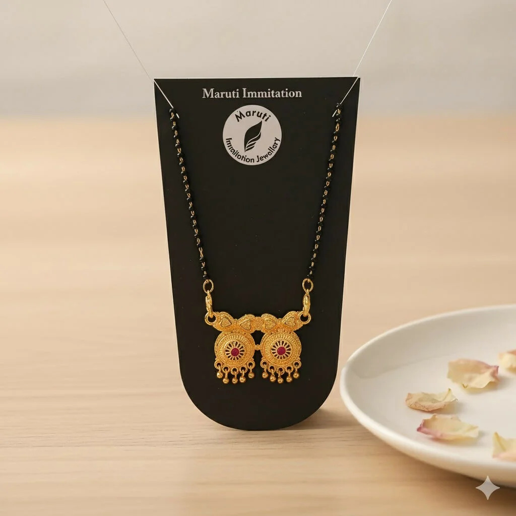 This beautifully crafted mangalsutra features a traditional gold-tone finish paired with a classic black-bead chain, making it perfect for everyday wear and festive occasions. The highlight of the design is the dual circular pendants, intricately detailed and embellished with vibrant pink stones for an eye-catching touch. The delicate golden danglers add graceful movement, enhancing its ethnic charm.