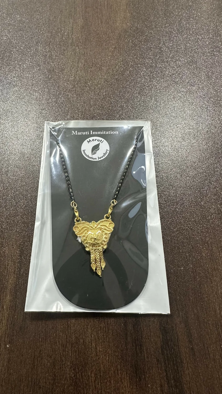 This beautifully crafted mangalsutra features a traditional black-bead chain paired with an intricately designed gold-tone pendant. The pendant showcases elegant leaf patterns, fine detailing, and extended danglers that add a graceful ethnic touch. Perfect for daily wear, festive occasions, or pairing with traditional outfits, this mangalsutra offers a timeless and sophisticated look.