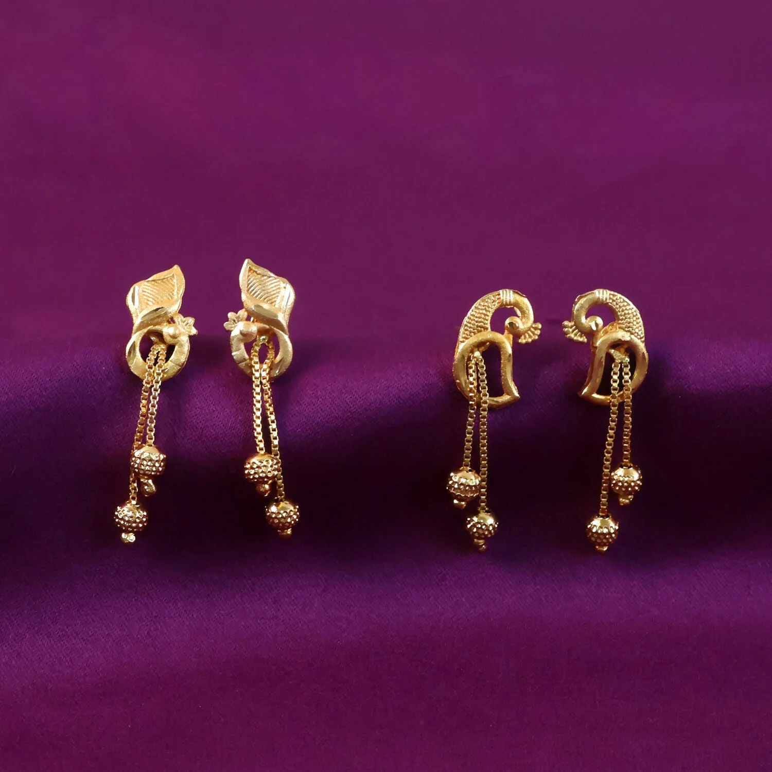The first pair features a delicate floral design with finely textured petals, gracefully paired with cascading chain danglers adorned with tiny gold beads that sway beautifully with movement. The second pair carries a similar charm with a slightly varied motif, offering versatility while maintaining a cohesive traditional aesthetic.