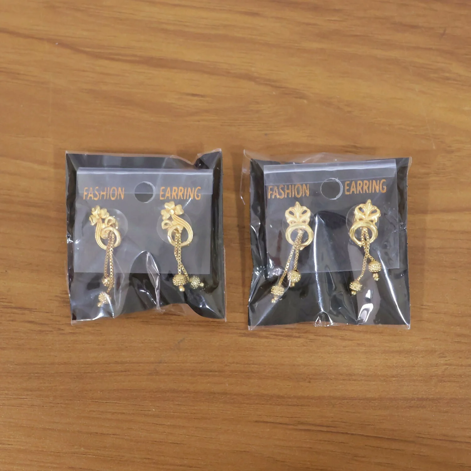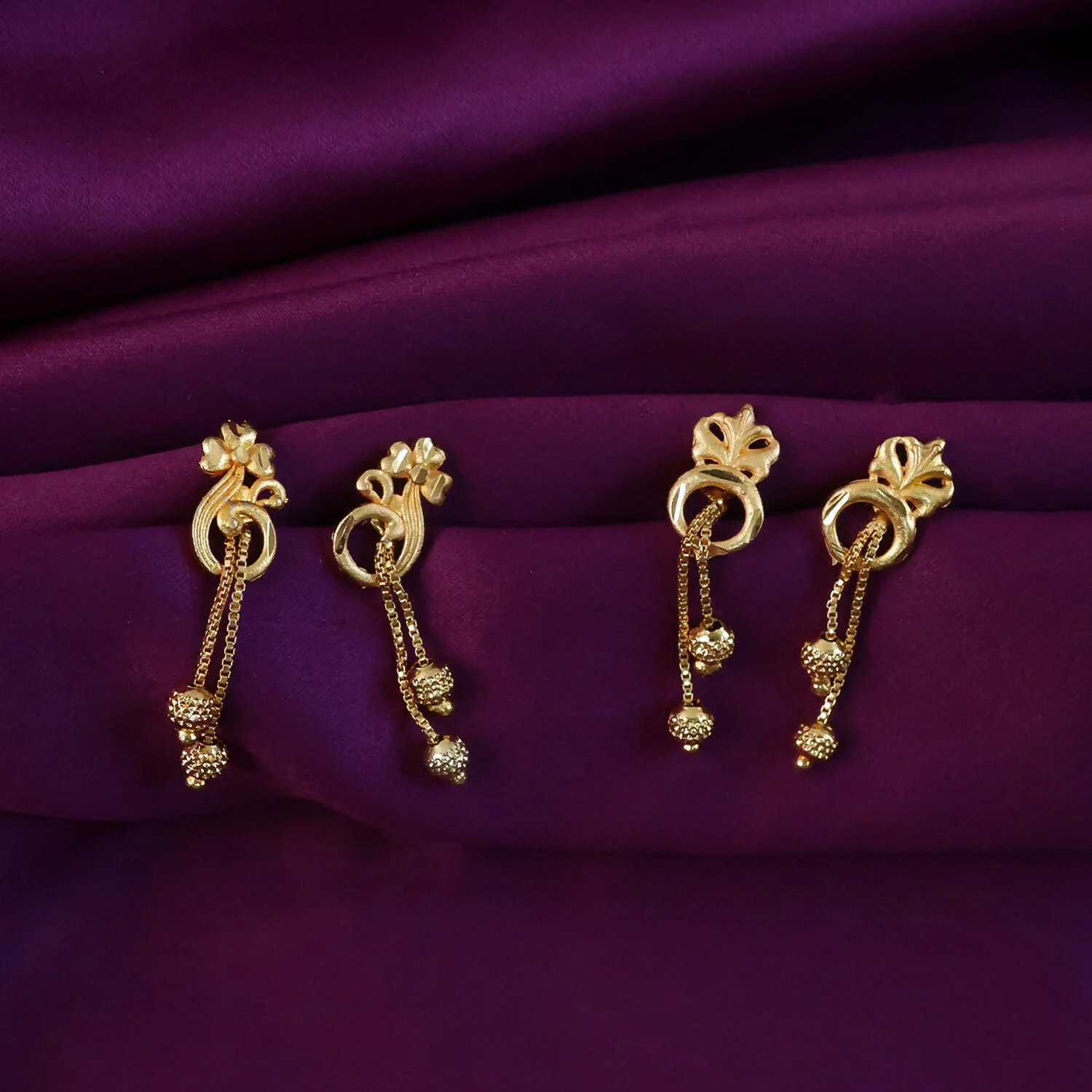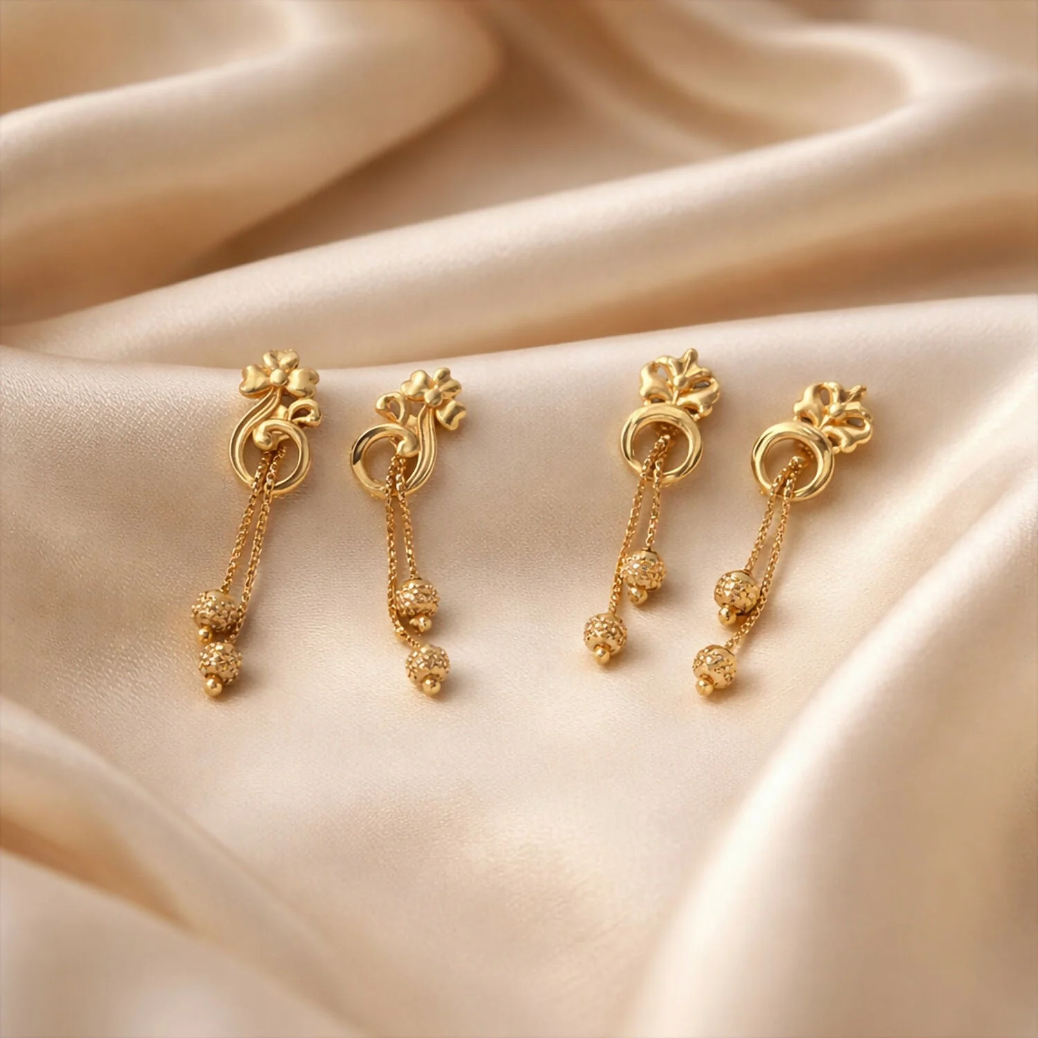 The earrings feature delicately sculpted floral tops that symbolize femininity and beauty, seamlessly connected to smooth, curved motifs that add a touch of sophistication. From these elegant bases, fine chain danglers gracefully descend, ending in textured gold bead accents that catch the light with every movement. The subtle sway of the chains adds a dynamic and eye-catching element, making these earrings both stylish and versatile.