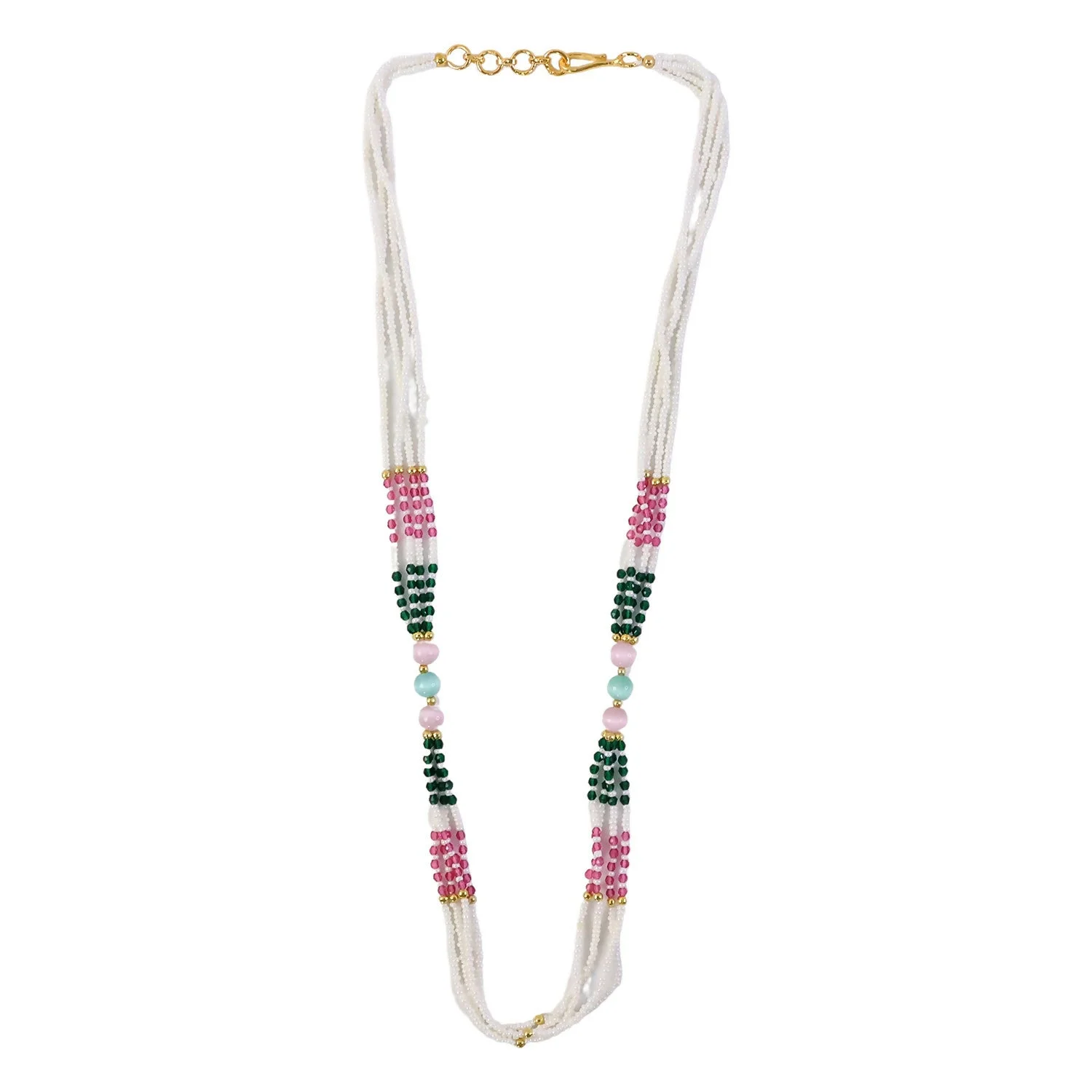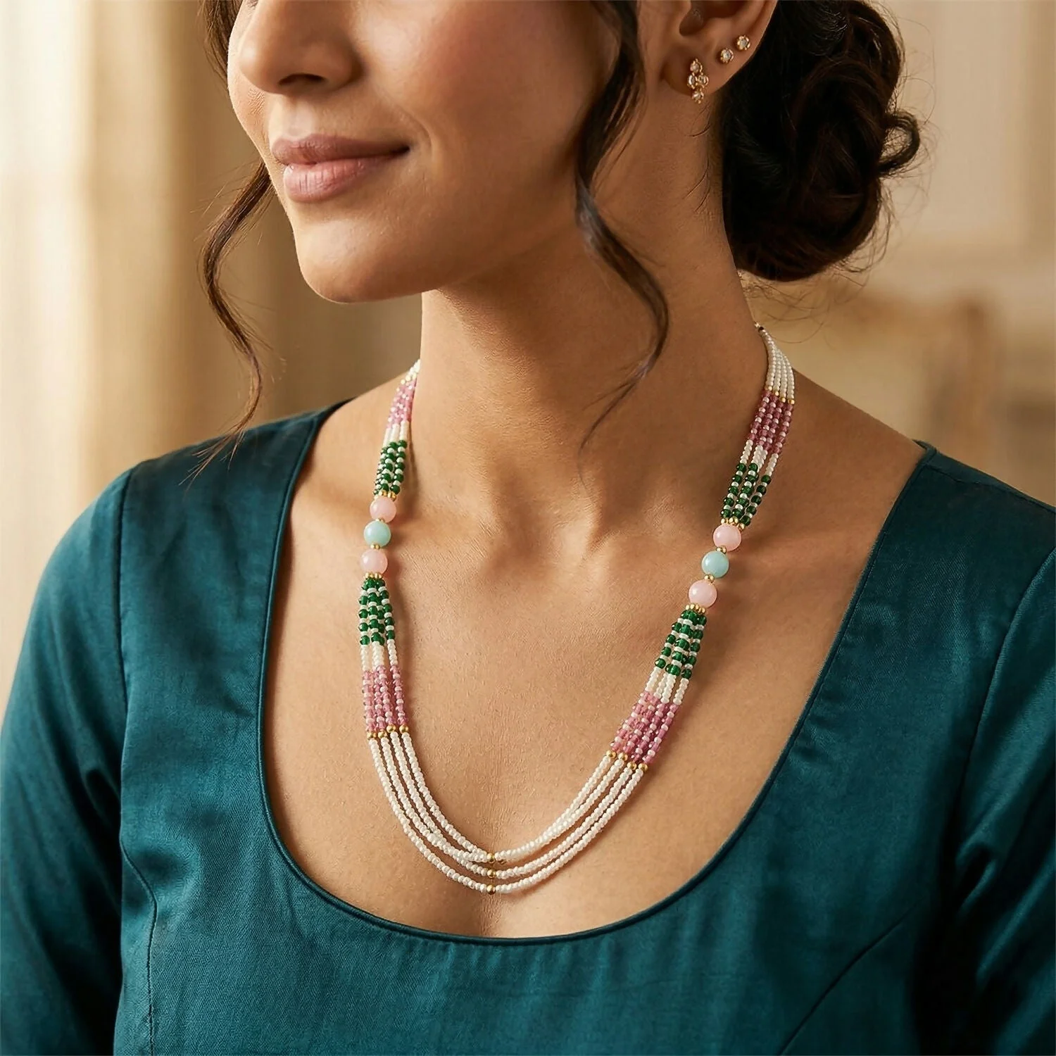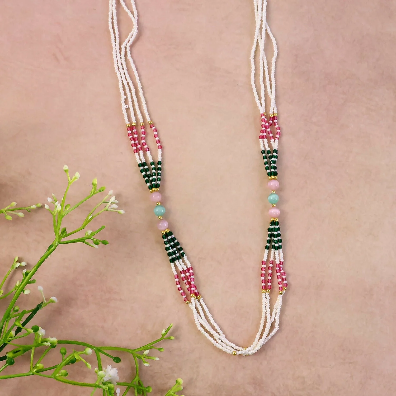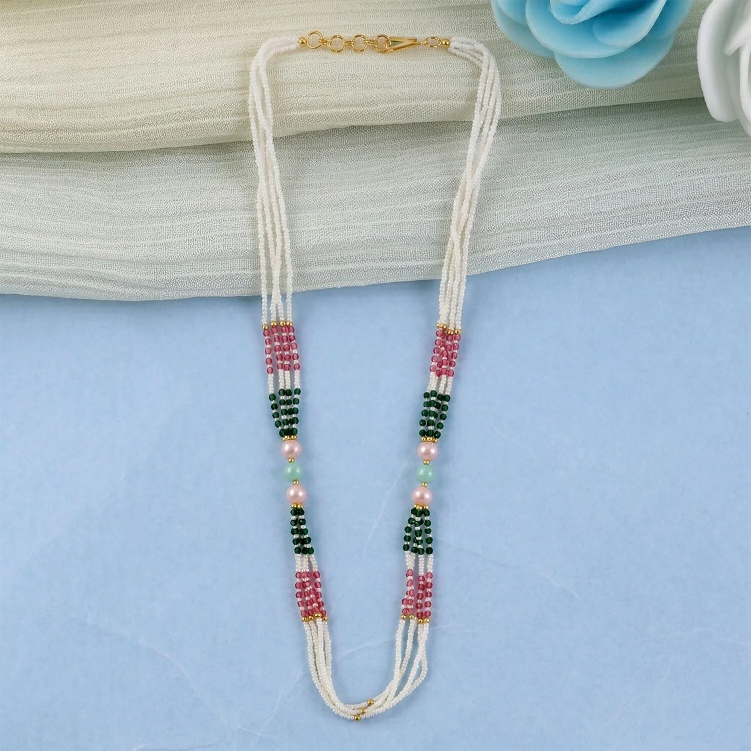 Enhance your everyday and festive look with this beautifully handcrafted beaded mala necklace. Designed with a graceful combination of multicolor beads and layered strands, this piece adds a touch of elegance and tradition to your outfit. The handmade detailing gives it a unique charm, making it stand out from regular accessories. Its lightweight feel ensures comfortable wear throughout the day, whether for casual outings or special occasions. A perfect blend of simplicity and style, this necklace complements both ethnic and modern attire effortlessly.