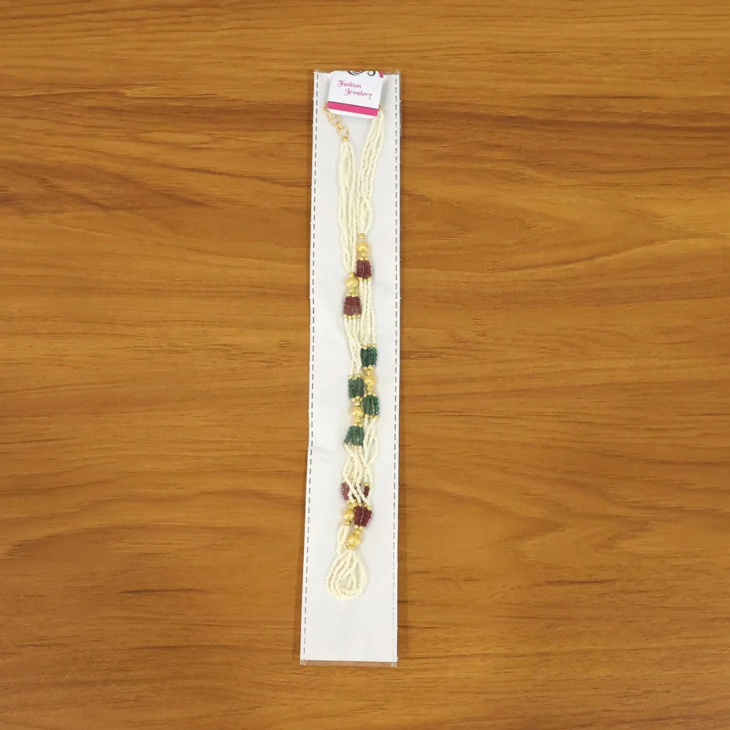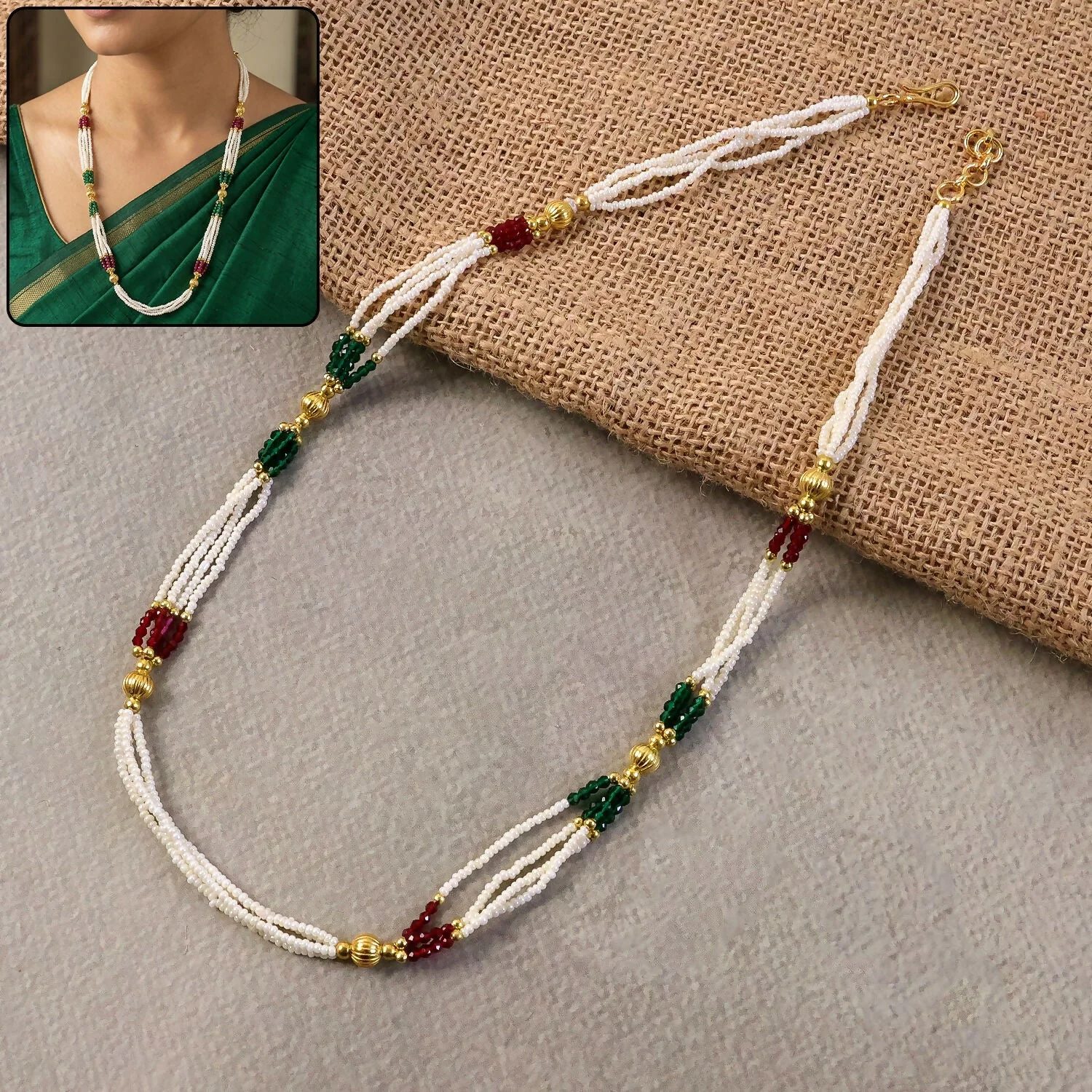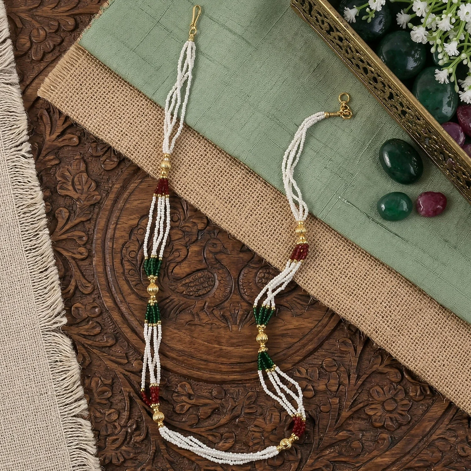 Enhance your traditional look with this beautifully crafted handmade mala necklace designed with fine white beads and elegant gold accents. The intricate bead arrangement creates a graceful layered effect that adds charm and sophistication to any outfit. Its classic design makes it perfect for pairing with sarees, suits, or fusion wear. Lightweight and comfortable, this necklace is ideal for long hours of wear without discomfort. A timeless piece that brings together simplicity and elegance in every detail.