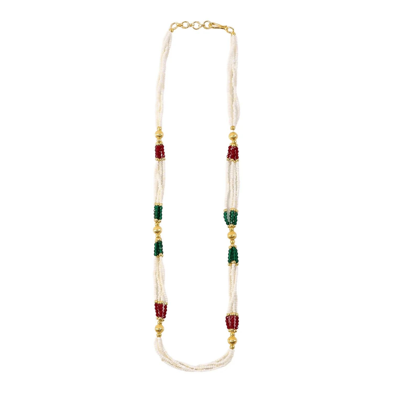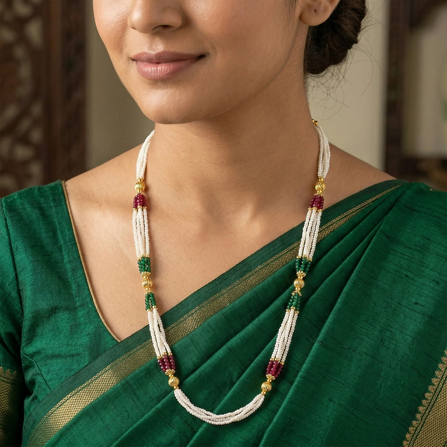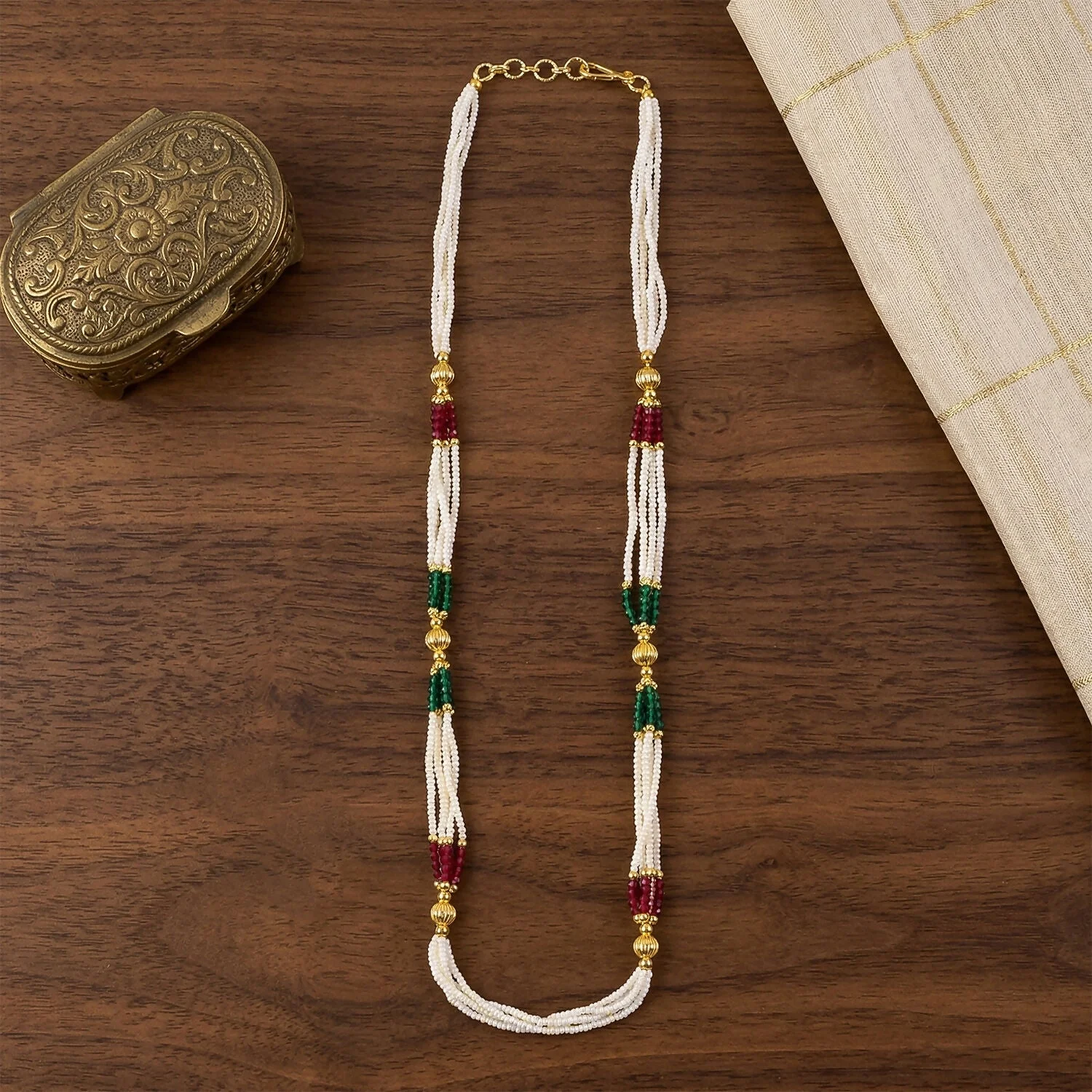 Enhance your traditional look with this beautifully crafted handmade mala necklace designed with fine white beads and elegant gold accents. The intricate bead arrangement creates a graceful layered effect that adds charm and sophistication to any outfit. Its classic design makes it perfect for pairing with sarees, suits, or fusion wear. Lightweight and comfortable, this necklace is ideal for long hours of wear without discomfort. A timeless piece that brings together simplicity and elegance in every detail.