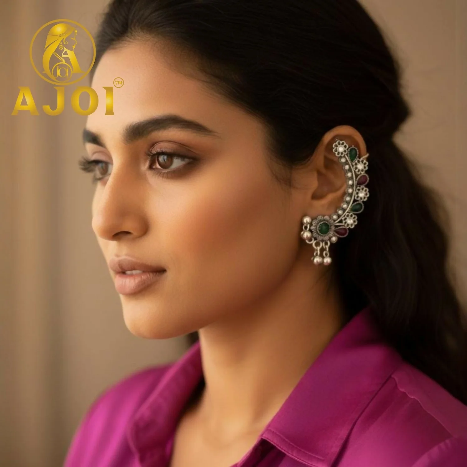 Exquisite handcrafted silver earrings adorned with vibrant gemstone accents, blending timeless tradition with refined luxury.Beautiful silver earrings with colorful stones, perfect for everyday elegance and ethnic wear.