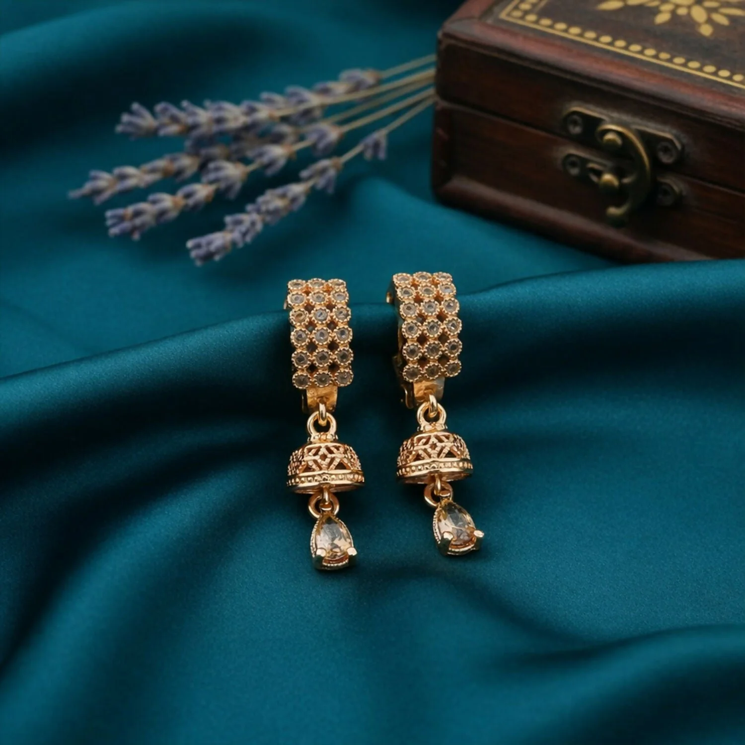 Add timeless elegance to your jewellery collection with these gold-tone crystal studded huggie drop earrings. The rectangular huggie top is beautifully embellished with shimmering stones arranged in a neat grid pattern, creating a rich and luxurious look. Suspended below is a delicately detailed dome-shaped jhumka element with intricate cutwork, finished with a sparkling teardrop charm for graceful movement. The balanced drop length enhances your overall appearance without feeling heavy, making them ideal for extended wear. Perfect for weddings, festive celebrations, parties, and traditional occasions, these earrings pair effortlessly with ethnic as well as contemporary outfits.