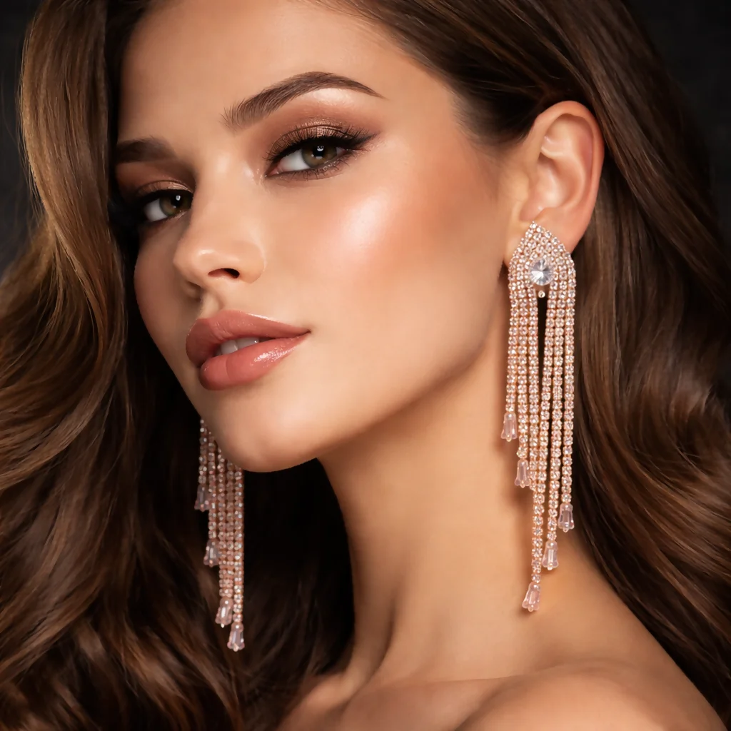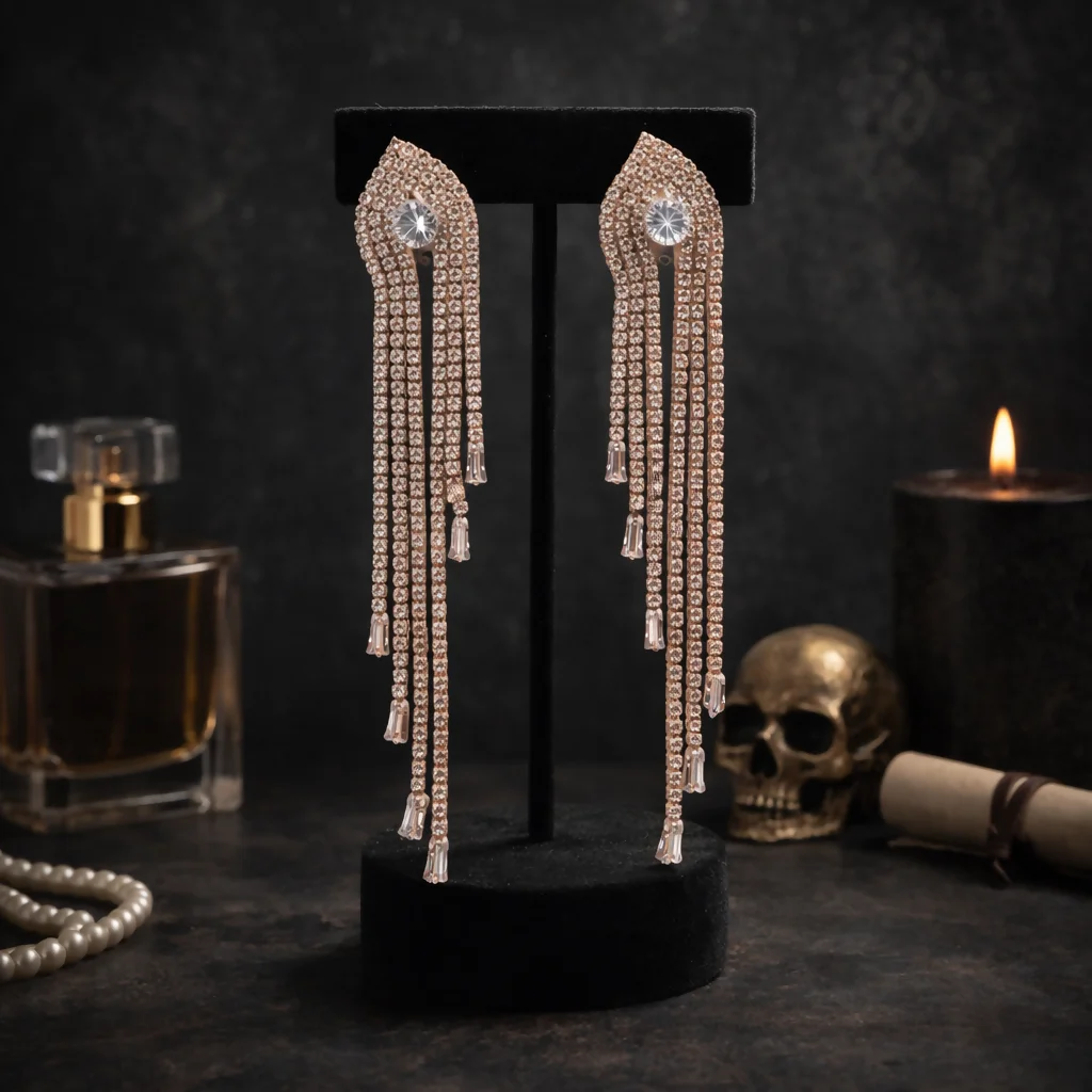 Elevate your style with these luxurious rose gold chandelier earrings, beautifully designed with a teardrop-shaped top encrusted in shimmering cubic zirconia. The cascading strands of sparkling stones and delicate baguette crystal drops create a graceful, flowing silhouette that catches the light from every angle. Perfect for evening parties, weddings, and special occasions, these statement earrings add a bold yet elegant touch to any outfit.