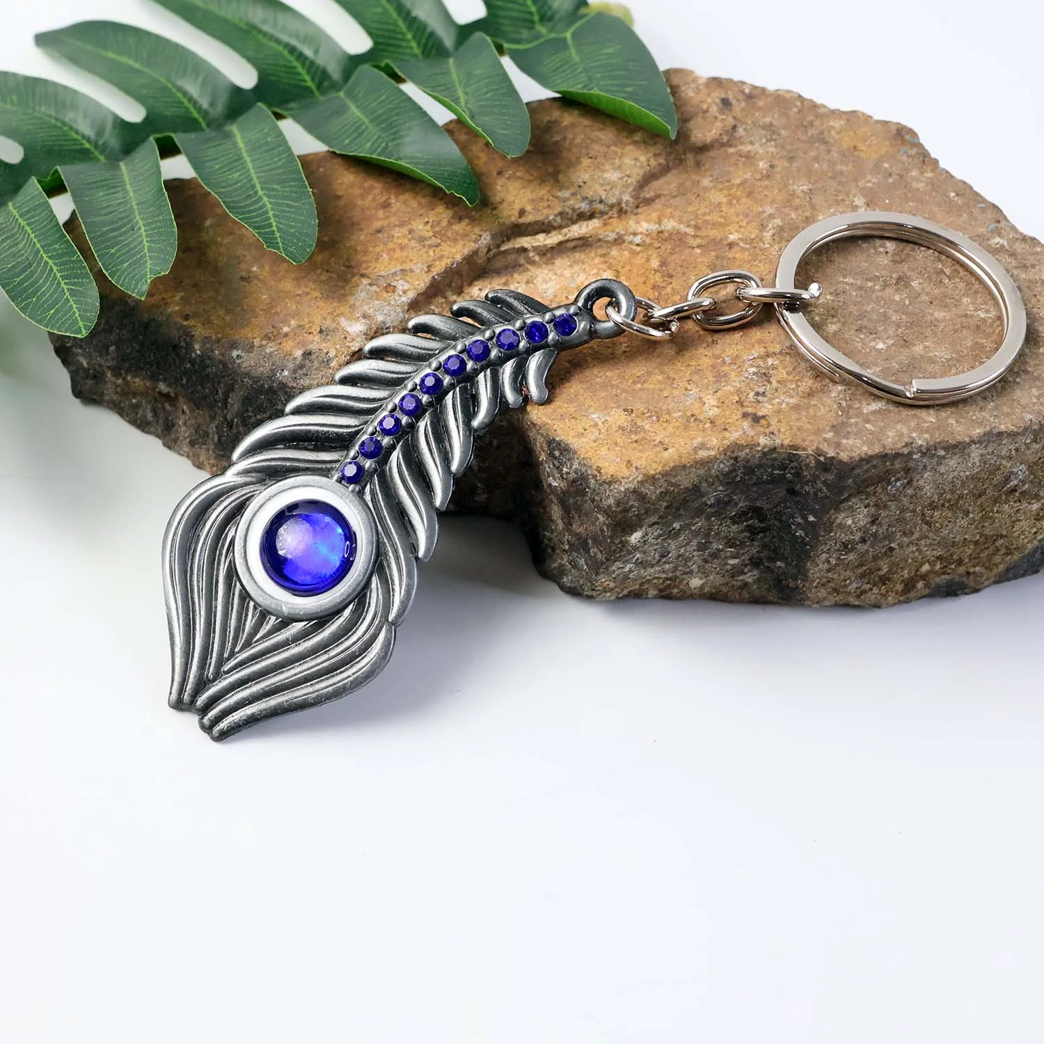 Elegant Metal Peacock Feather Keychain – Stylish Silver-Toned Key Ring with Blue Gem Design for Car, Bike, Home & Office Keys (1 Pc)