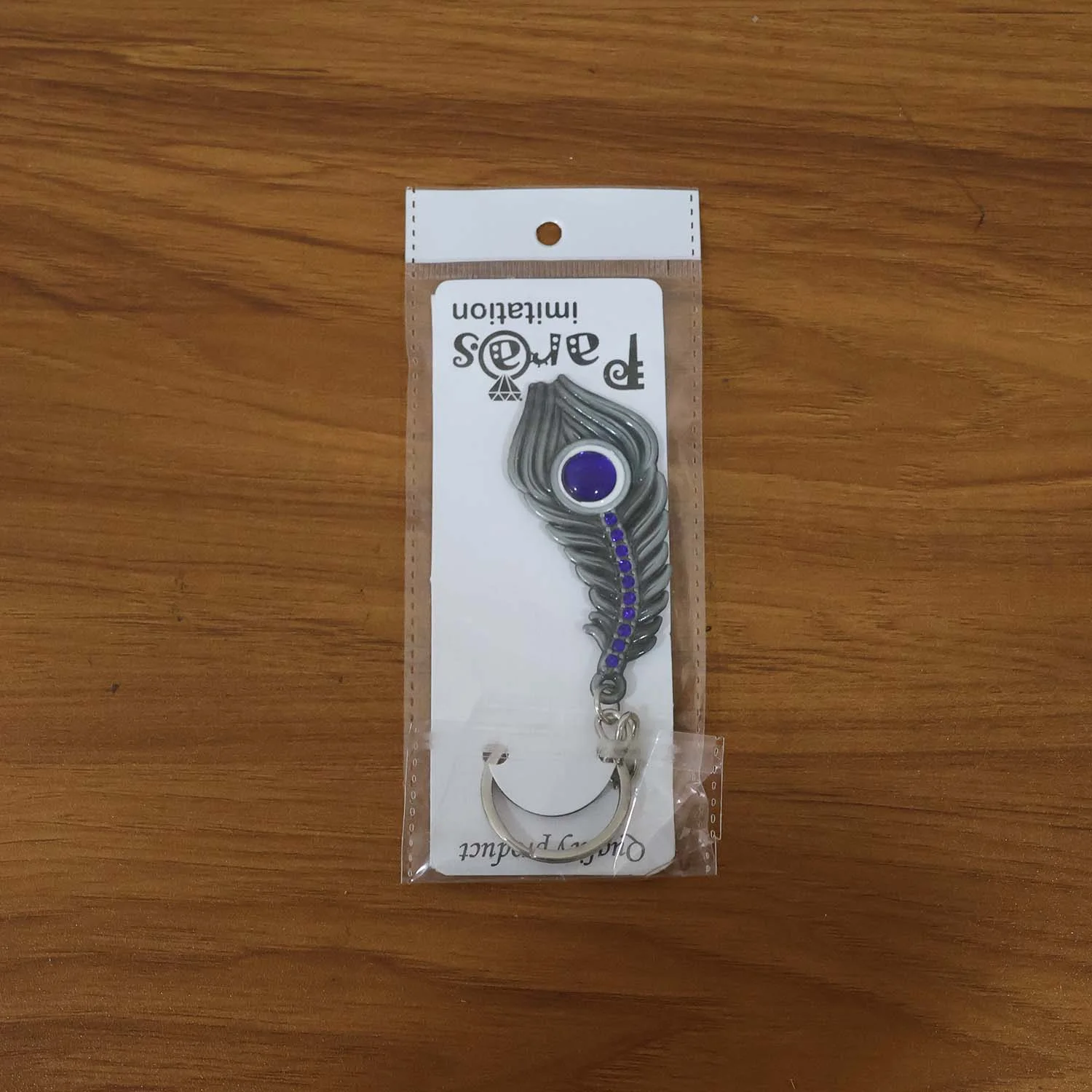 metal peacock feather keychain , elegant key ring , silver-toned keychain , blue gem design keyring , stylish key holder , decorative metal keychain , peacock design key holder , premium feather keychain , fashionable key accessory , gift keychain , artistic peacock keyring