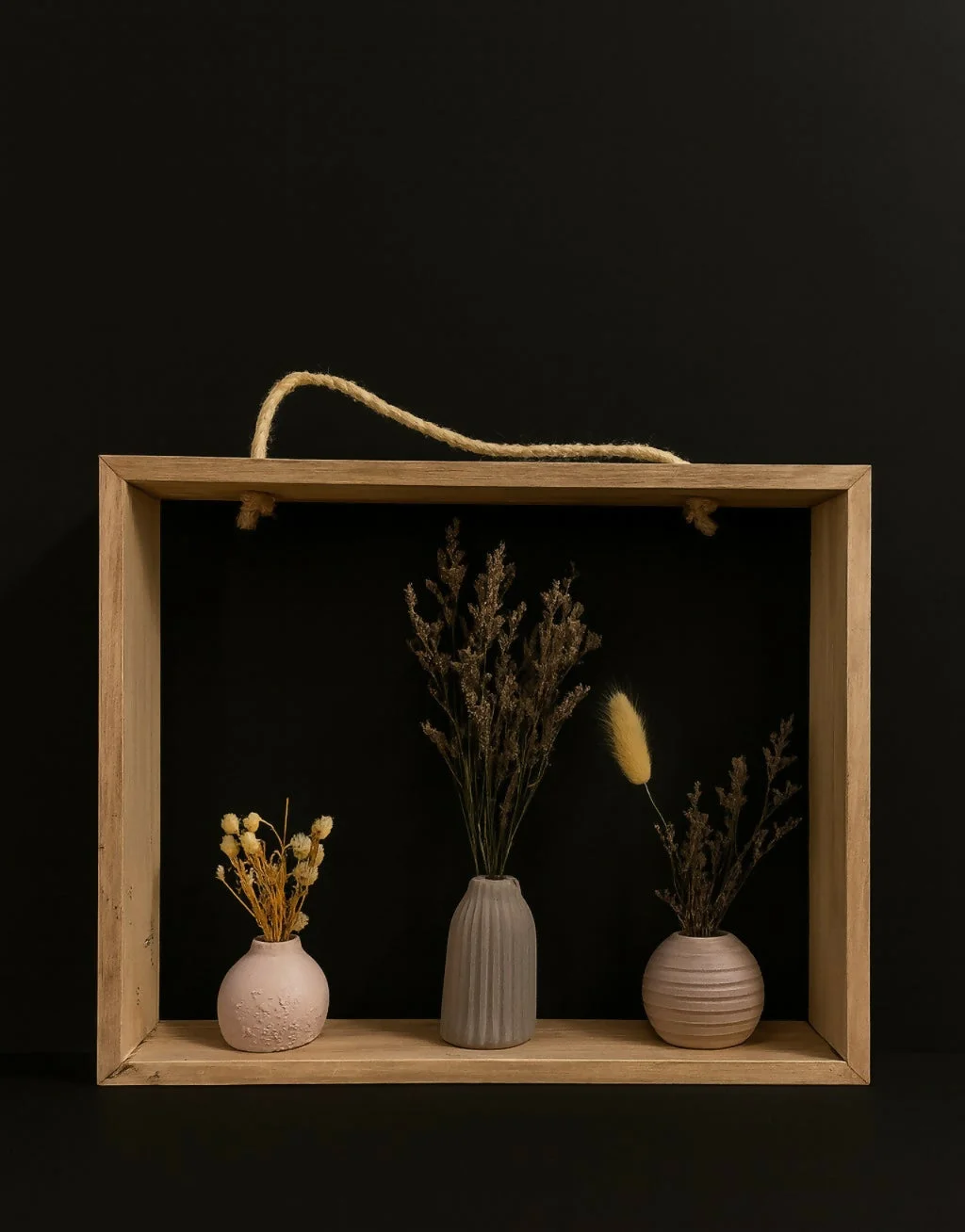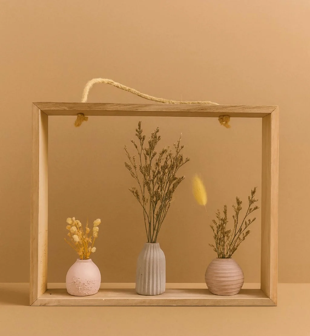 Bring warmth and style to your space with this Minimalist Wooden Frame Ceramic Vase Set featuring three beautifully crafted vases, each adorned with hand-selected dried flowers. The natural wooden frame adds a touch of rustic charm, while the soft pastel vases with unique textures create a perfect balance of elegance and simplicity. Whether placed on a tabletop, shelf, or hung on the wall, this arrangement elevates any corner of your home or office with a cozy boho vibe. A perfect gift for housewarmings, weddings, anniversaries, or festive occasions.