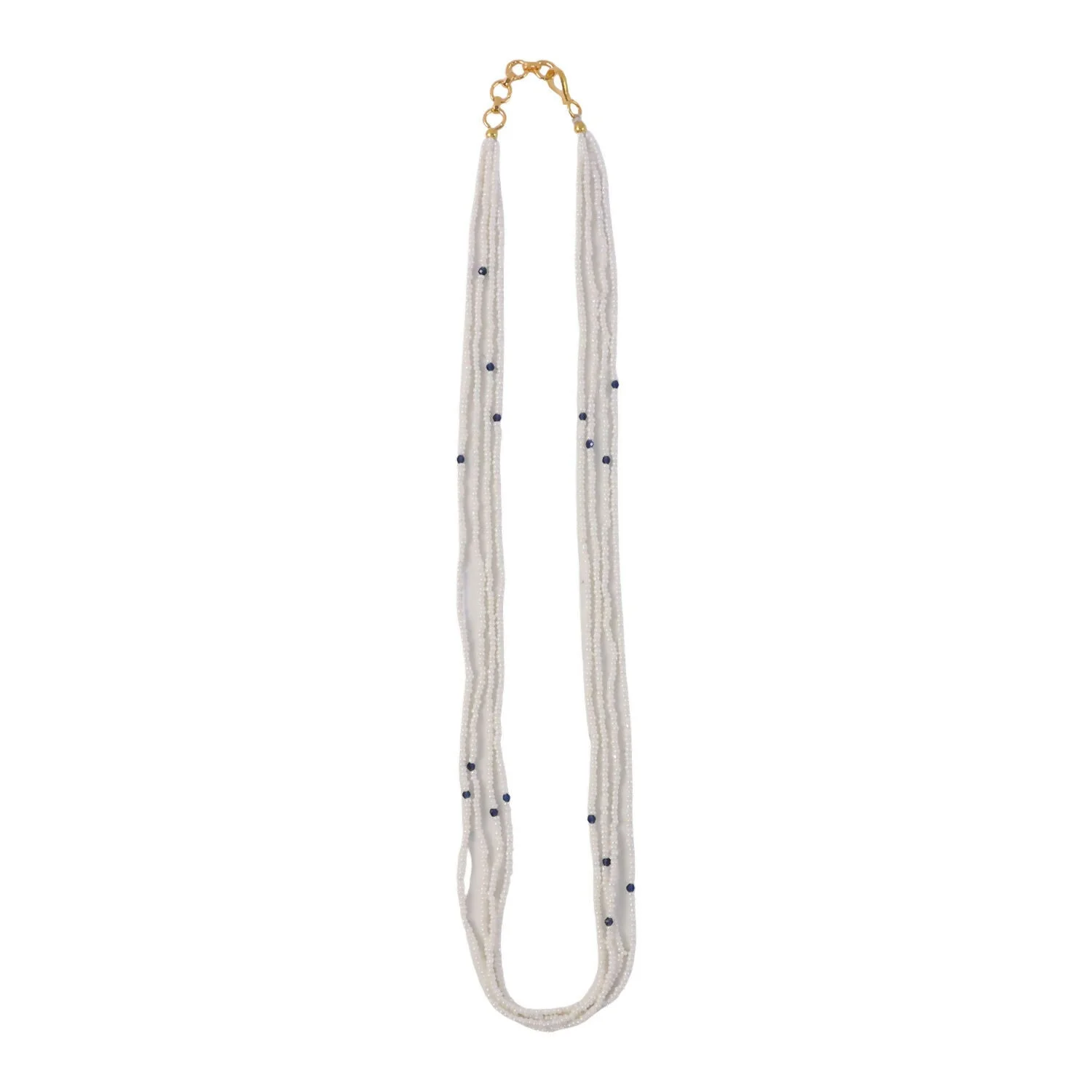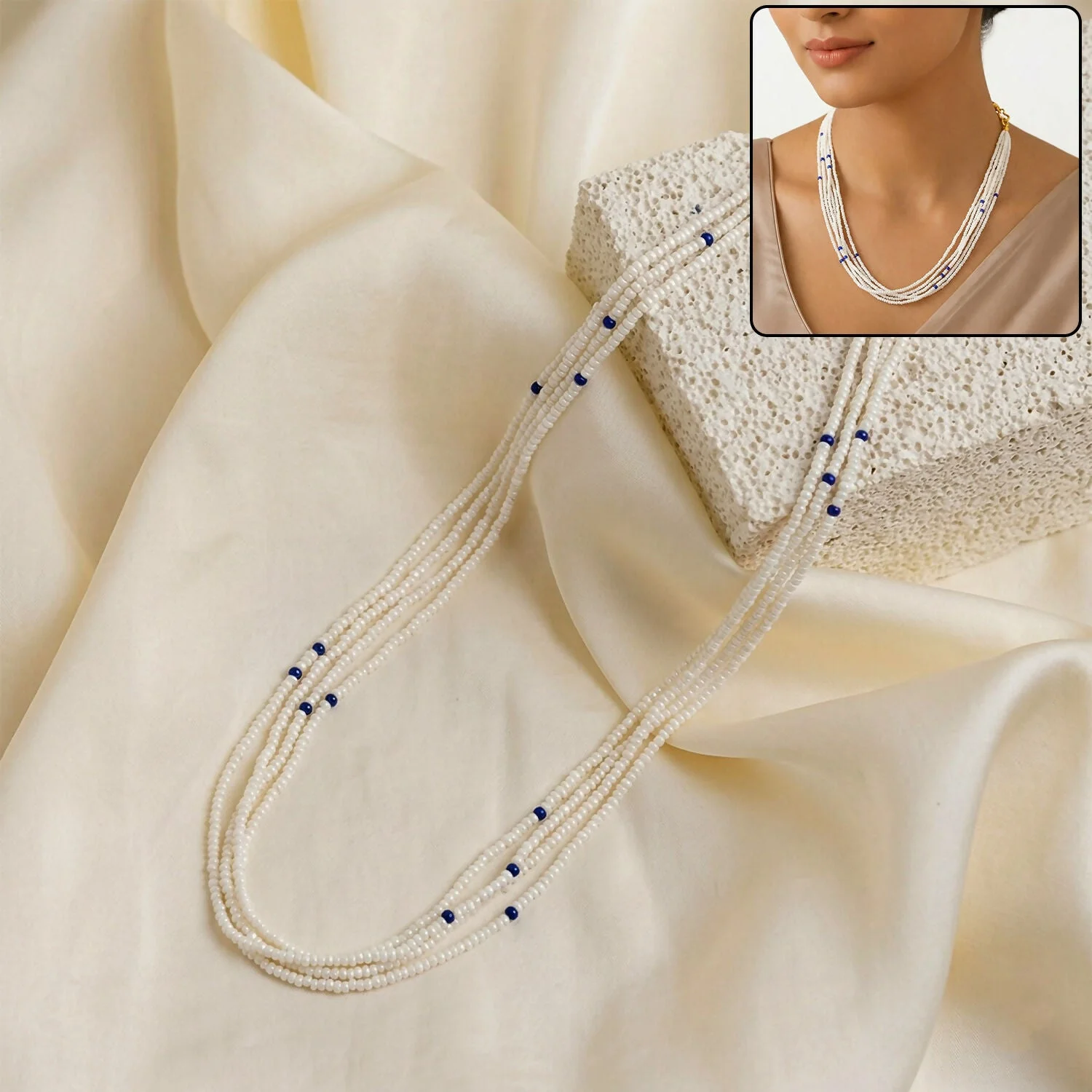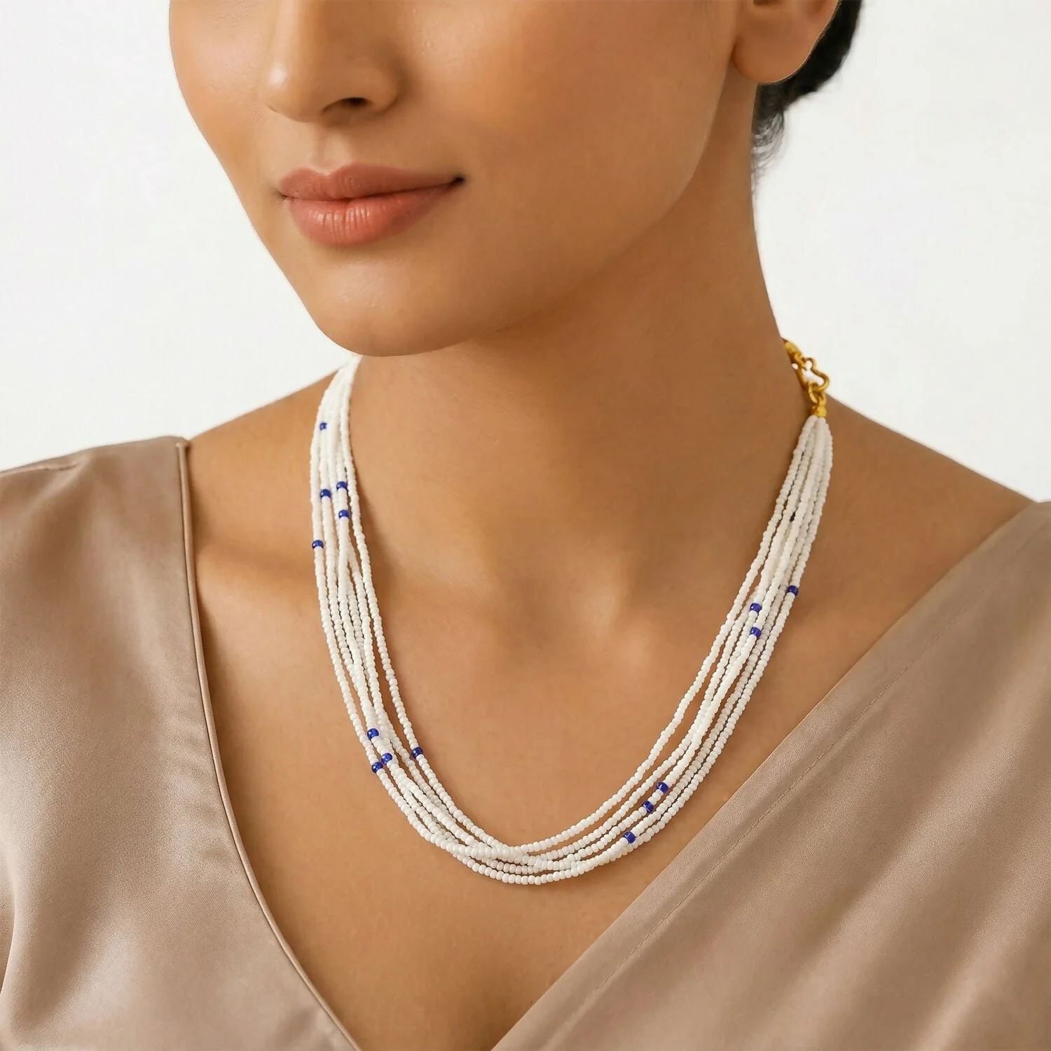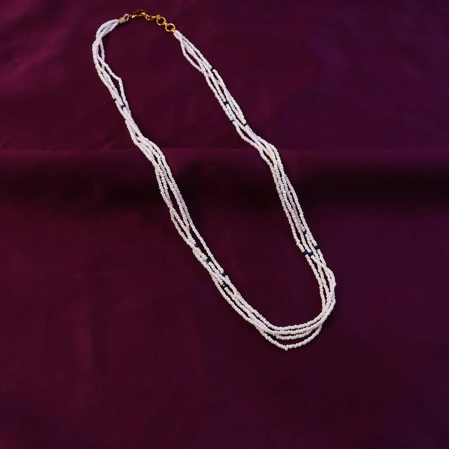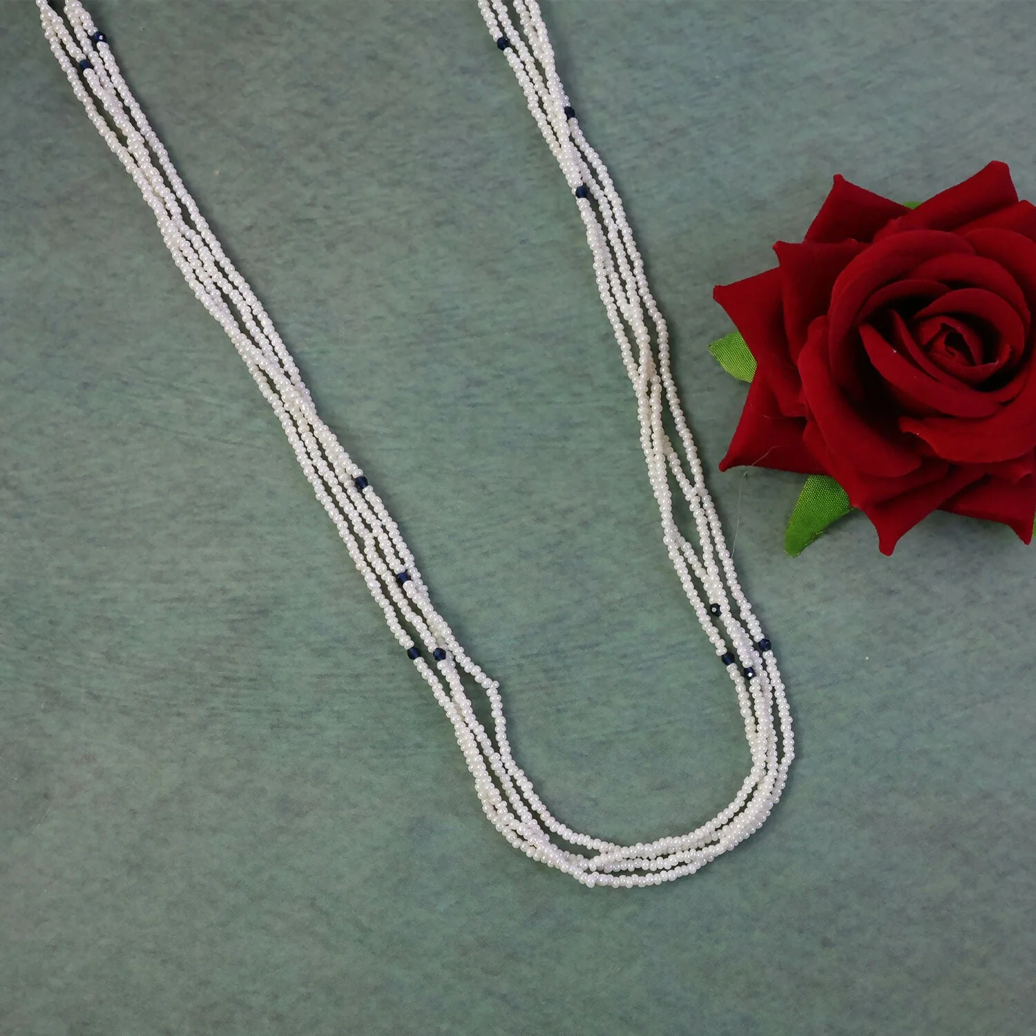 Be the first to review Elegant Multi-Layer Pearl Beaded Mala Necklace with Blue Accent Detailing!