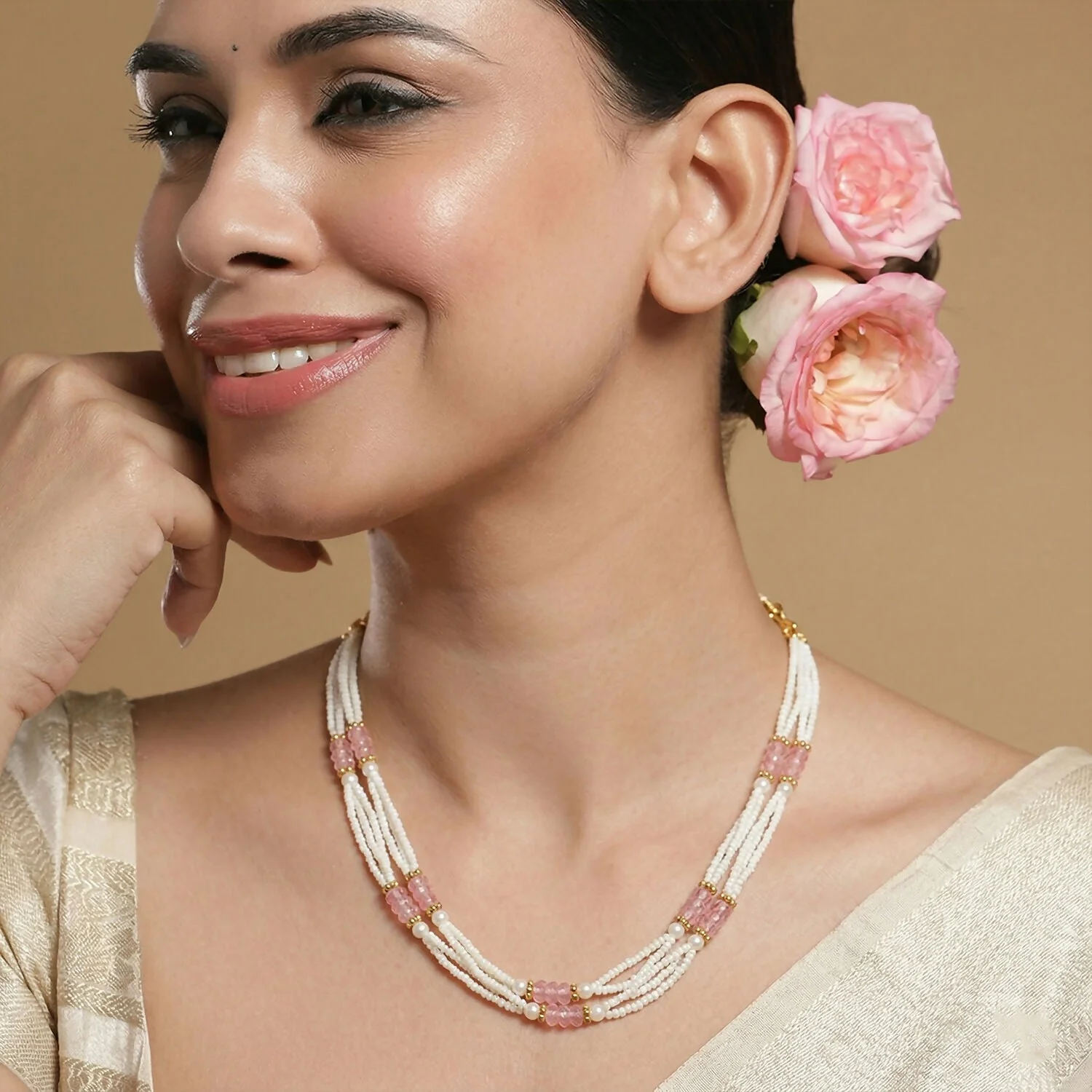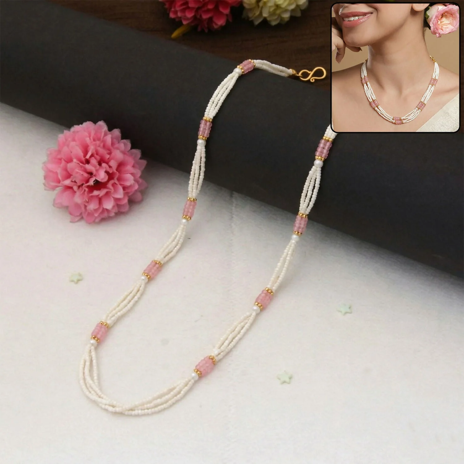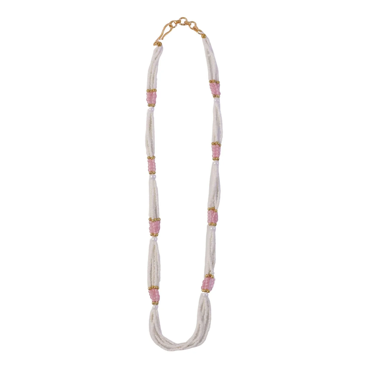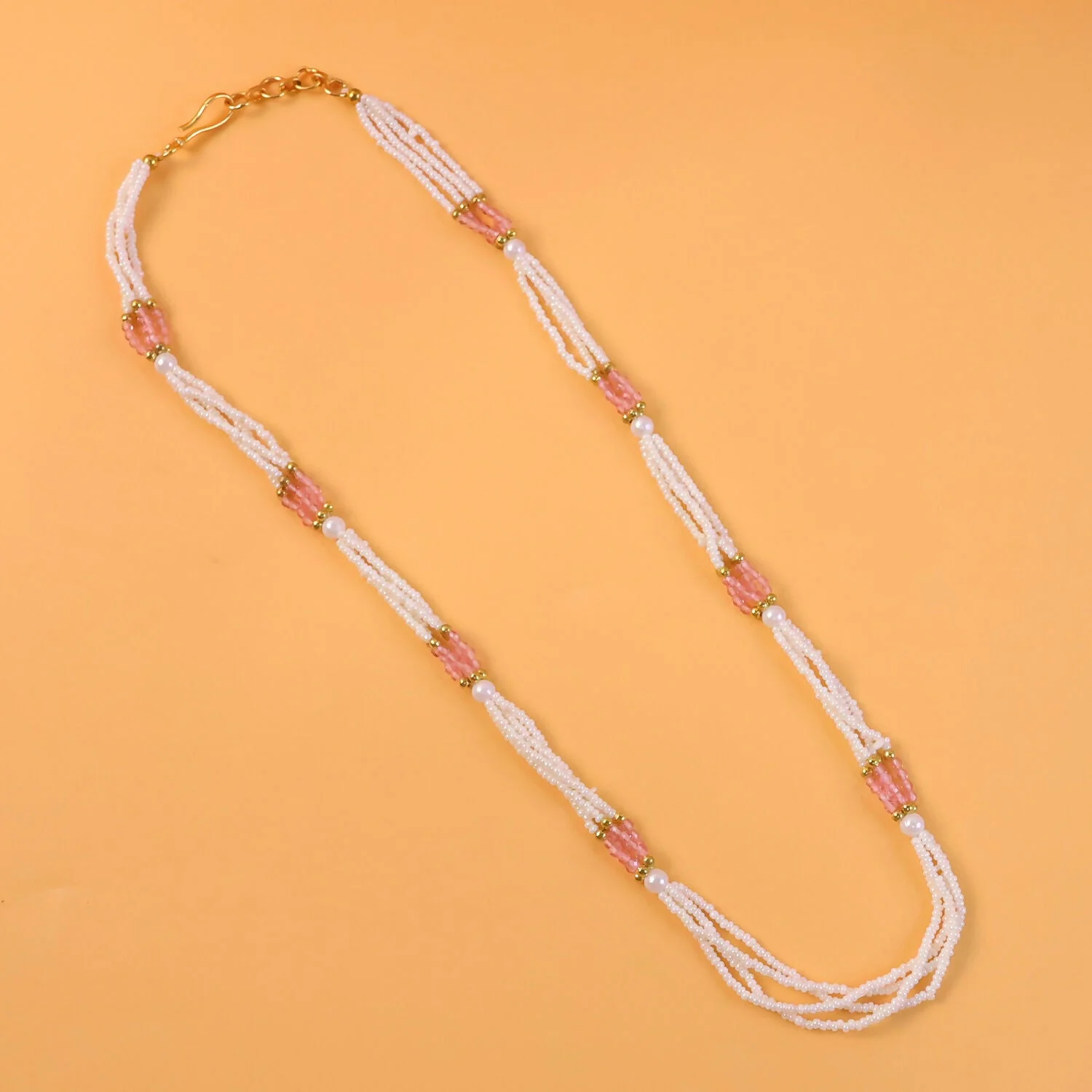 Be the first to review Elegant Multi-Layer Pearl Beaded Mala Necklace with Pink Segment Accents!