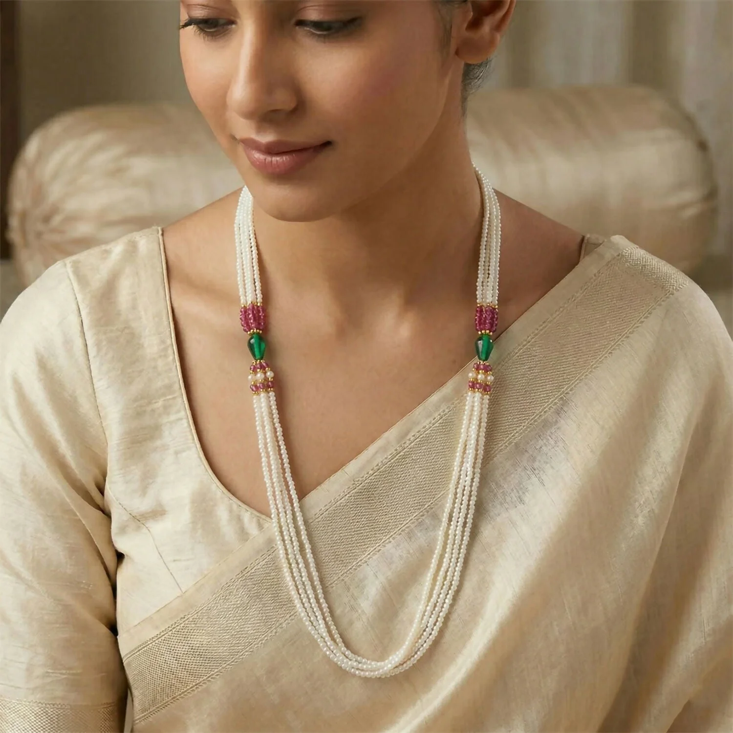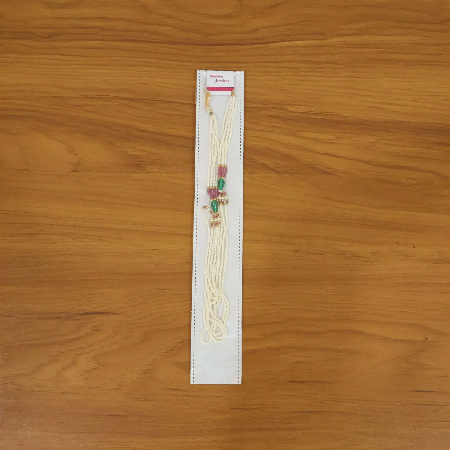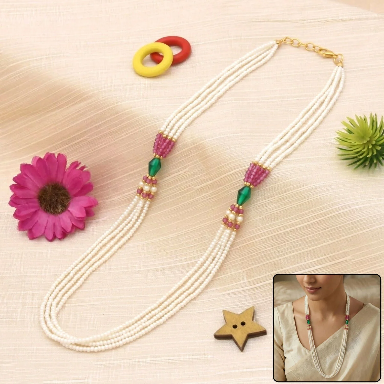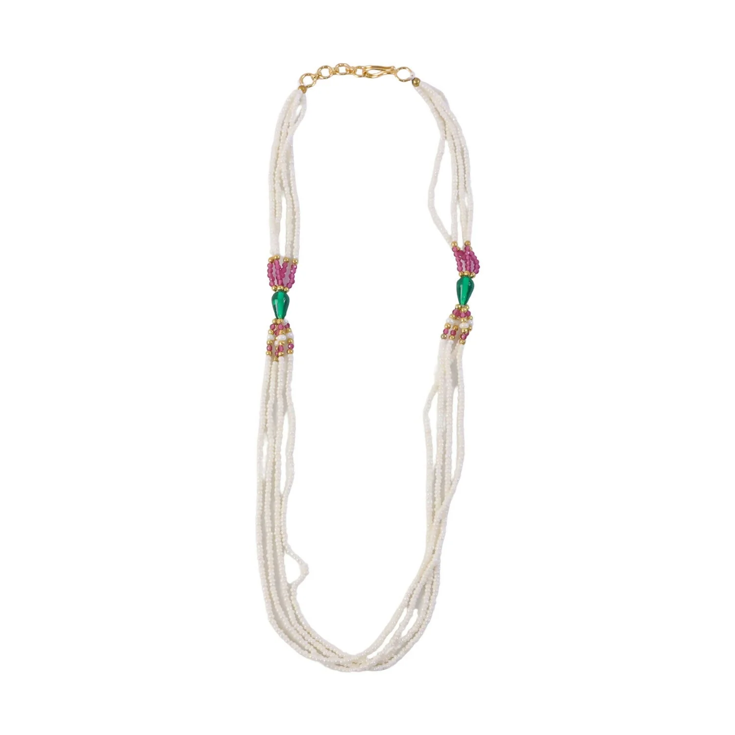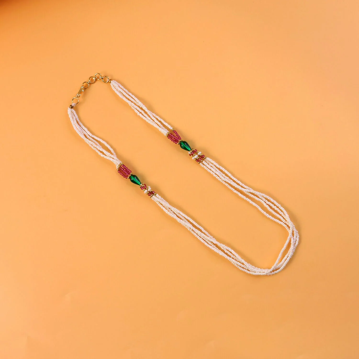 Be the first to review Elegant Multi-Layer Pearl Beaded Necklace with Pink & Green Accent Detailing!