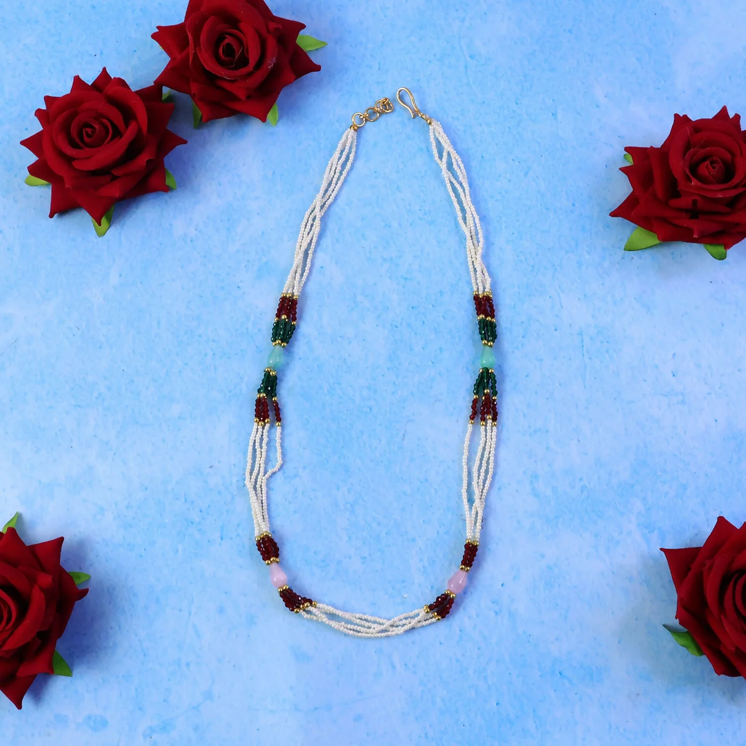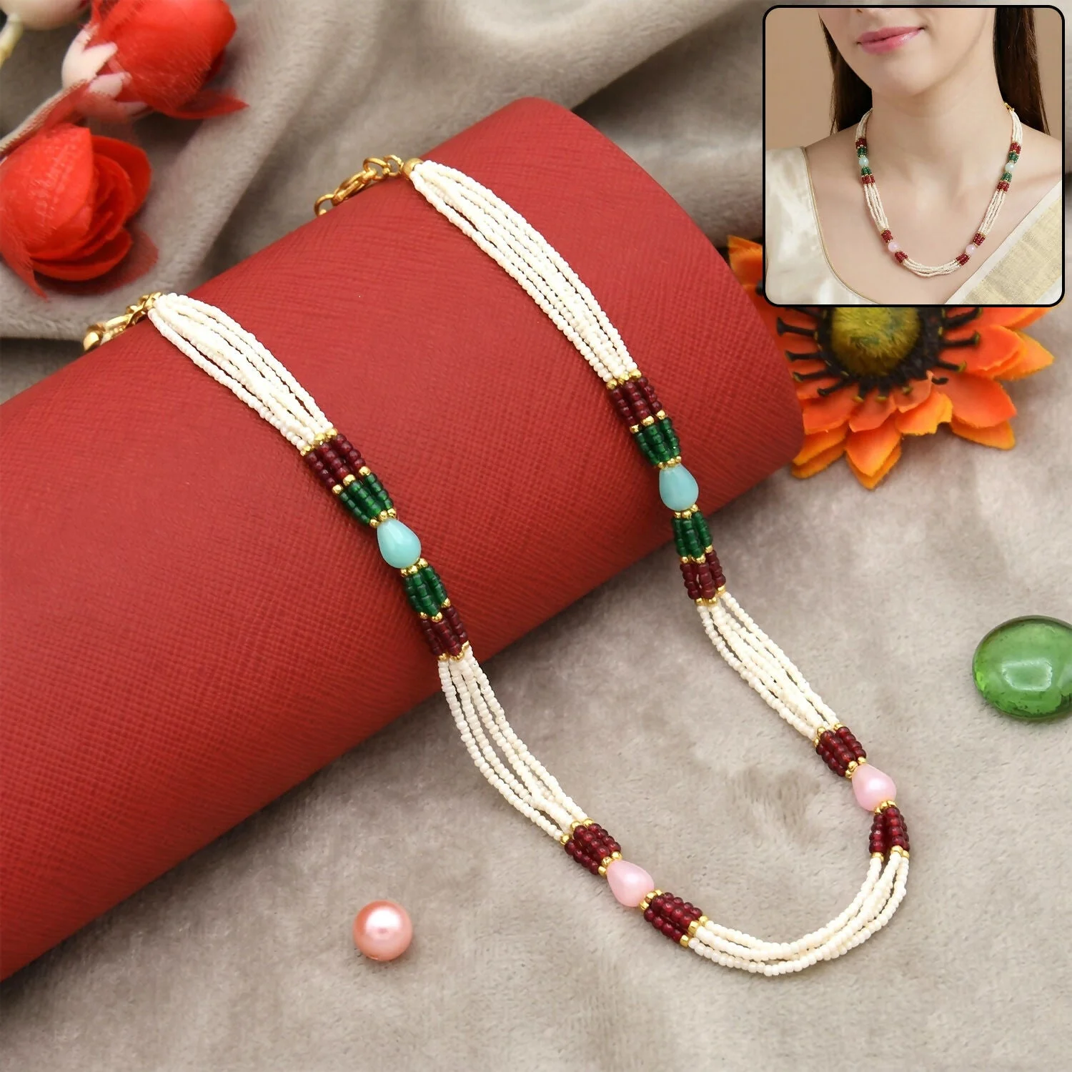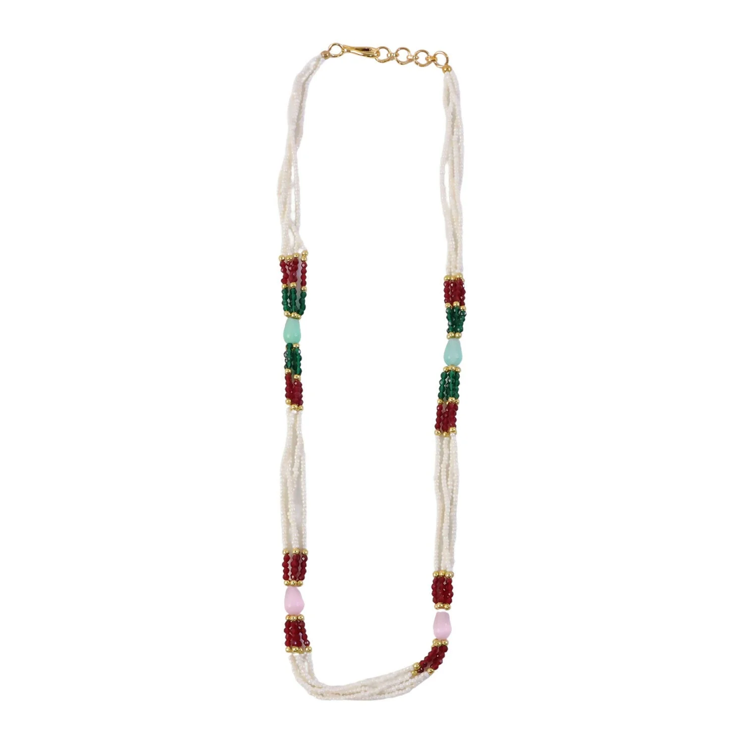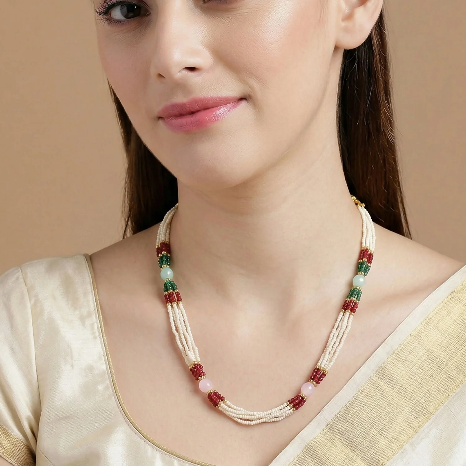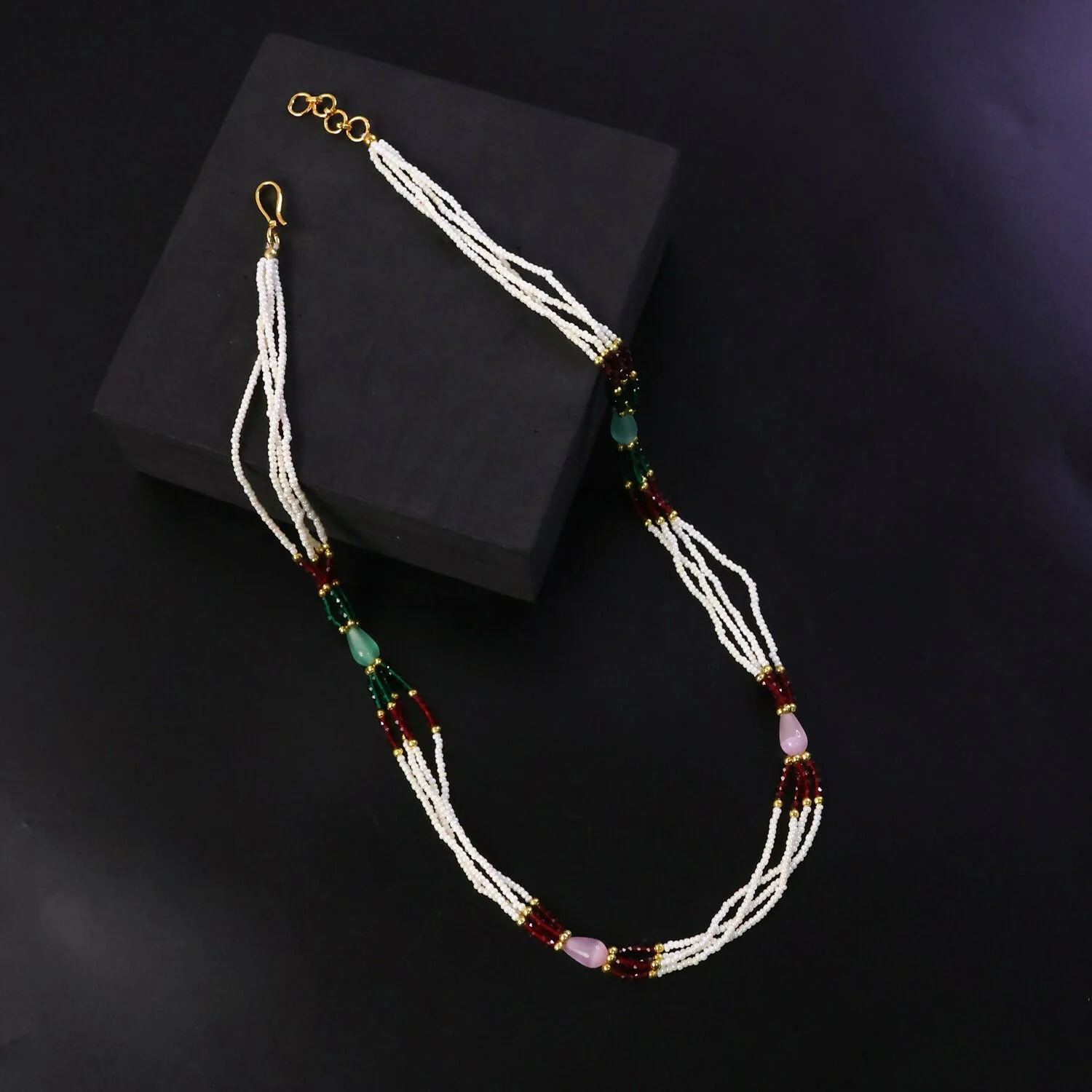 Be the first to review Elegant Multi-Layer Pearl Beaded Necklace with Red, Green & Pastel Stone Accents!