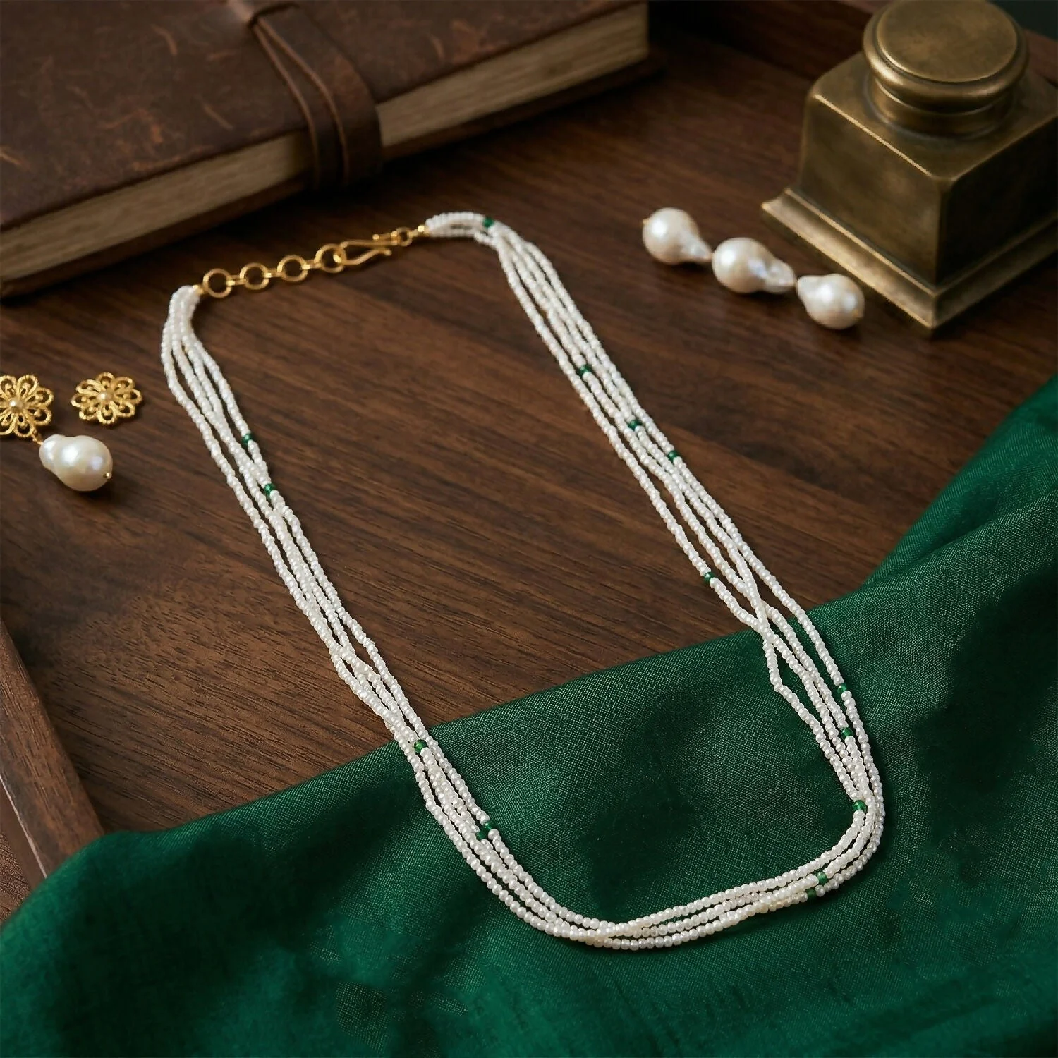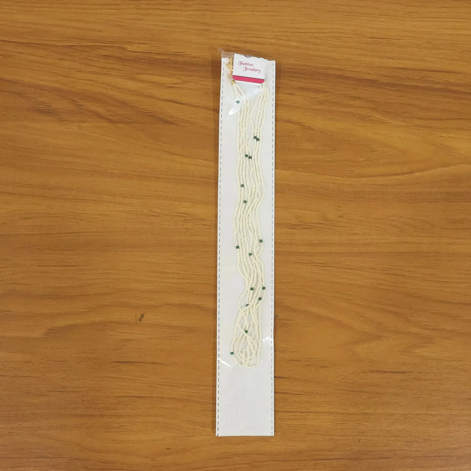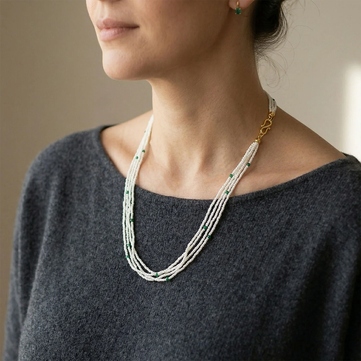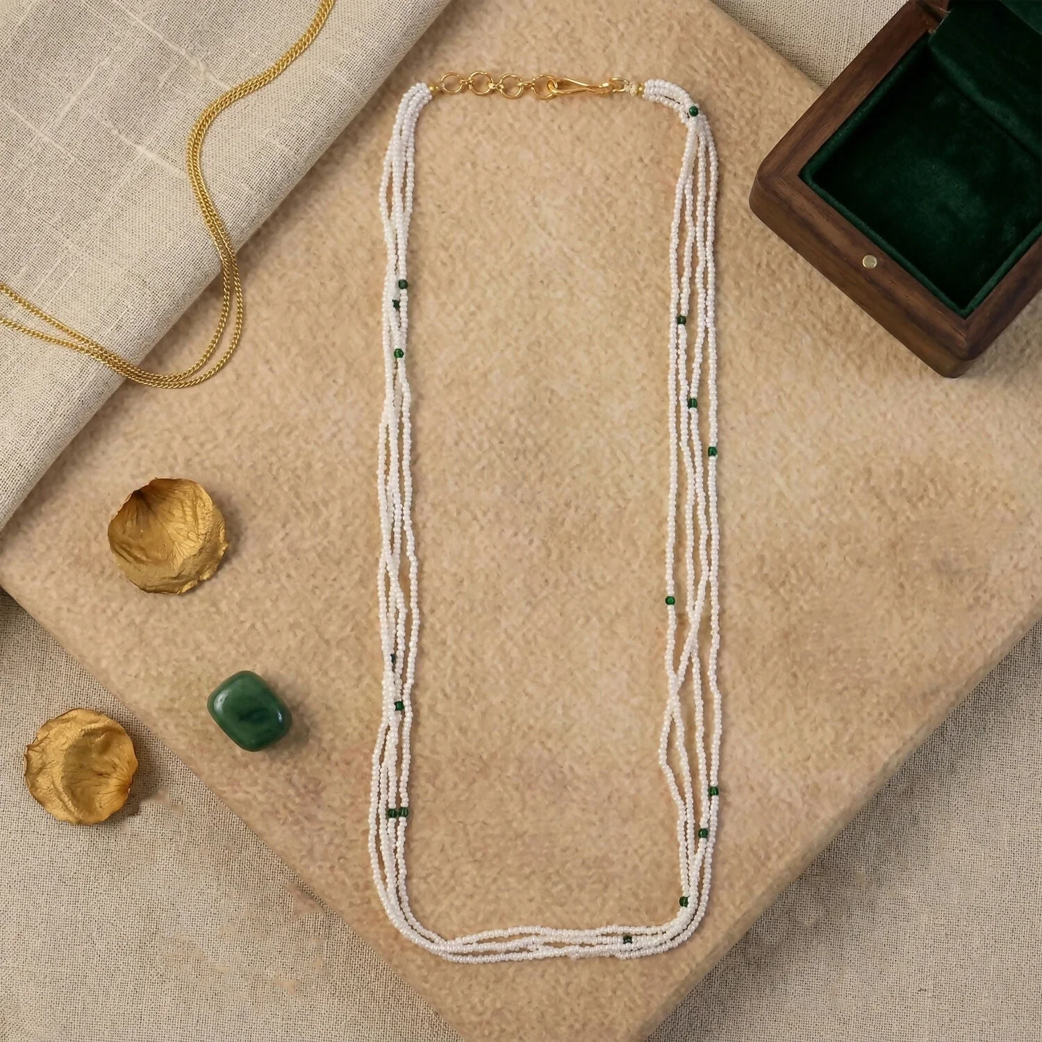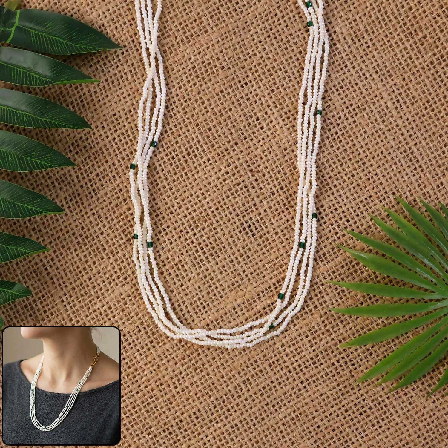 Be the first to review Elegant Multi Layer White Beaded Mala with Green Accents for Women!