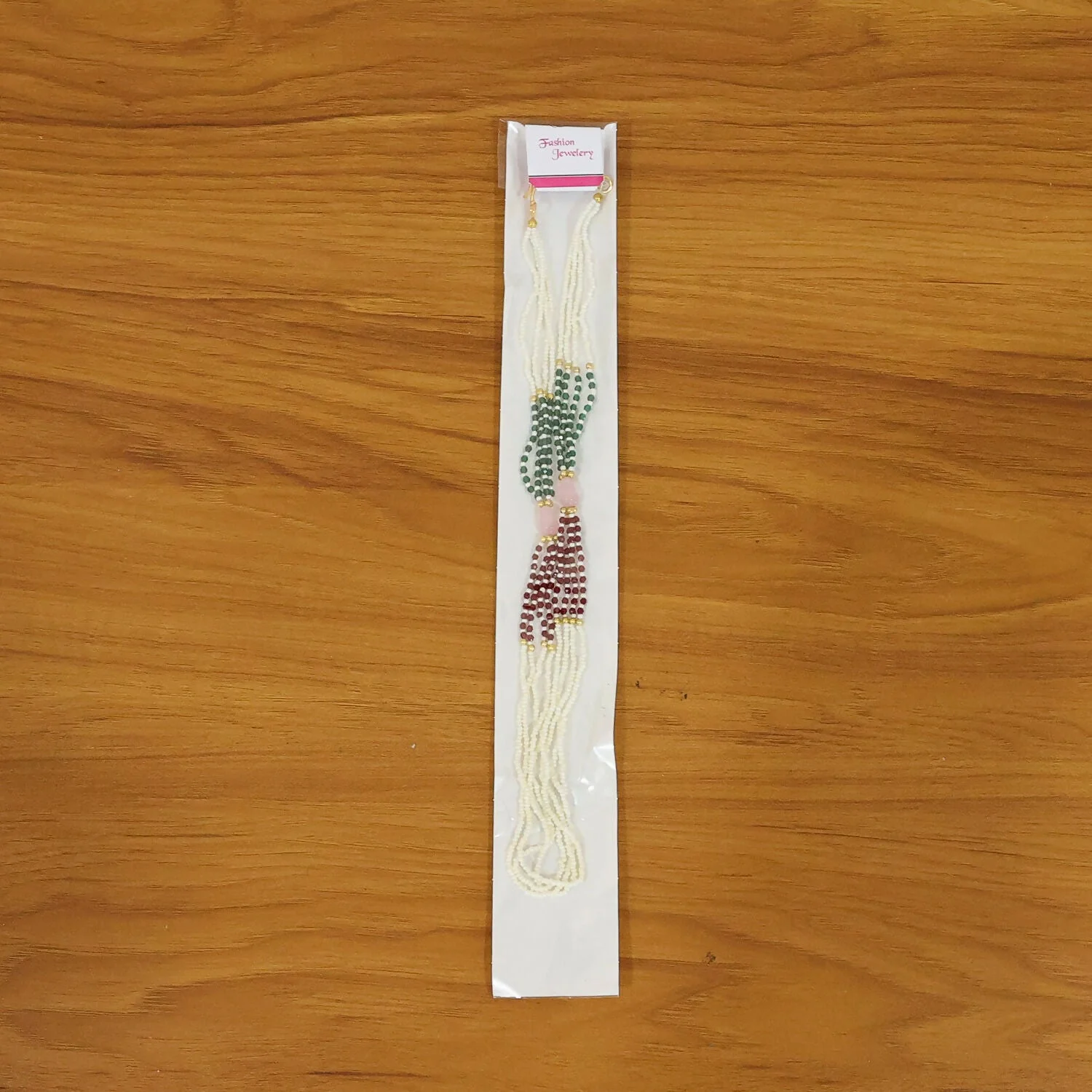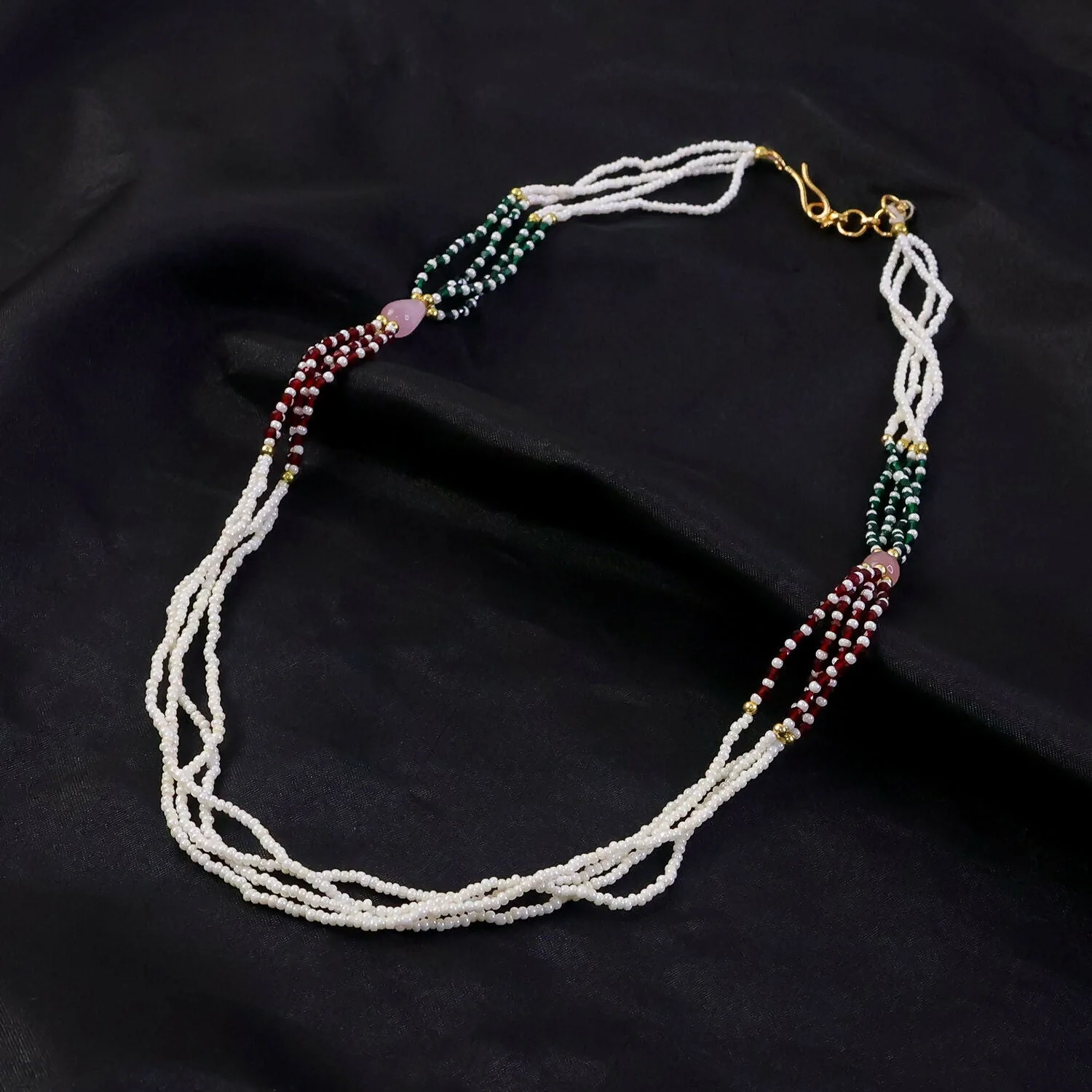 This beautifully crafted multi-strand mala necklace features a unique blend of white beads paired with rich red and deep green accents, creating a vibrant yet elegant look. The layered twisted design at the bottom adds a stylish flow and enhances its overall appeal. Golden highlights and soft-toned centerpiece beads bring a refined traditional touch, making it ideal for festive and ethnic wear. Lightweight and comfortable, it sits gracefully around the neckline while adding depth to any outfit. A perfect choice to elevate sarees, kurtis, and special occasion ensembles with a classy finish.