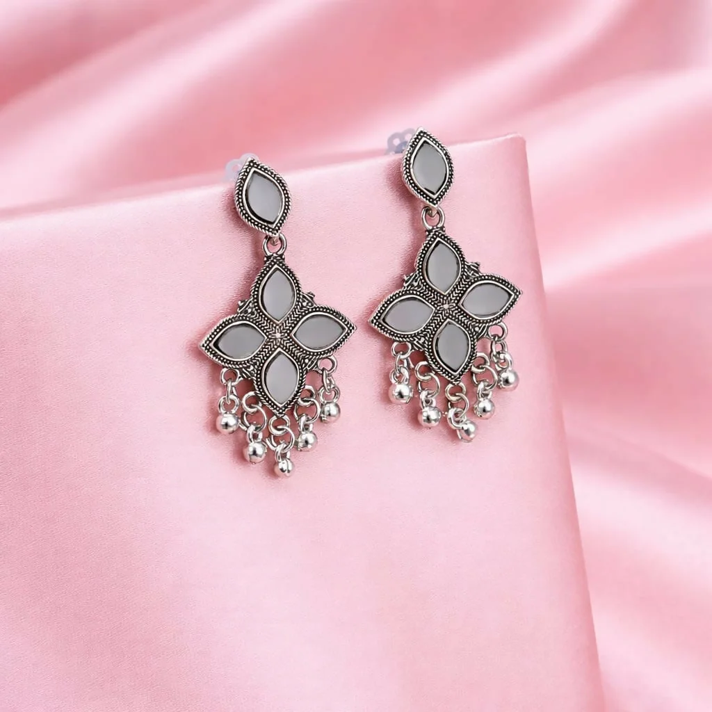Enhance your ethnic charm with these elegant oxidised silver earrings featuring a beautiful white stone floral pattern. The delicate dangling silver beads add a graceful movement, making them perfect for both festive and everyday wear.