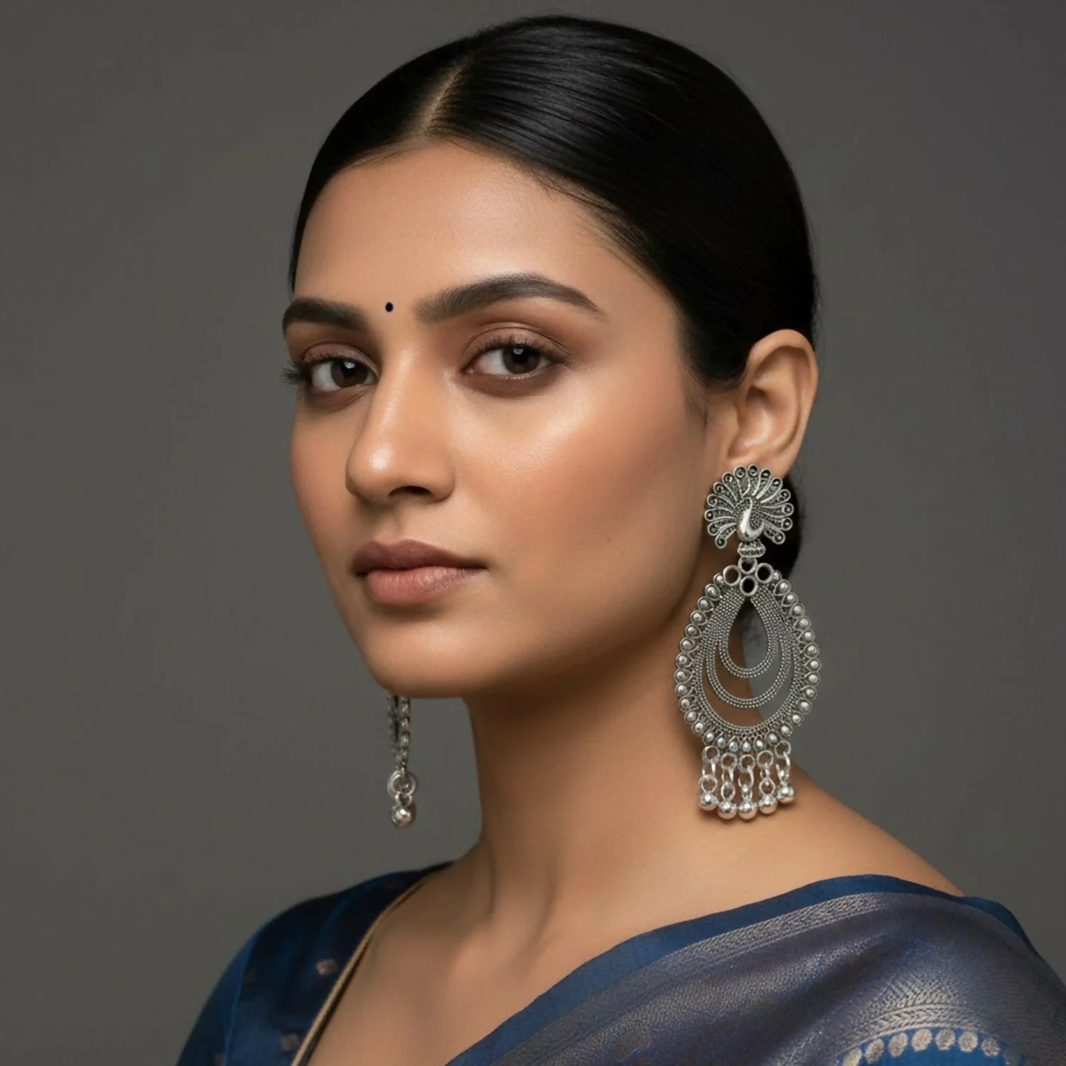 Be the first to review Elegant Peacock Inspired Silver Finish Jhumka Earings!