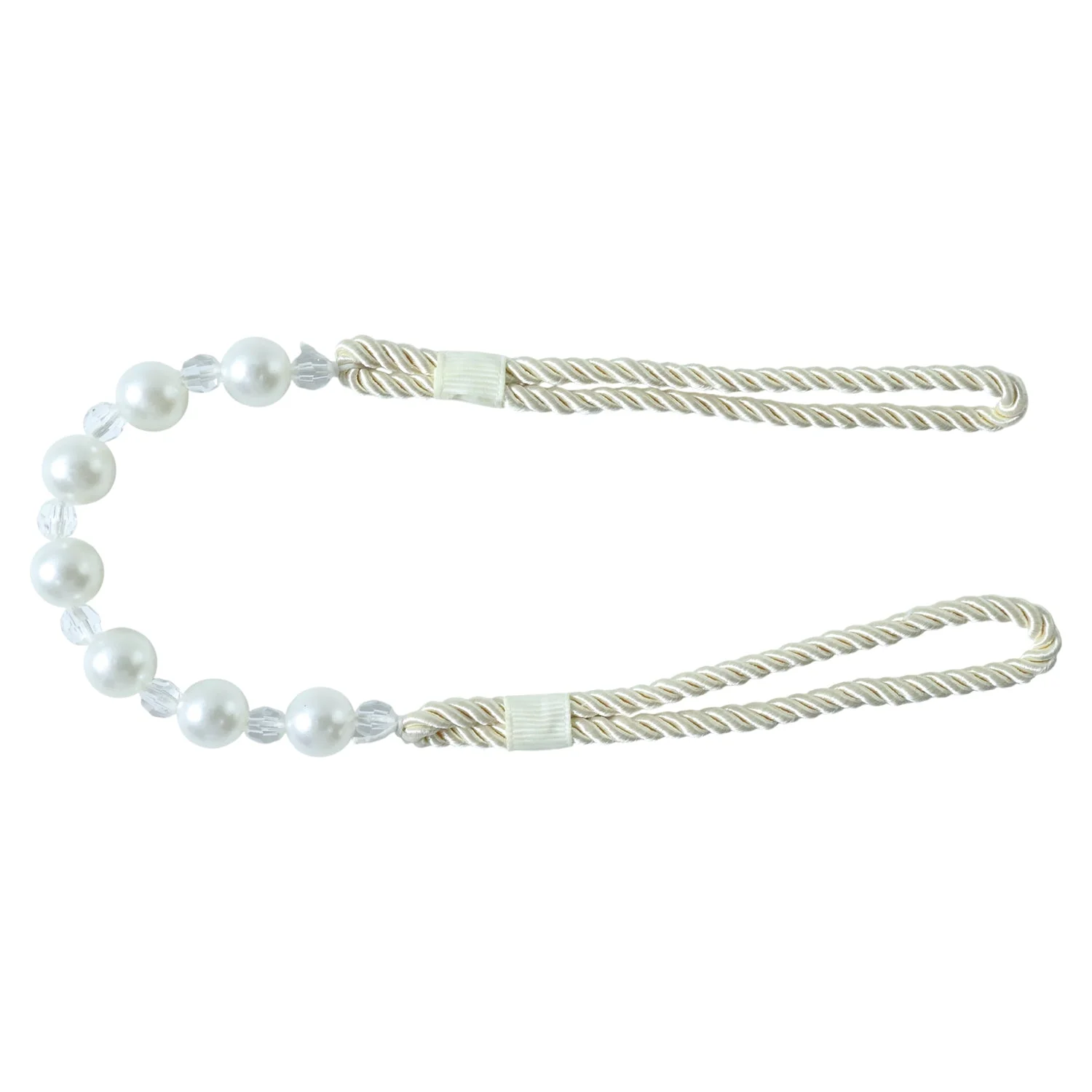 Enhance your window décor with this elegant pearl beaded curtain tieback designed to add a soft, luxurious finish to any interior setting. Featuring a beautifully twisted rope body combined with glossy pearl-style beads and subtle crystal accents, this curtain holder blends classic charm with modern simplicity. The flexible loop design allows easy wrapping around curtains without the need for drilling, hooks, or permanent fixtures. Ideal for holding curtains neatly while allowing natural light to flow into your space, this decorative tieback elevates both everyday home décor and special interior arrangements. Its refined appearance makes it suitable for a wide range of curtain styles, from sheer to decorative drapes.