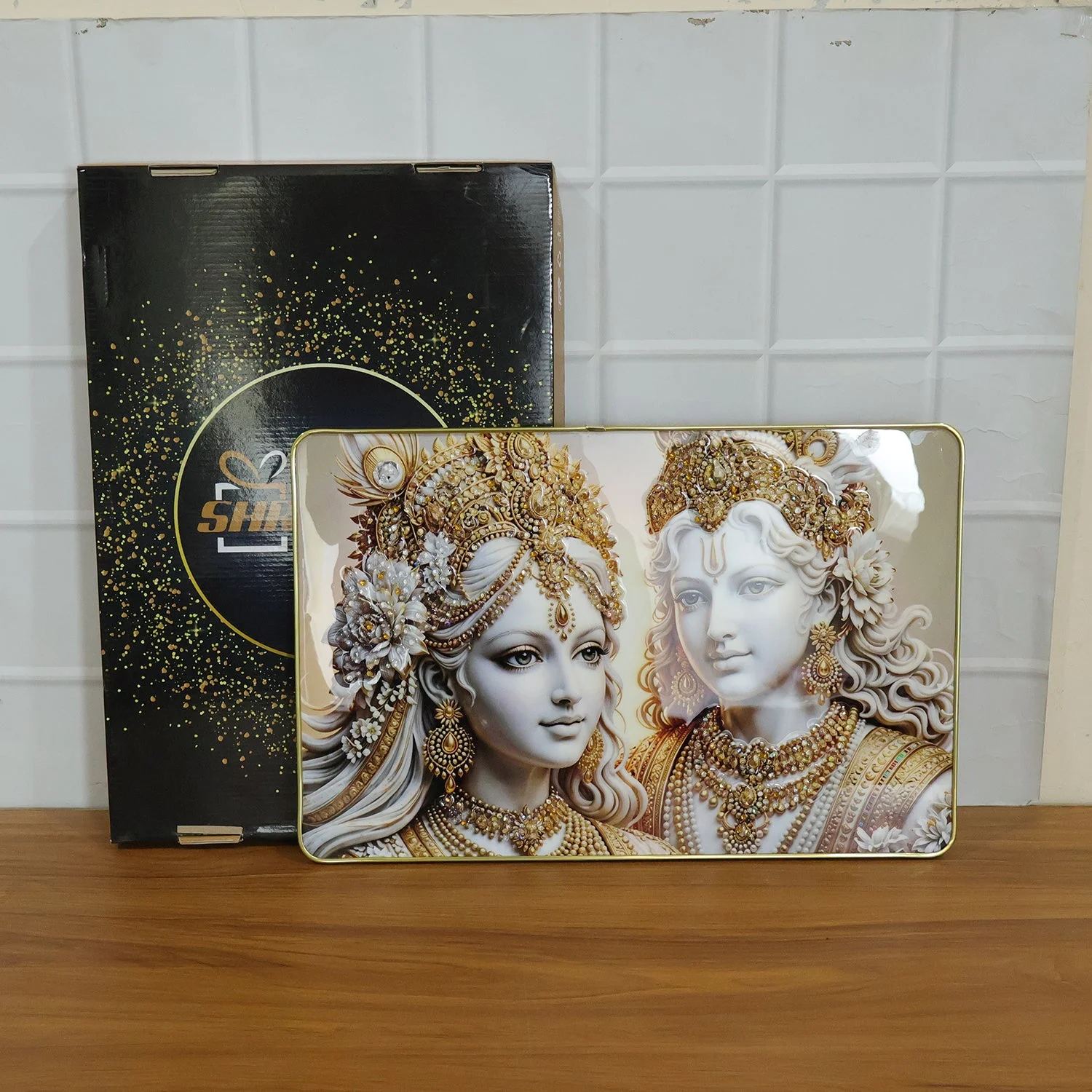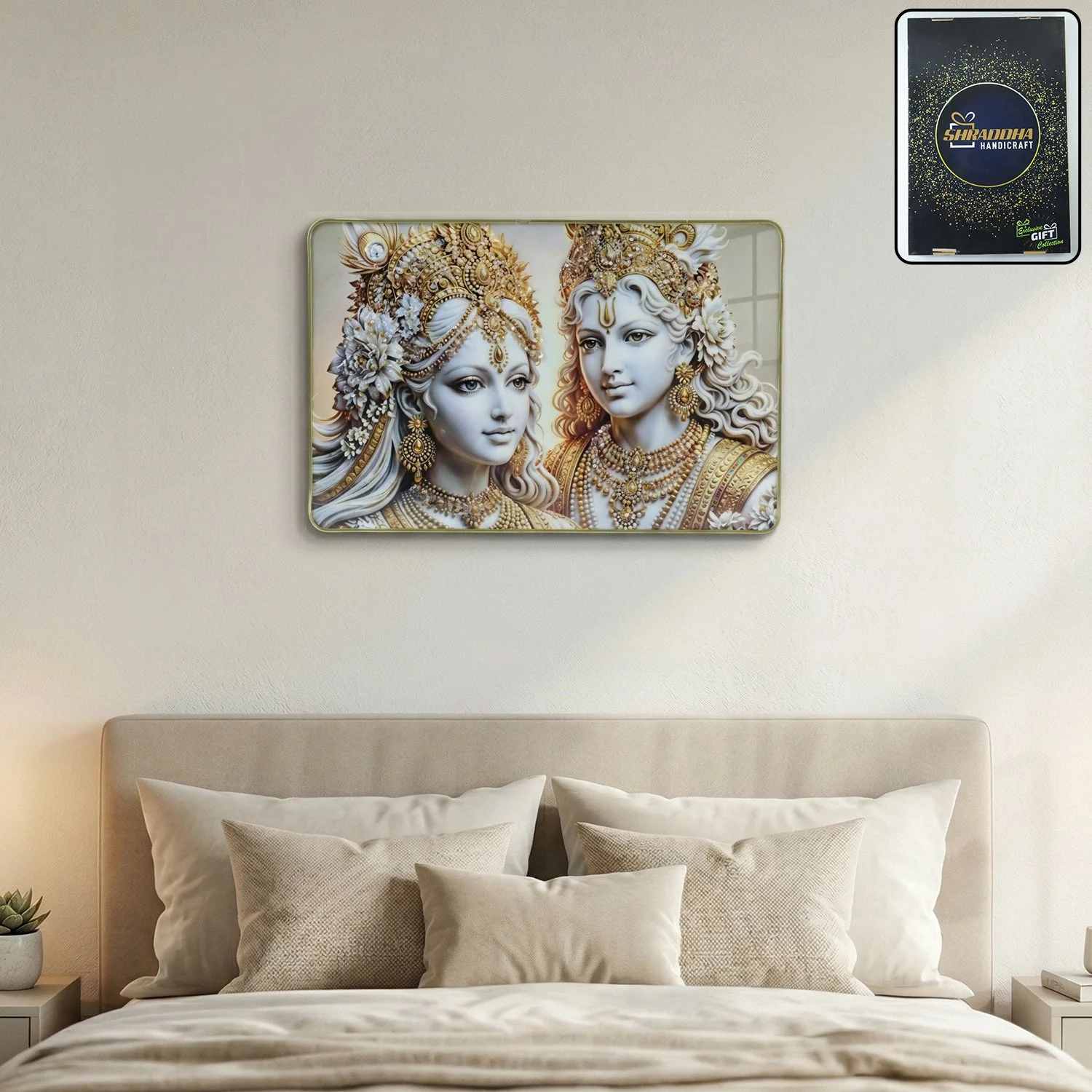 Perfect for festive occasions or housewarming events, this premium religious wall art doubles as an elegant Radha Krishna photo frame for gifting. Its detailed craftsmanship and radiant finish enhance spiritual vibes while complementing modern interiors, making it a valuable addition to your décor.