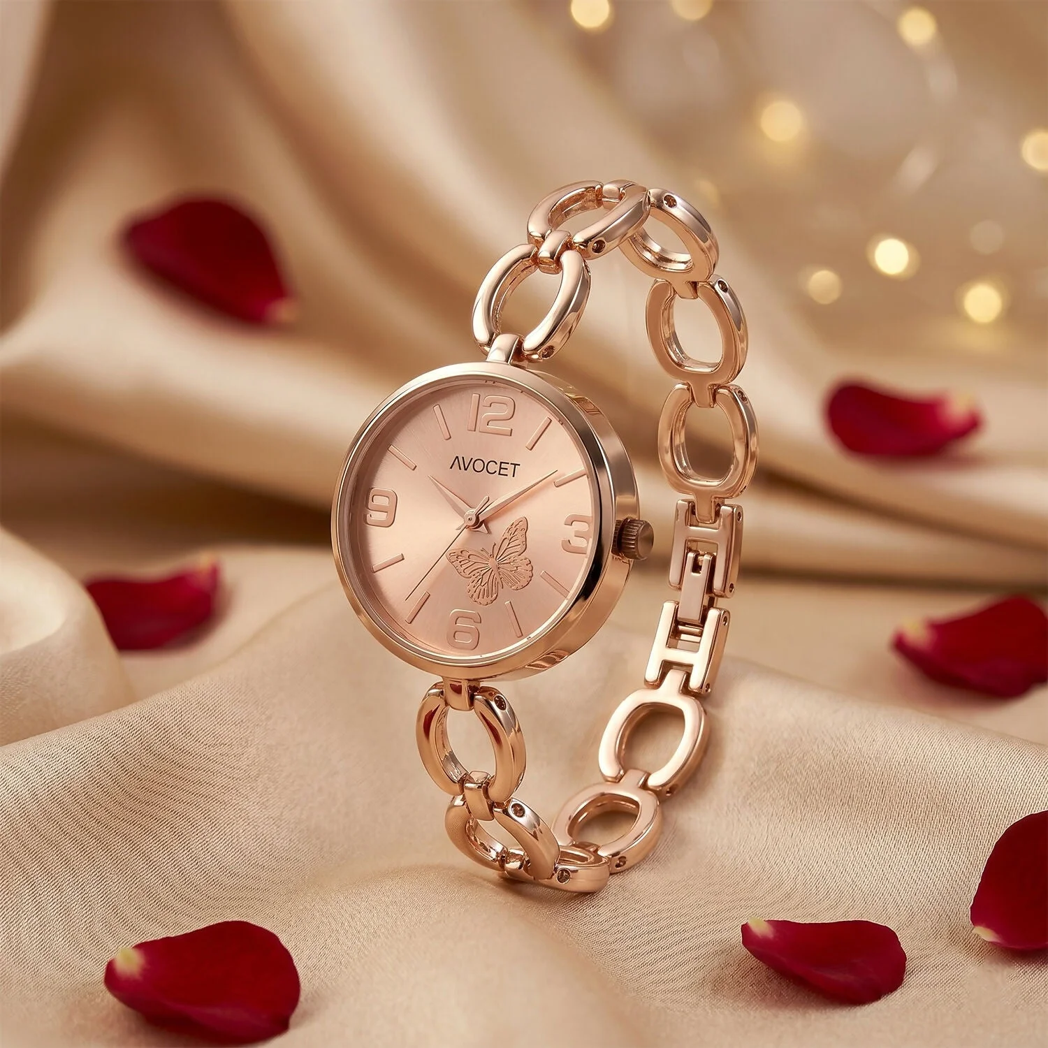 Upgrade your everyday style with this elegant women’s wrist watch featuring a stunning rose gold finish and a unique butterfly dial design. Crafted with a stylish chain-link strap, this watch offers a perfect blend of fashion and functionality. The sleek round dial with bold numerals enhances readability while adding a modern touch to your look. Its lightweight and comfortable design makes it suitable for all-day wear, whether for casual outings, office wear, or special occasions. A perfect accessory to complement any outfit and add a graceful charm to your wrist.
