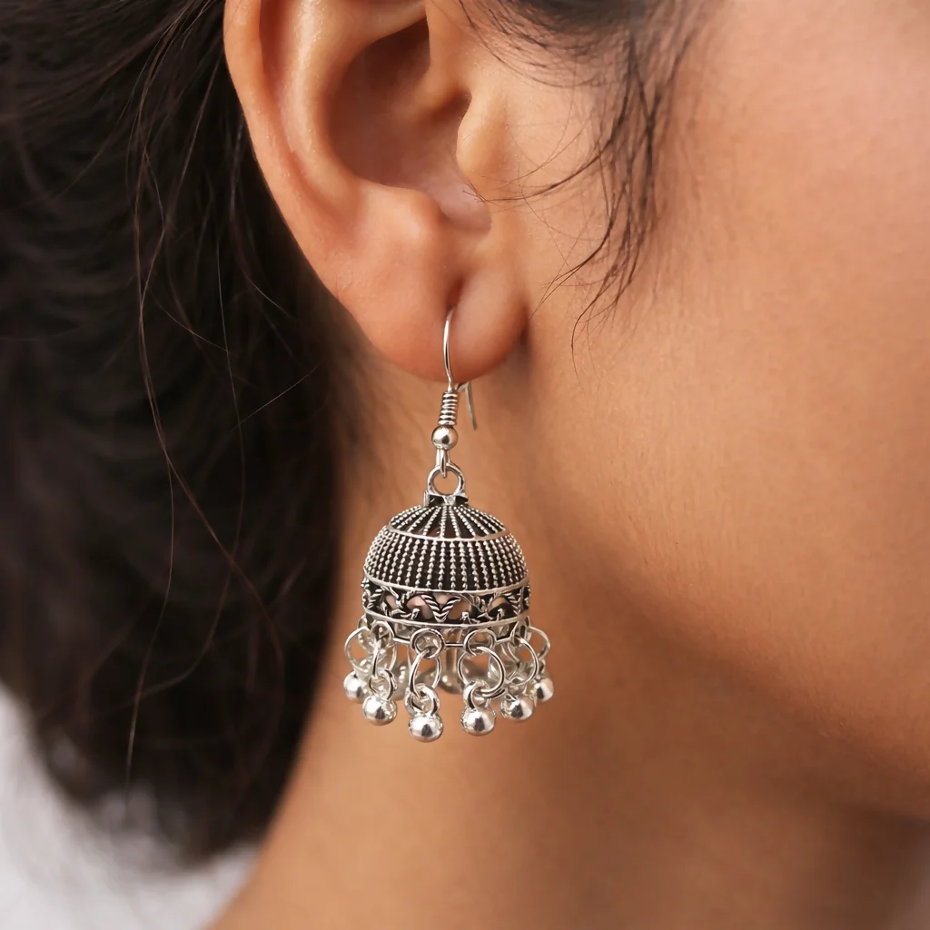 This elegant pair of oxidised silver jhumka earrings showcases intricate traditional detailing with a beautifully textured dome design and dangling ghungroo beads. Finished with a classic oxidised look, these earrings offer a rich ethnic appeal while remaining lightweight and comfortable for daily or long wear. Perfect for festivals, weddings, pooja ceremonies, and casual ethnic styling, this timeless design pairs effortlessly with sarees, kurtis, lehengas, and Indo-western outfits, making it a versatile addition to any jewellery collection.