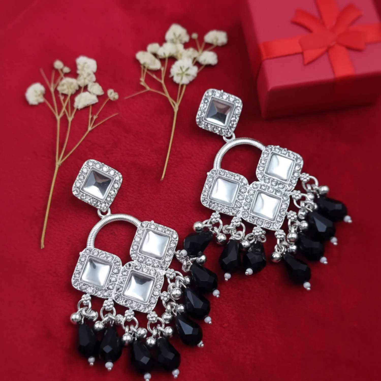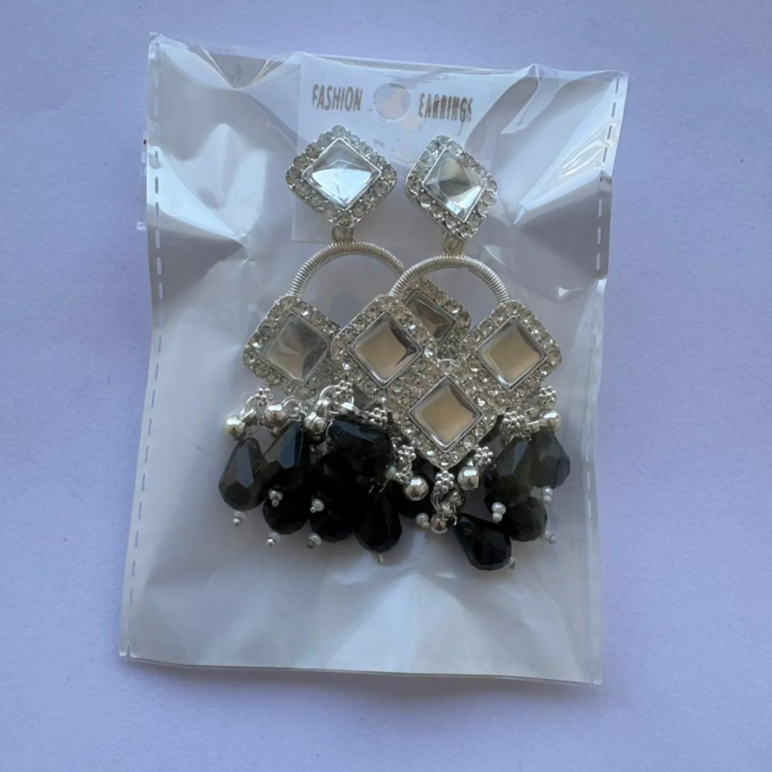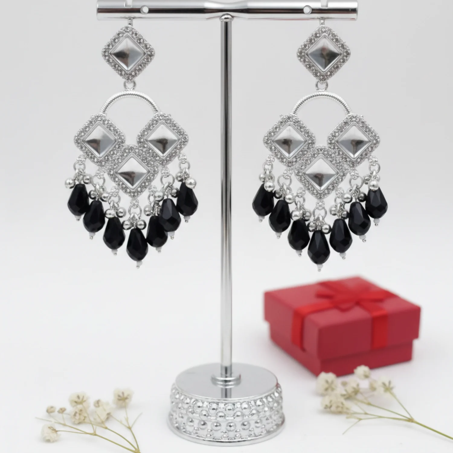 Be the first to review Elegant Silver Plated Chandelier Earrings Featuring Square Crystals and Black Teardrop Beads!