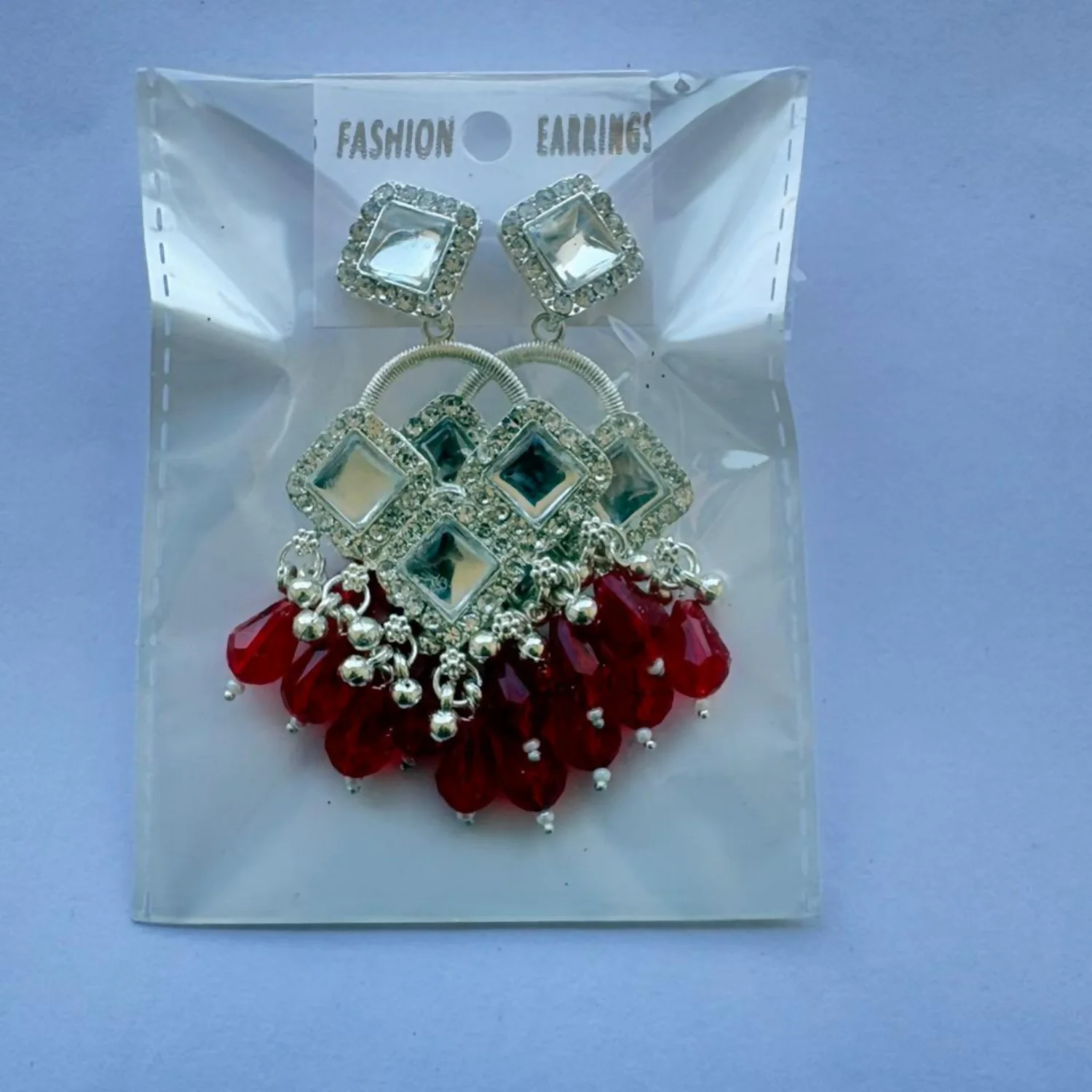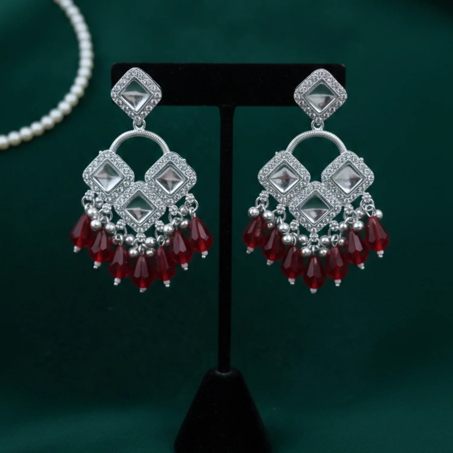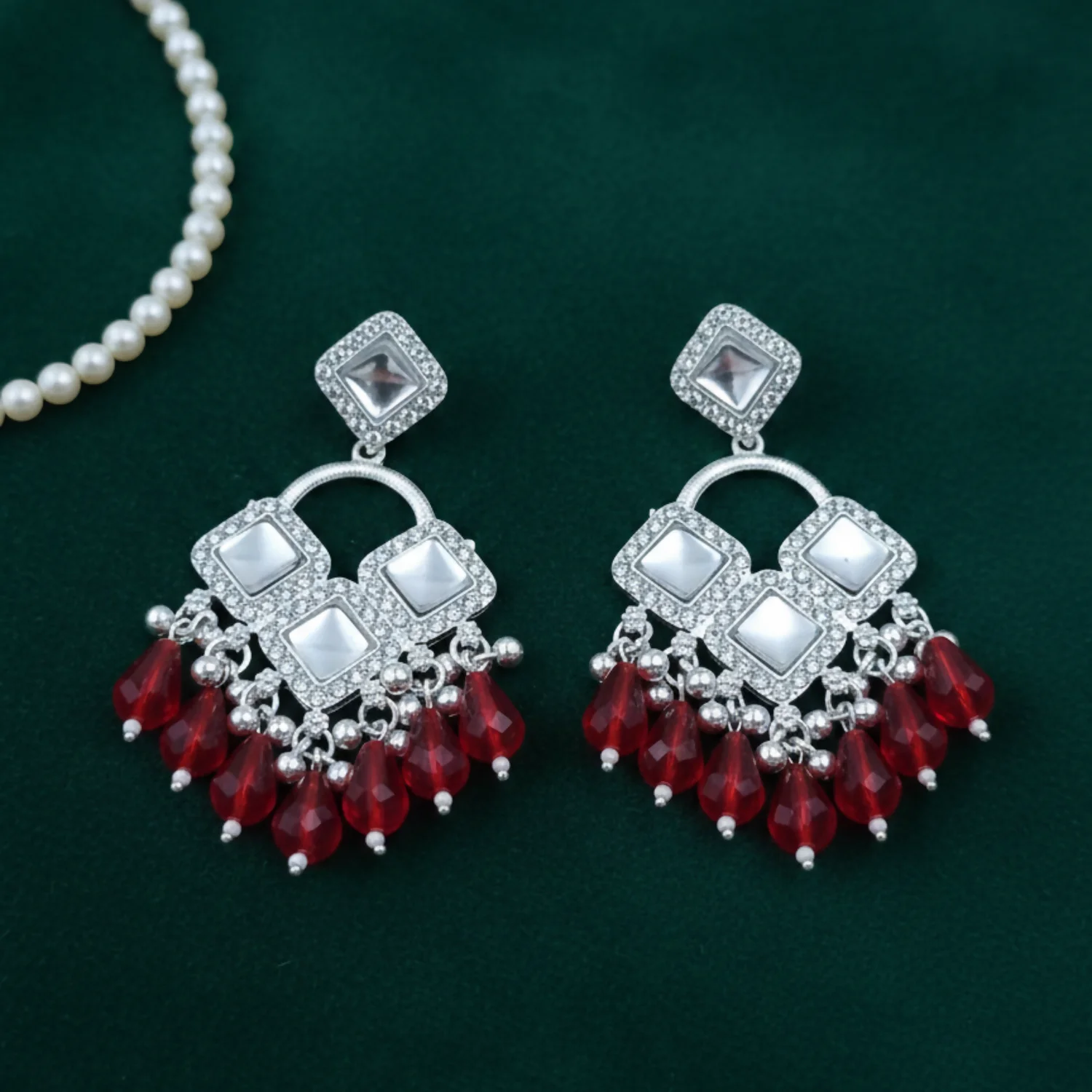 Be the first to review Elegant Silver Plated Chandelier Earrings Featuring Square Crystals and Red Teardrop Beads!