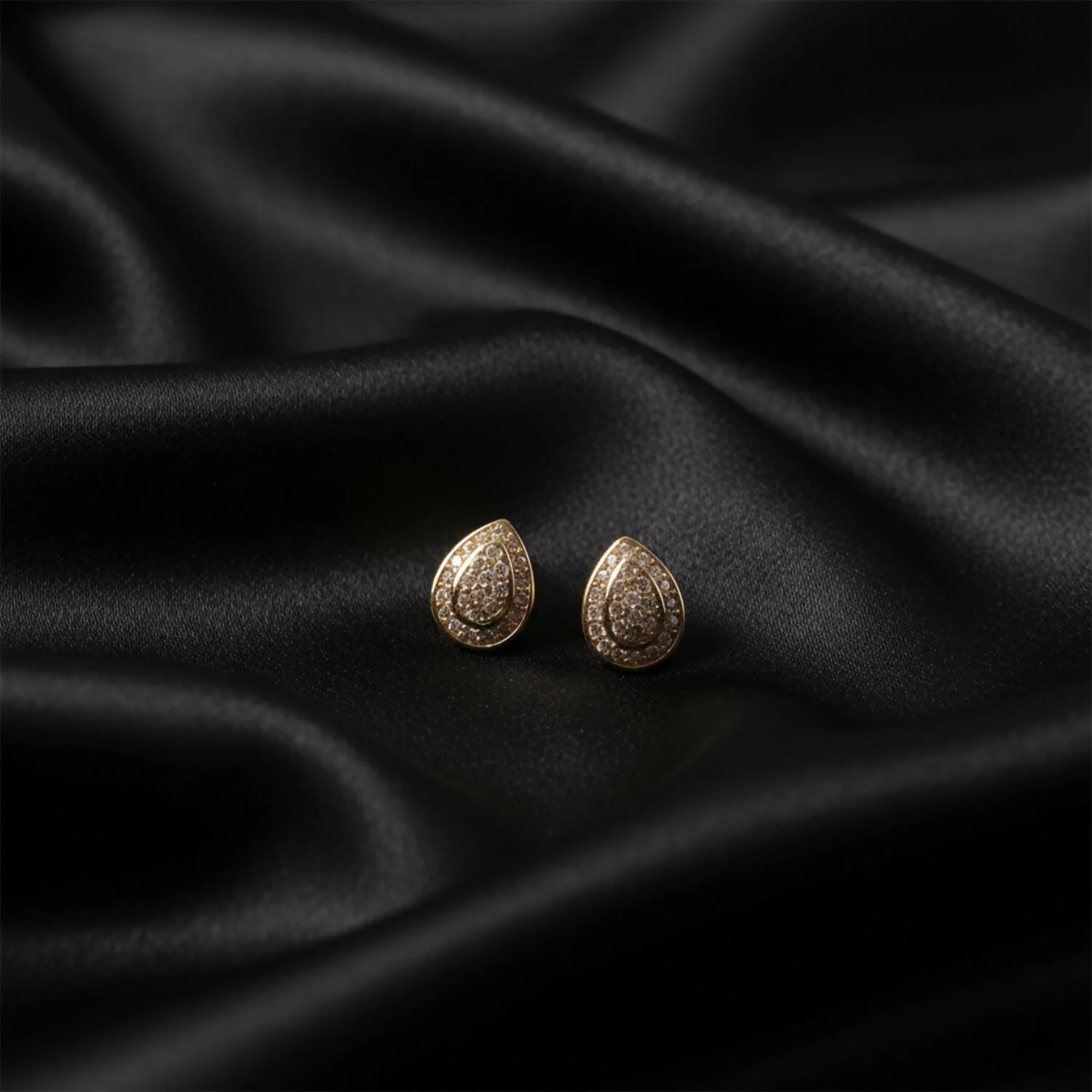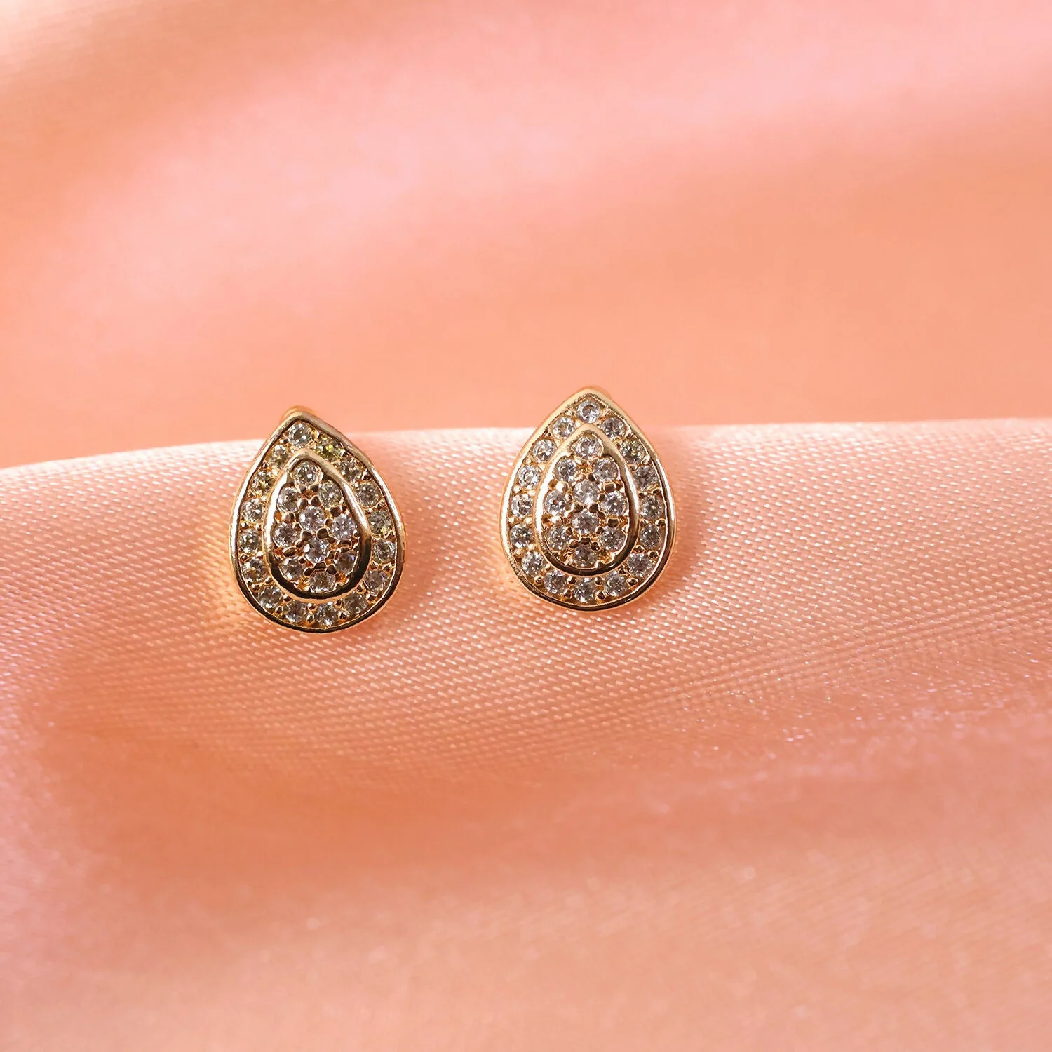 These elegant teardrop stud earrings are designed to add a touch of timeless sparkle to any look. Crafted with a polished gold-tone finish, each earring features a graceful double-teardrop design adorned with shimmering pavé-set stones that catch the light beautifully. Compact yet eye-catching, they sit comfortably on the ear, making them perfect for both everyday wear and special occasions. A refined choice for gifting or elevating your own jewelry collection with classic sophistication.