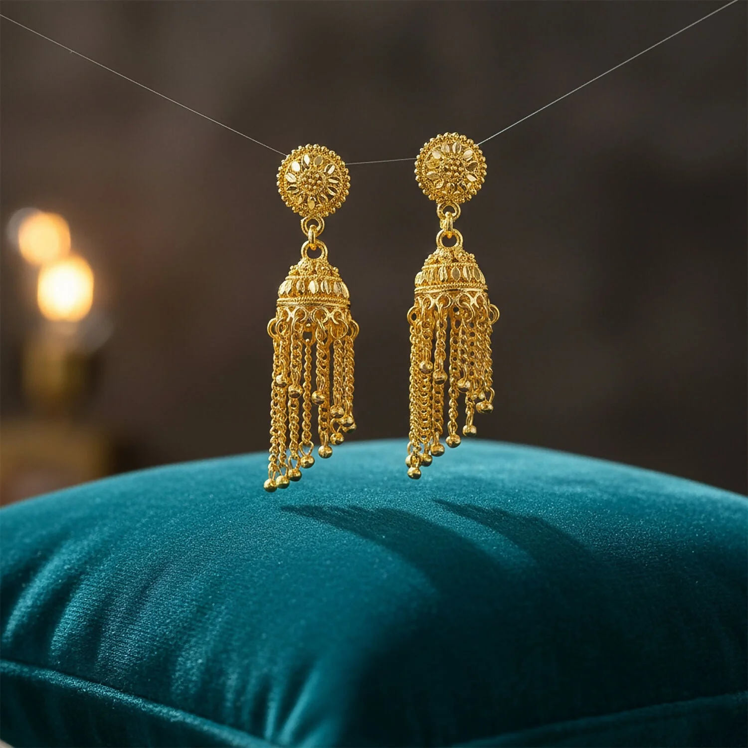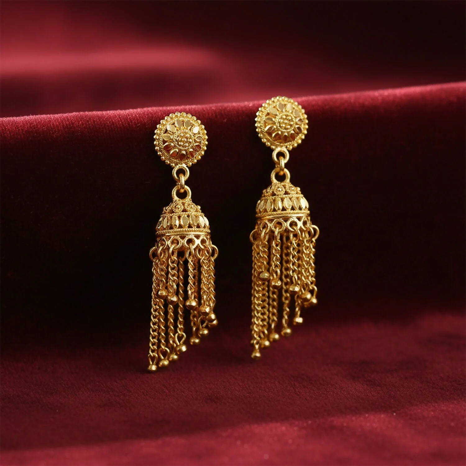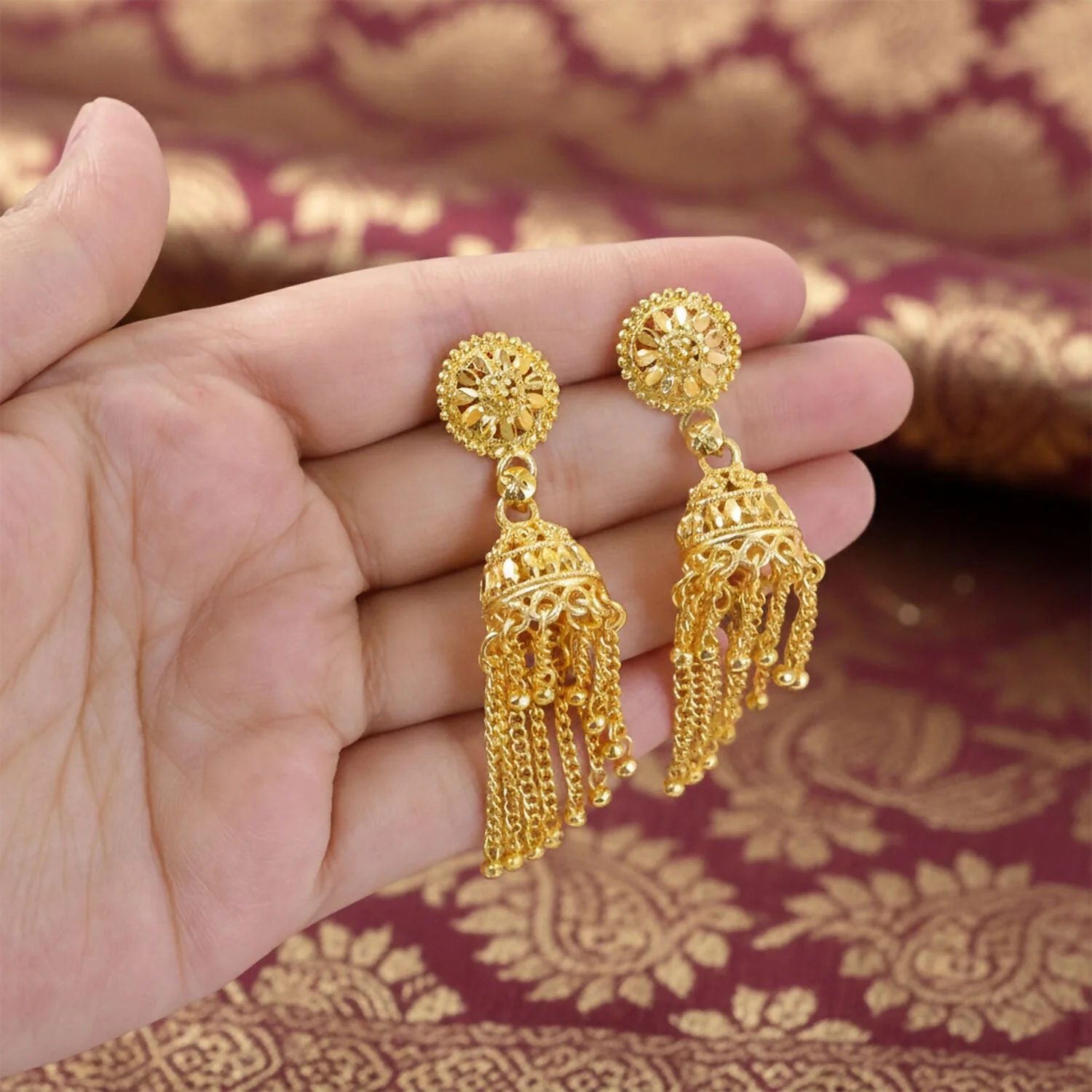 Enhance your traditional look with these beautifully designed gold tone jhumka earrings that bring timeless elegance to any outfit. Featuring an intricate floral stud design with a classic dome-shaped jhumka and delicate hanging chains, these earrings create a graceful and eye-catching appearance. The detailed craftsmanship gives them a rich and festive feel, making them perfect for weddings, celebrations, and cultural occasions. Their traditional style pairs beautifully with sarees, lehengas, salwar suits, and other ethnic outfits. Lightweight and comfortable to wear, these earrings add charm and sophistication to both festive and casual traditional looks.