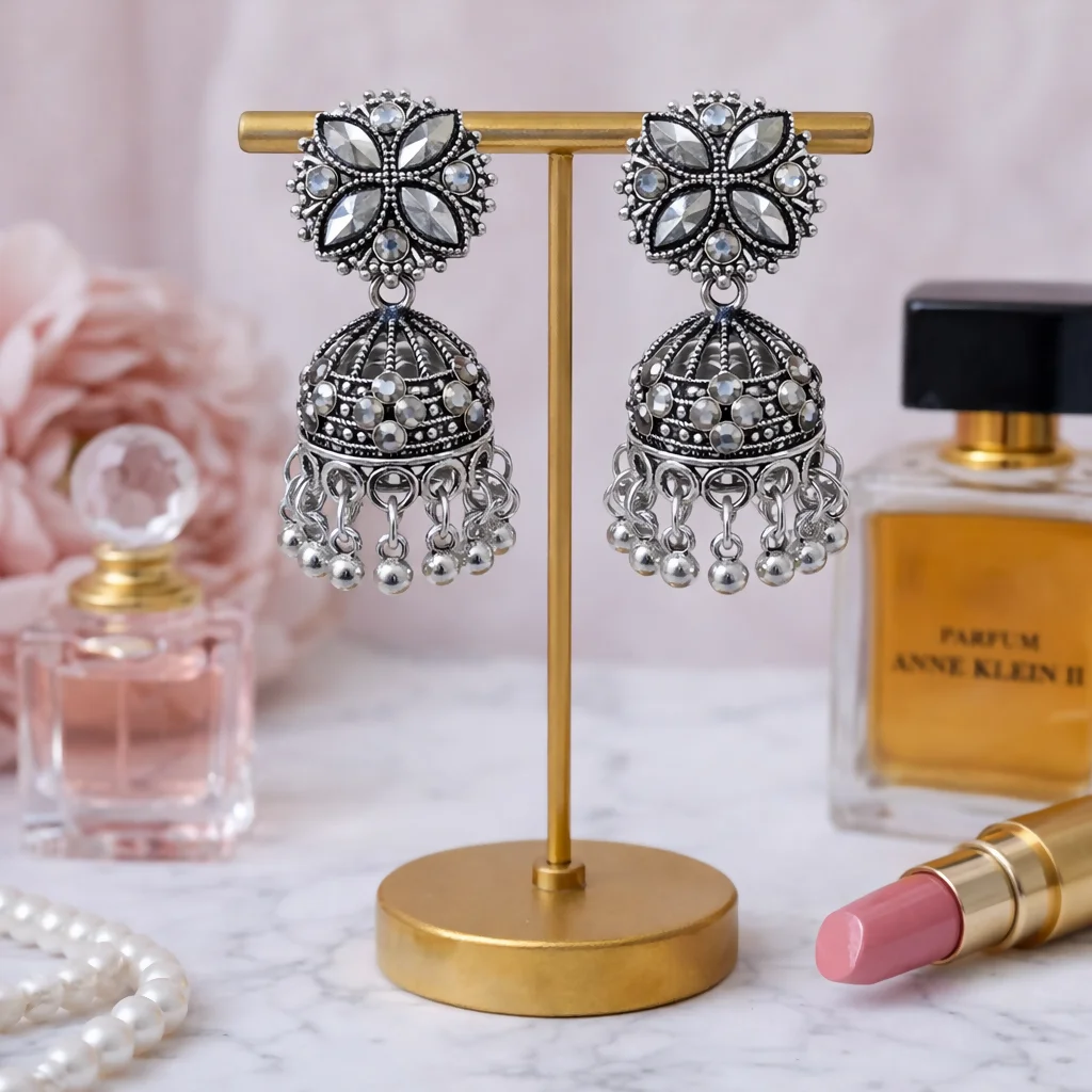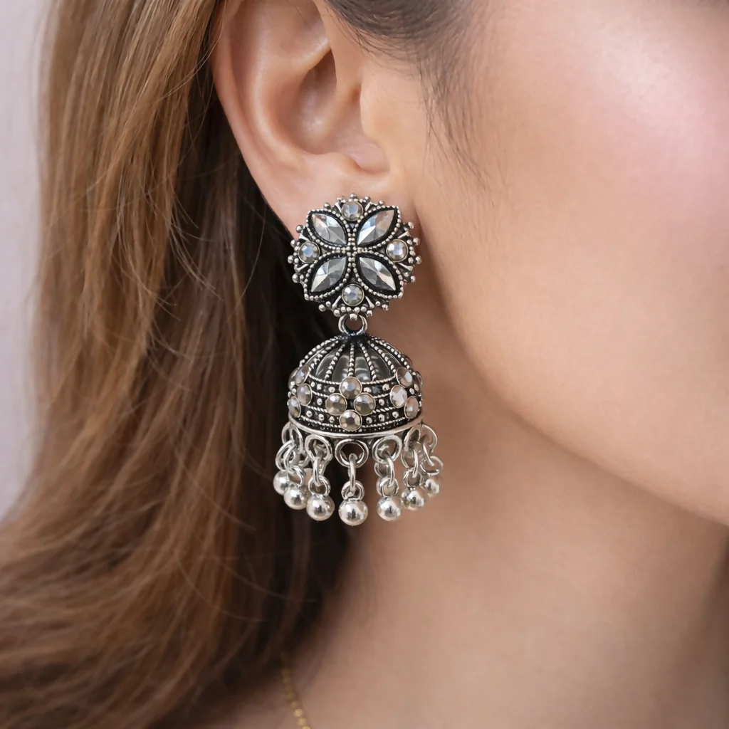 These stunning oxidized silver jhumka earrings showcase a beautifully detailed floral stud design adorned with sparkling stone accents. The intricately crafted dome-shaped drop features textured patterns and embedded stones, giving it a rich and antique appeal. Delicate silver bead danglers at the bottom add graceful movement and enhance the traditional charm. Perfect for festive occasions, weddings, and ethnic outfits, these earrings offer a bold yet elegant statement look. A timeless piece for those who love classic oxidized jewellery with a modern touch. ✨
